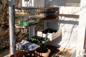 Das Gewächshaus ist ausgebucht 🙂 Tomaten, Auberginen, Artischocken, Paprika, Staudensellerie, Salate, Kohl und natürlich allerlei Blumen fühlen sich offenbar sehr wohl hier! Licht gibt es reichlich und tagsüber steigen die Temperaturen auf heute z.B.  18°C. Abends decken wir die zarten Pflänzchen ab, denn rasch wird es wieder kalt im Häuschen!