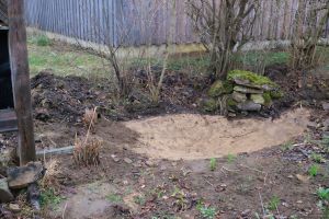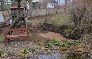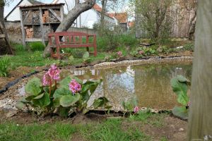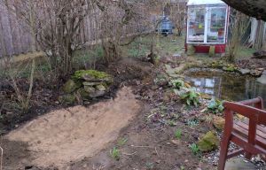 An der Grundstücksgrenze ist ein kleiner Folienteich, der selten mit Wasser, sondern mit Schlamm, altem Laub und Fallobst gefüllt war. Hier soll eine neue Pflanzzone entstehen, die einerseits etwas Wind abhält und andererseits zum Wassergarten passt. Den Miscanthus sinensis ‚Große Fontäne‘ aus dem Staudenbeet teilten wir jetzt und setzten ihn rechts vom Insektenhotel ein. Er ist wüchsig und wird auch gut in den Hintergrund passen. Hinter der Bank hatten wir kleine Taglilien gepflanzt, die wir aus dem Foerster Garten im letzten Jahr mitnehmen durften. Jetzt werden wir sie ausgraben, um die neue Beetfläche zu bearbeiten. Danach planen wir die neue Bepflanzung!