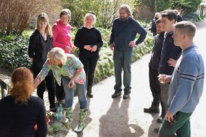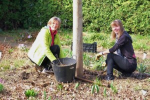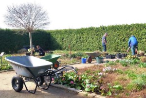Jetzt war es endlich wieder soweit! Wie schon in den vergangenen Jahren trafen wir uns am letzten Wochenende zur freundlichen Hilfsaktion in Potsdam-Bornim. Diesmal wurde mein Lieblingsbeet, das Herbstbeet bearbeitet. Großes Chinaschilf (Miscanthus) wurden herausgenommen, geteilt und wieder eingesetzt, Bestände von verschiedenen Chrysanthemen, Astern und  Ceratostigma plumbaginoides reduziert und Bergenien und Heuchera verjüngt.  Diesmal konnten wir den Mitgestalter des Herbstbeetes Christian Meyer kennen lernen, der uns anhand seines Planes zeigte, was genau gemacht werden sollte.  Foersters Gartenfee, Kristina Scheller, stand uns natürlich wie immer zur Seite und half tüchtig mit!