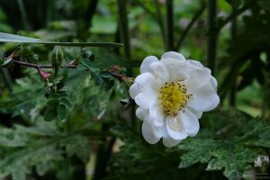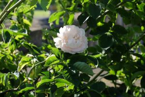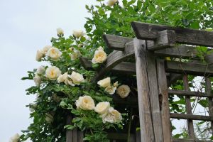 Die Uetersener Klosterrose war ein Fehlkauf – sie ist zwar schön und gesund, gehört aber an eine Wand oder ein Spalier. Für den Bogen hätte ich eine weichtriebige nehmen sollen 🙂 Man lernt ja nie aus!