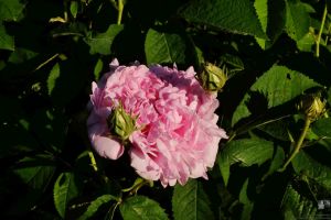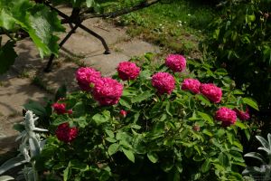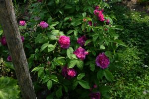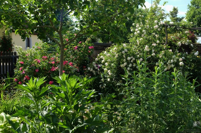 Um den Sitzplatz gepflanzt: Rose de Resht, Gussenstädter Désiree, Aimable Amie…..