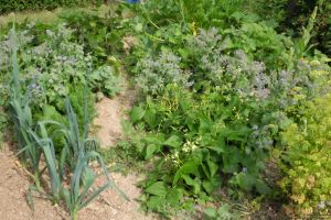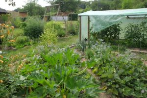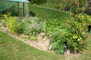 Auf der rechten Seite  der Sitzplatzes entdecken wir das große Gemüsebeet und das selbstgebaute Tomatenhaus. Weiter unten wieder ein Beet mit Herbstastern, Iris, Akeleien und Herbstanemonen. Barbara erzählt, dass hier im Frühjahr die Zwiebelblüher ihren Auftritt haben.