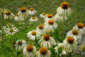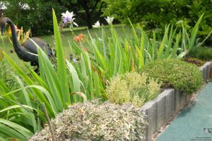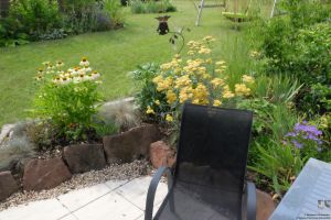 Das gesamte Gartengrundstück ist mit einer dunklen Ligusterhecke umgeben.  Auf halber Höhe ist ein Sitzplatz angelegt, umgeben von Beeten und Pflanzsteinen. Echinacea, Gräser, Achillea, Scabiosa, Taglilien und natürlich Iris ….ein buntes, fröhliches Staudenarrangement, Nahrungsangebot und Spielwiese für die vielen Insekten und Falter!