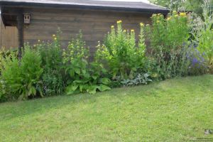 Auf der linken Seite liegt das Gartenhaus, umgeben von einem buntem Band blühender Stauden, wie Brandkraut, Gelbe Flockenblume, Woll-Ziest und Rainfarn.