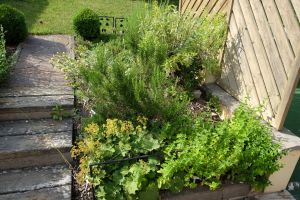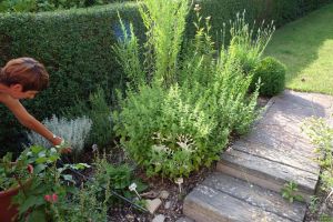 Ihr Zuhause liegt am Hang, also muss man schon einige Außentreppen überwinden, ehe man in die obere Etage von Holger’s Elternhaus kommt. Aber schon wird man mit dem Anblick der vielseitigen und großzügigen Kräuterbeete entschädigt, die Barbara an der seitlichen Treppe angelegt hat. Hier findest Du alles, was Dein Herz oder Kochtopf begehrt…Thymian, Rosmarin, Salbei, Schnittlauch….Frauenmantel, Griechischer Berg-Tee, Heil-Zyst, Zitronenmelisse, Johanniskraut u.v.m. Bei der Gelegenheit: Barbara hat ein Rotöl aus Johanniskraut selbst zubereitet – das hilft unsagbar gut gegen Insektenstiche und bringt sofort Linderung!