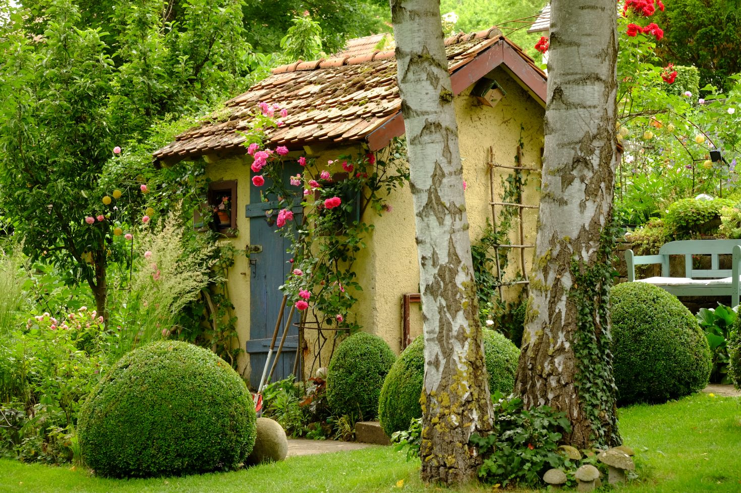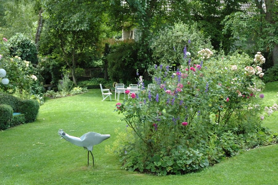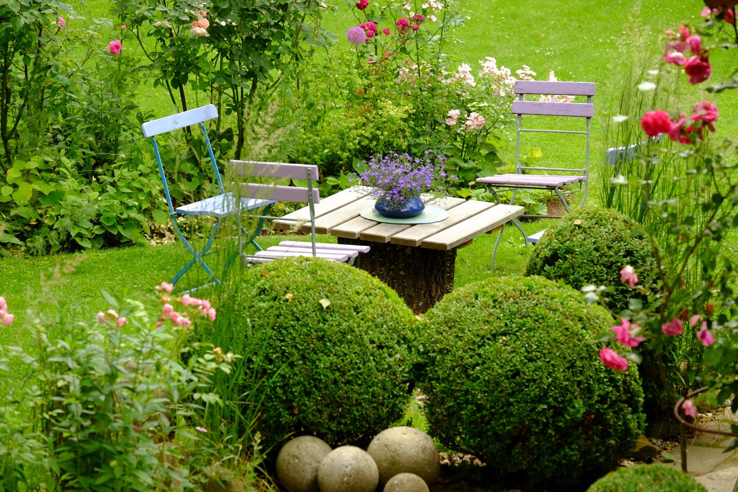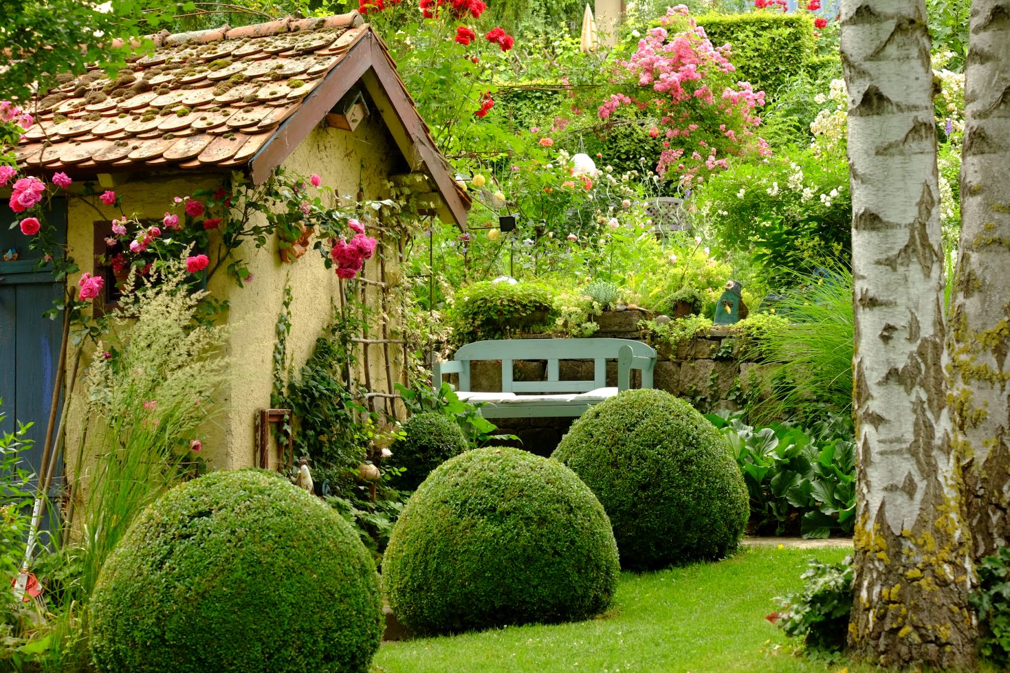 Überall gibt es zwischen schönen Buchskugeln Vogeltränken, Vogelhäuschen, kleine Teiche…