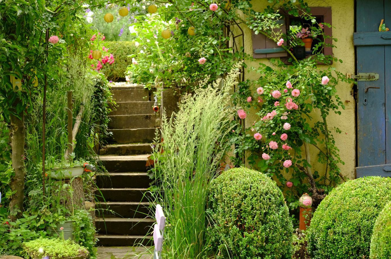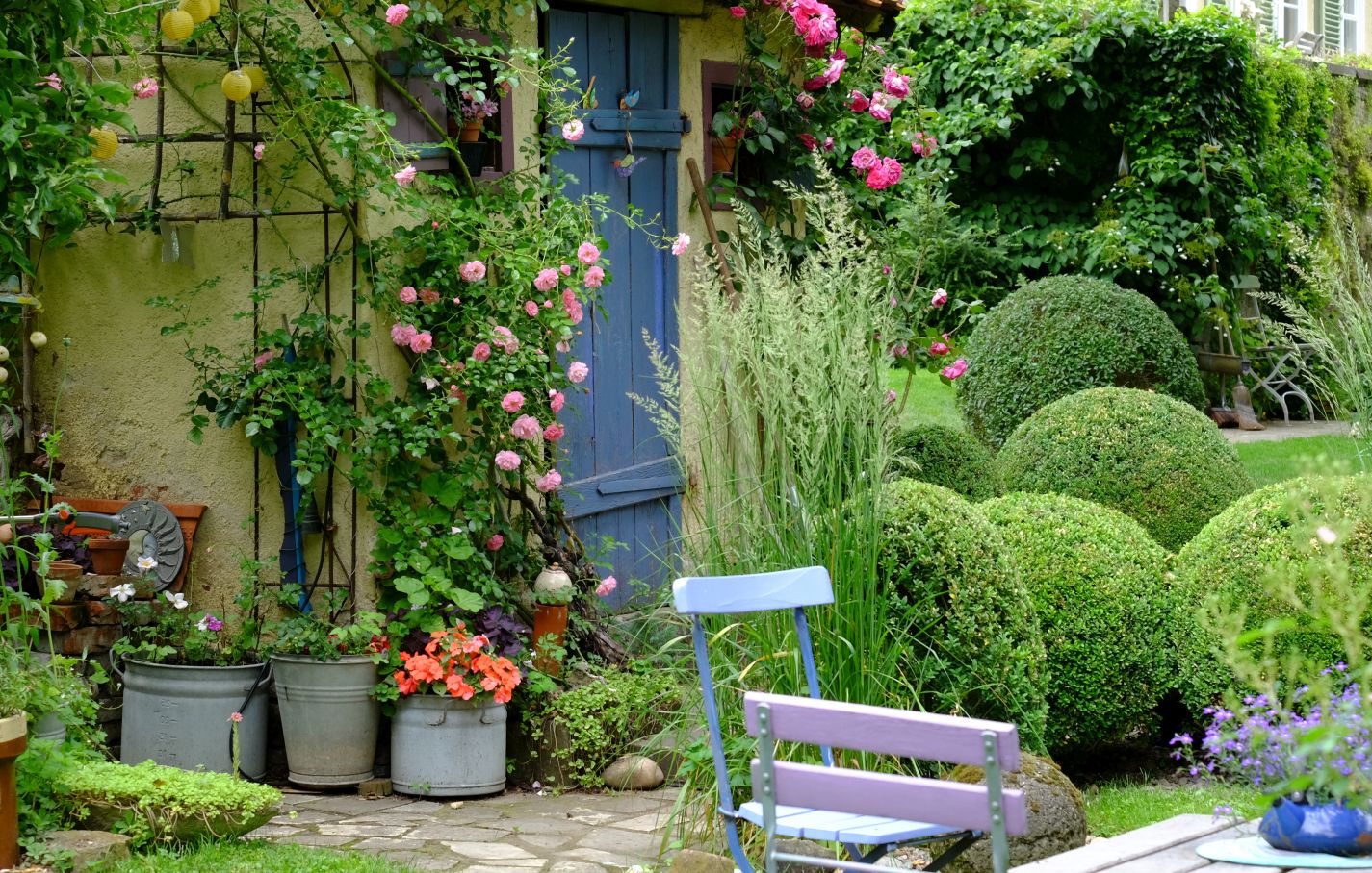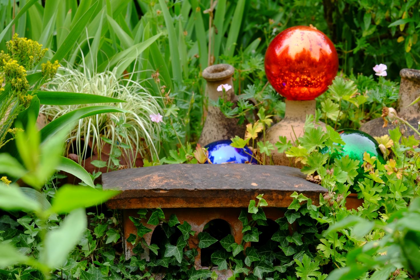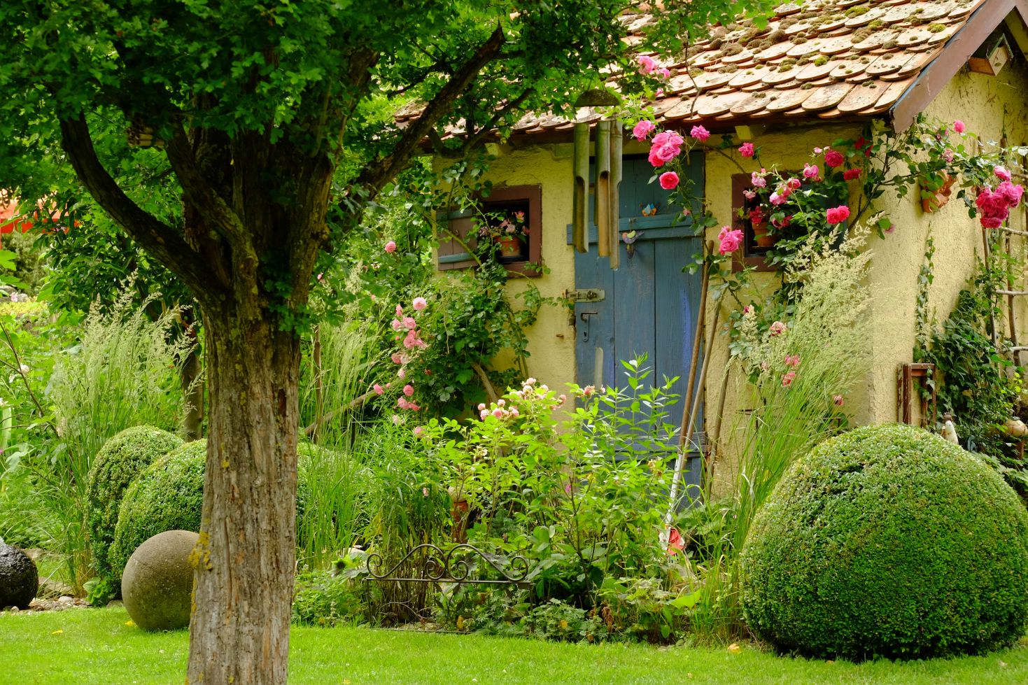 Überall gibt es zwischen schönen Buchskugeln Vogeltränken, Vogelhäuschen, kleine Teiche…
