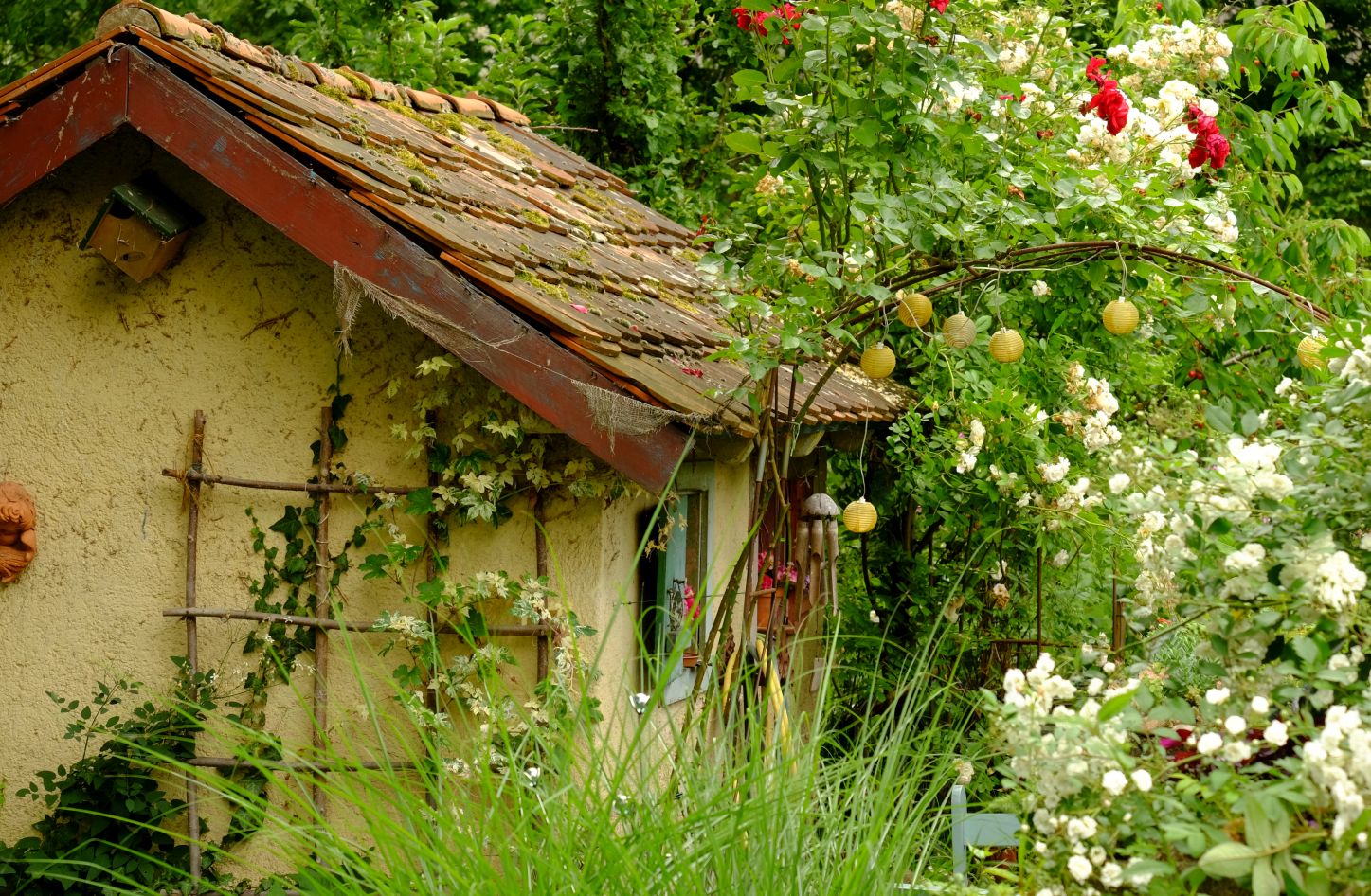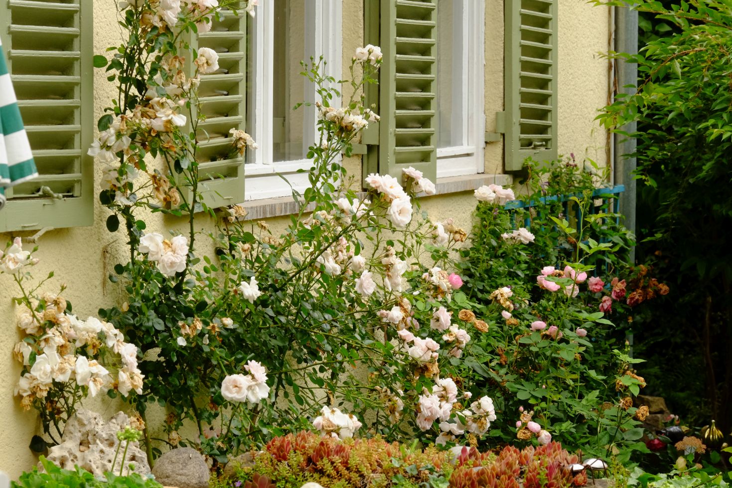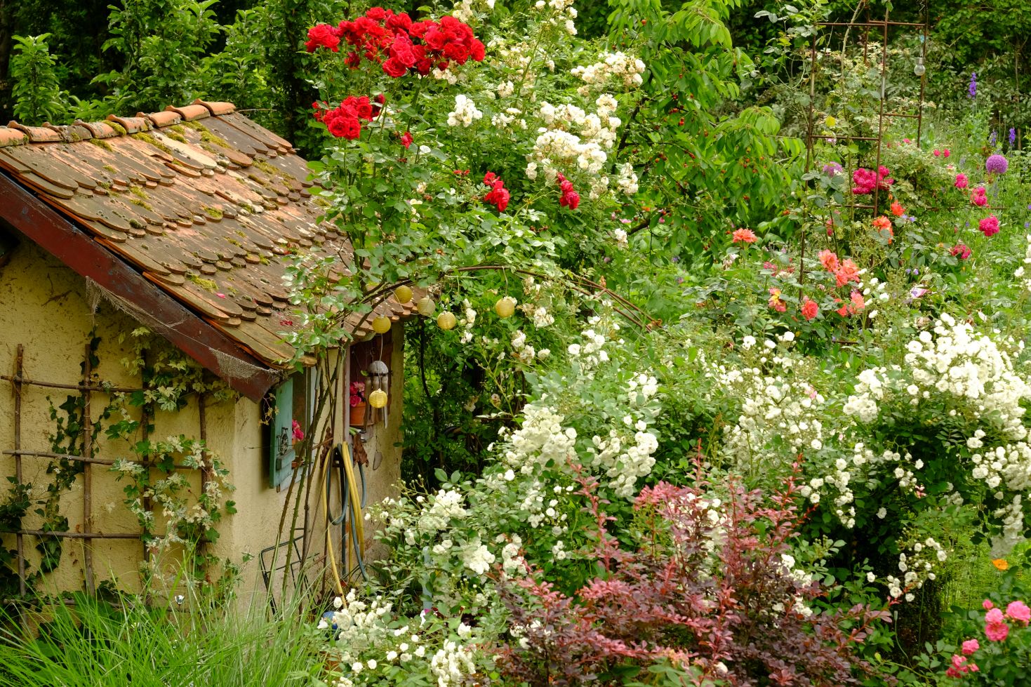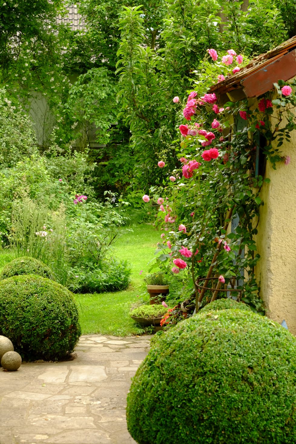 Nach der Hitze der vergangenen Tage freut man sich doppelt, so ein feines Kleinod aufzusuchen. Die sorgsam geschnittenen Gehölze, kleine Farbtupfer durch einige Rosenbüsche, dezentes Weiß der Hortensien zwischen den Blattschmuckstauden – alles das, was einen Schattengarten ausmacht. Gleich am Anfang erkennt man schon weiter hinten das ehemalige Hühnerhäuschen, dahinter der Nutzgarten zwischen vielen Rosen, zweifellos ein Blickfang – das muß man einfach liebhaben…