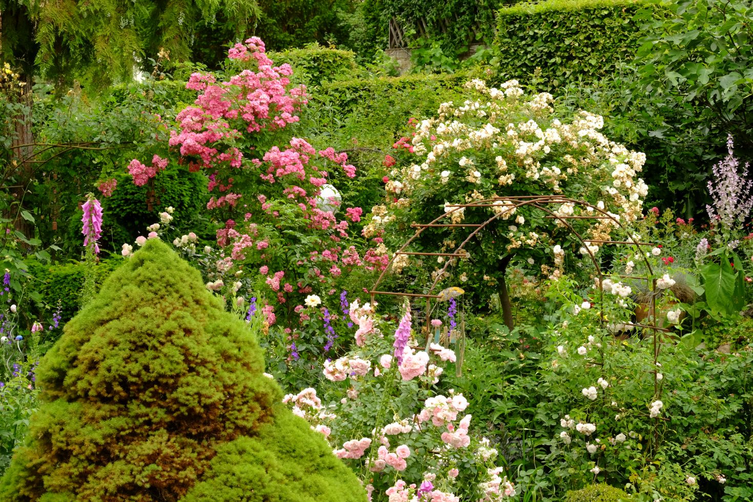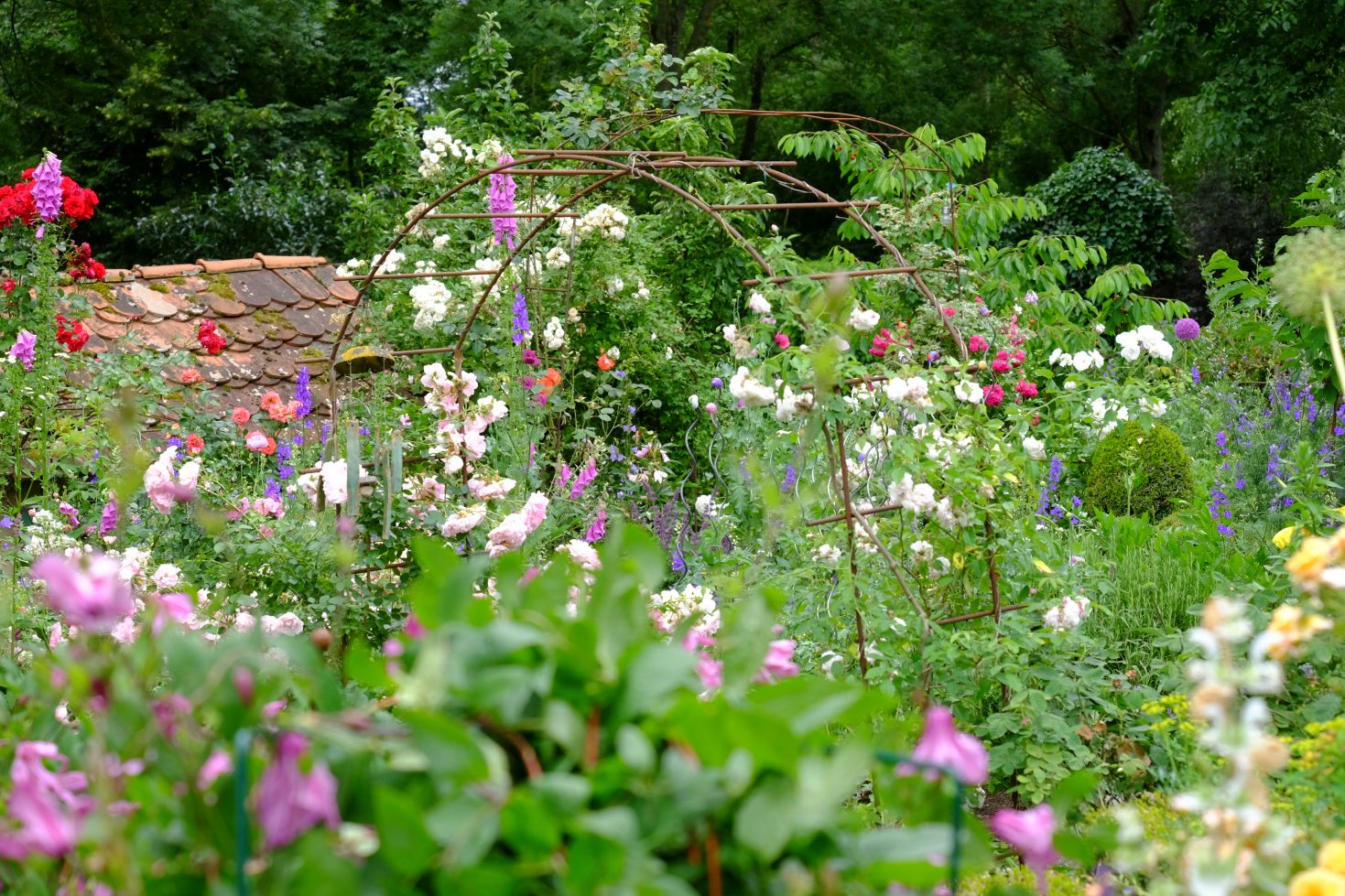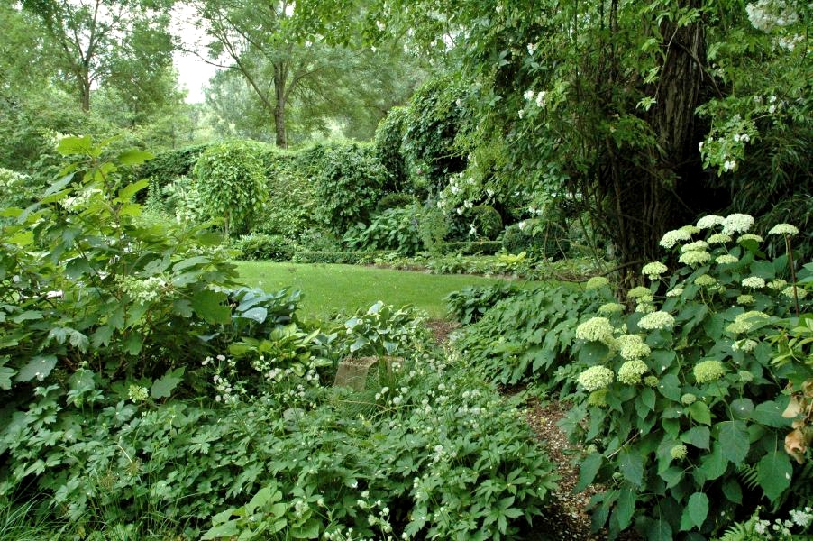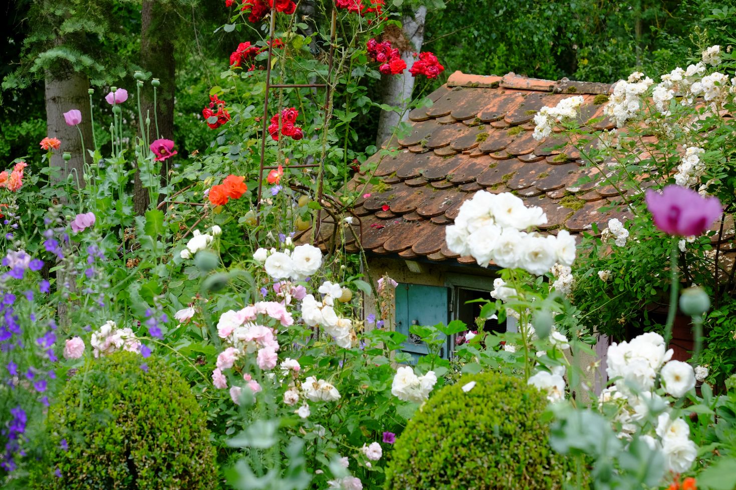 Nach der Hitze der vergangenen Tage freut man sich doppelt, so ein feines Kleinod aufzusuchen. Die sorgsam geschnittenen Gehölze, kleine Farbtupfer durch einige Rosenbüsche, dezentes Weiß der Hortensien zwischen den Blattschmuckstauden – alles das, was einen Schattengarten ausmacht. Gleich am Anfang erkennt man schon weiter hinten das ehemalige Hühnerhäuschen, dahinter der Nutzgarten zwischen vielen Rosen, zweifellos ein Blickfang – das muß man einfach liebhaben…