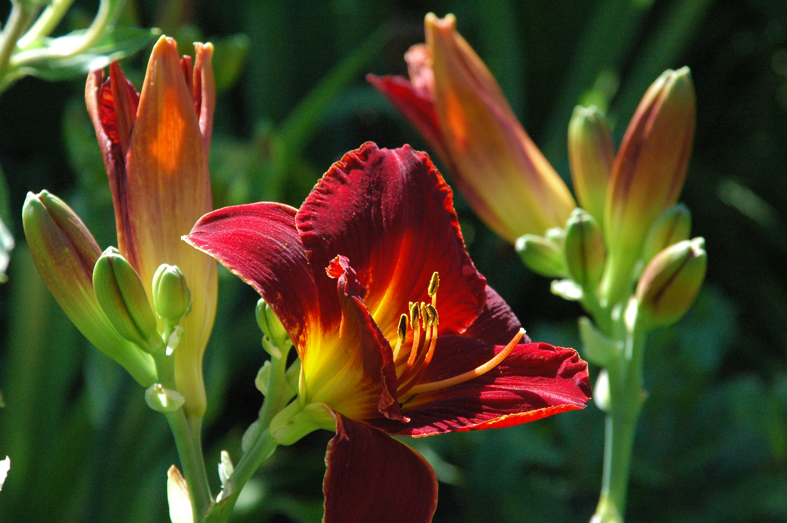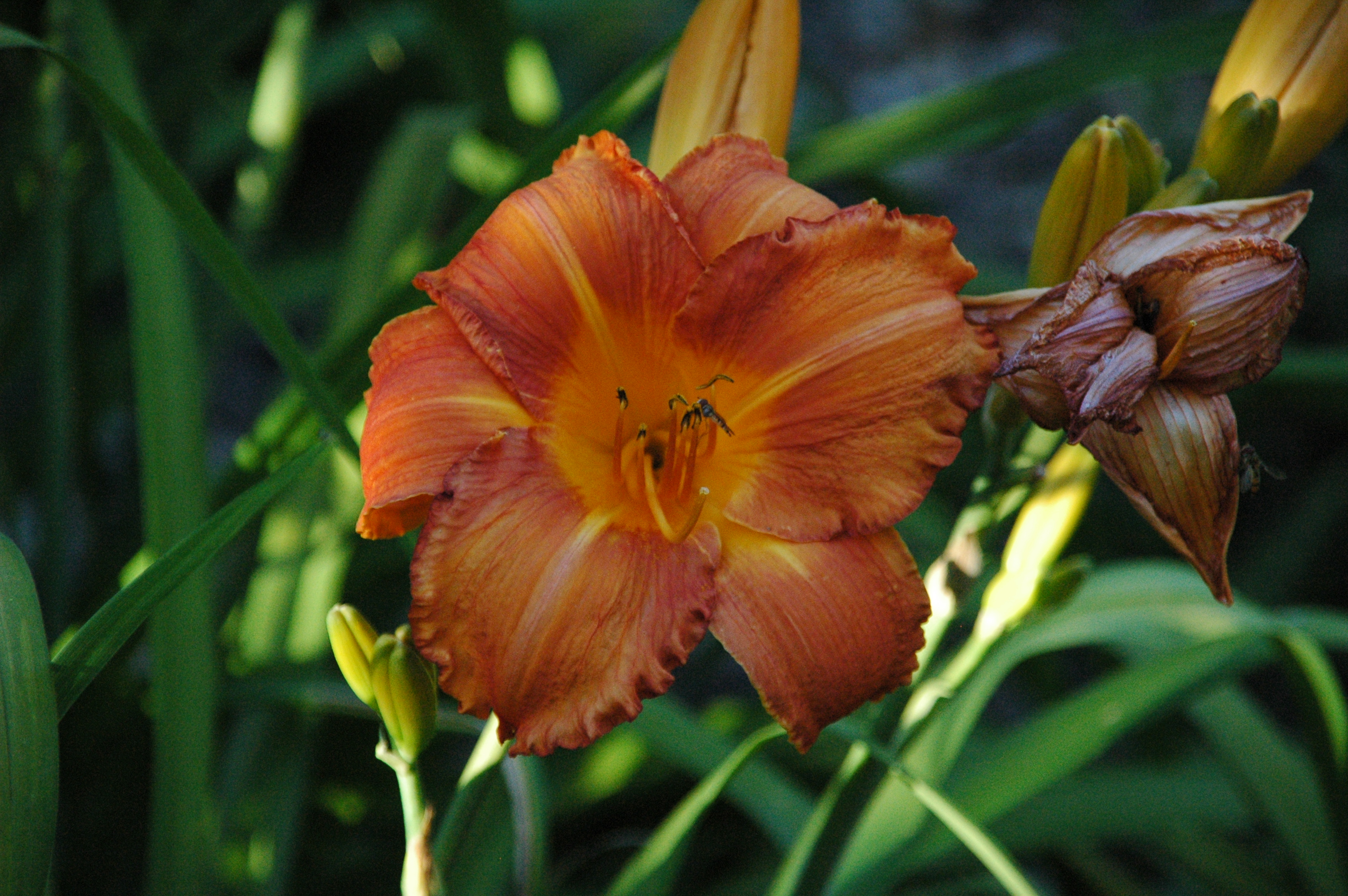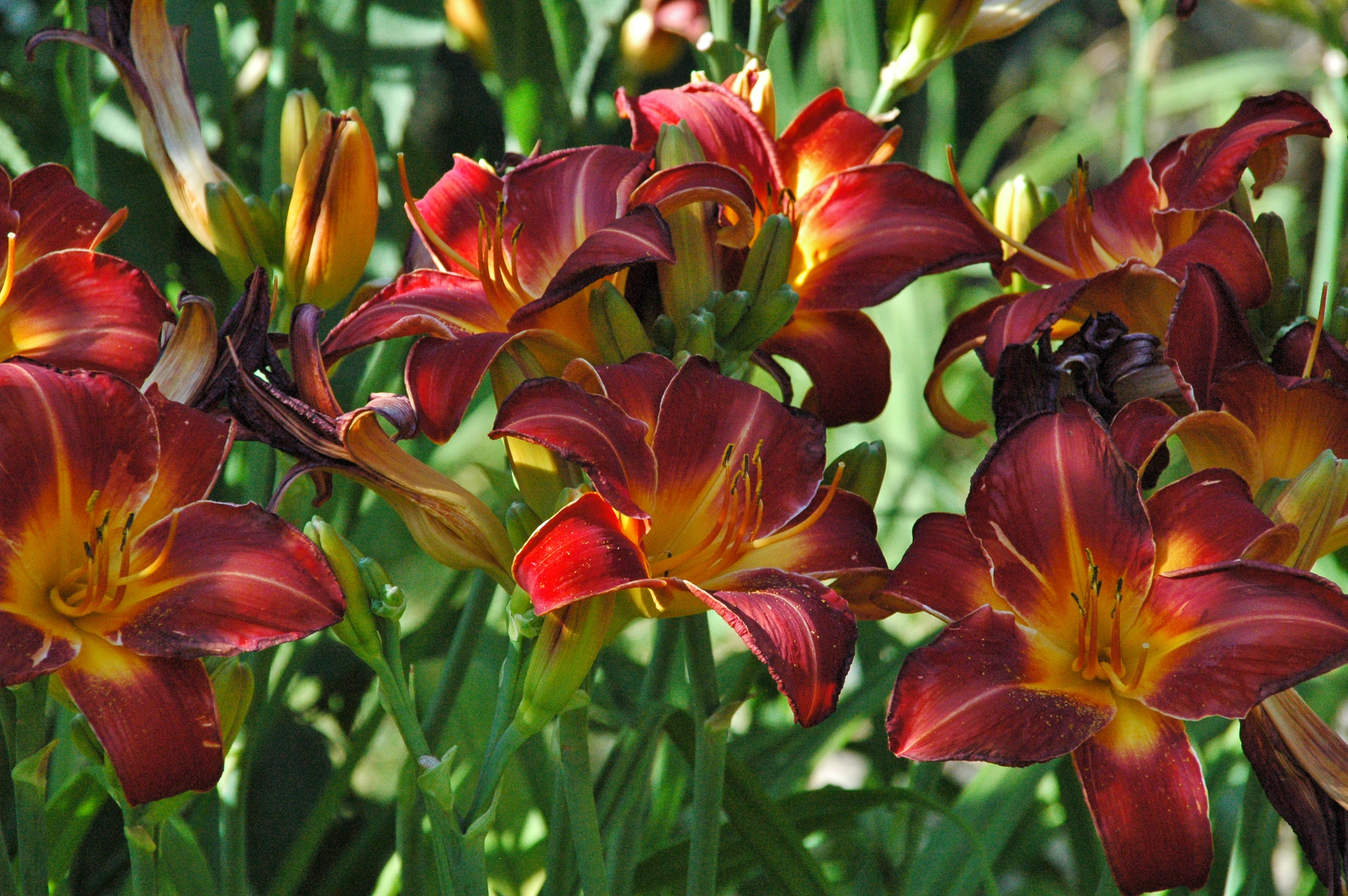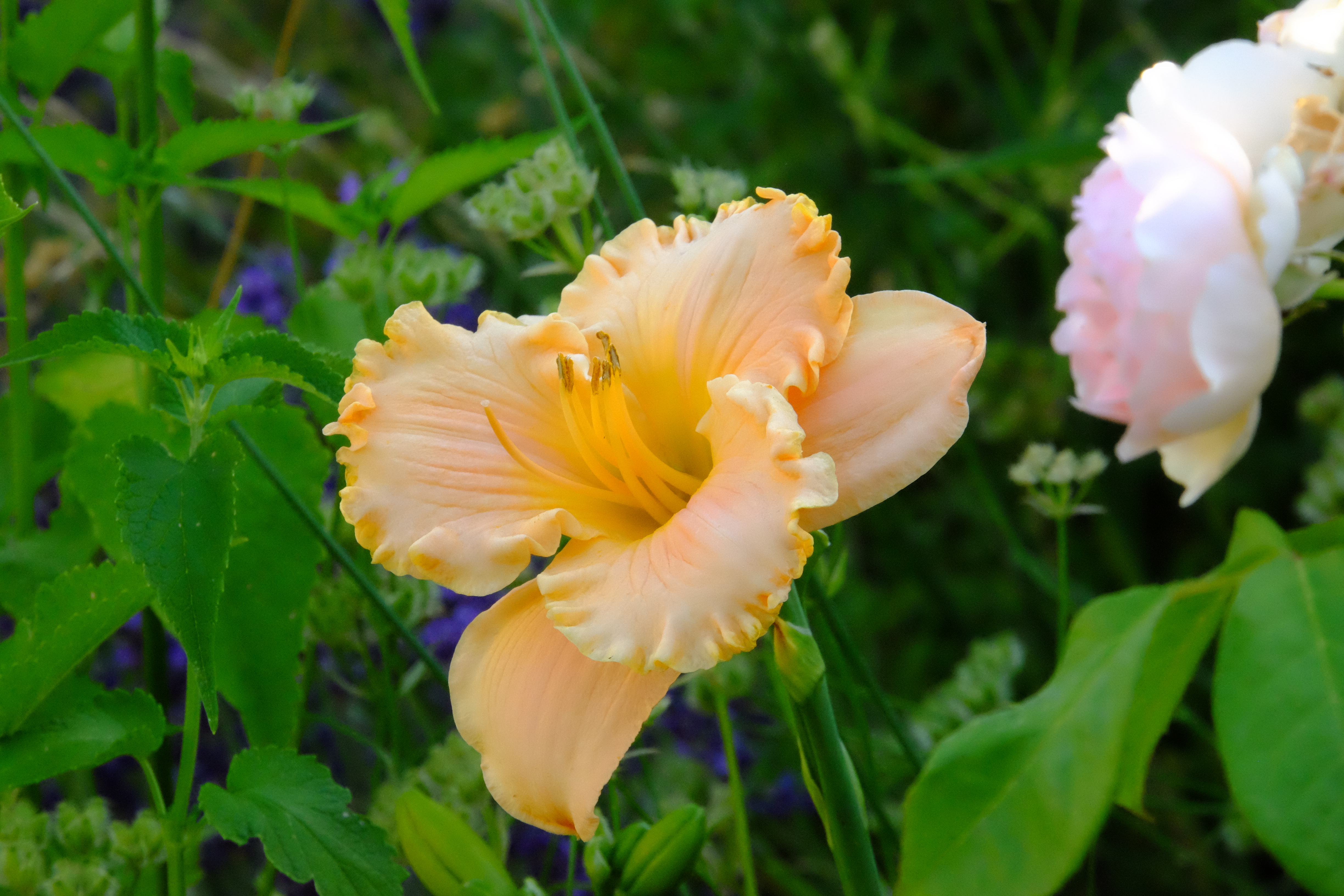 Die Rosen sind viel zu schnell hinüber – in ihrer schönsten Blütenpracht hat der plötzliche Regen die zarten Blüten der Alten Rosen empfindlich getroffen. Der Rückschnitt der remontieren Rosen ist noch nicht vollendet, die Hitze war gar zu arg! So trösten die feurigen Taglilien über den frühen Verlust hinweg…