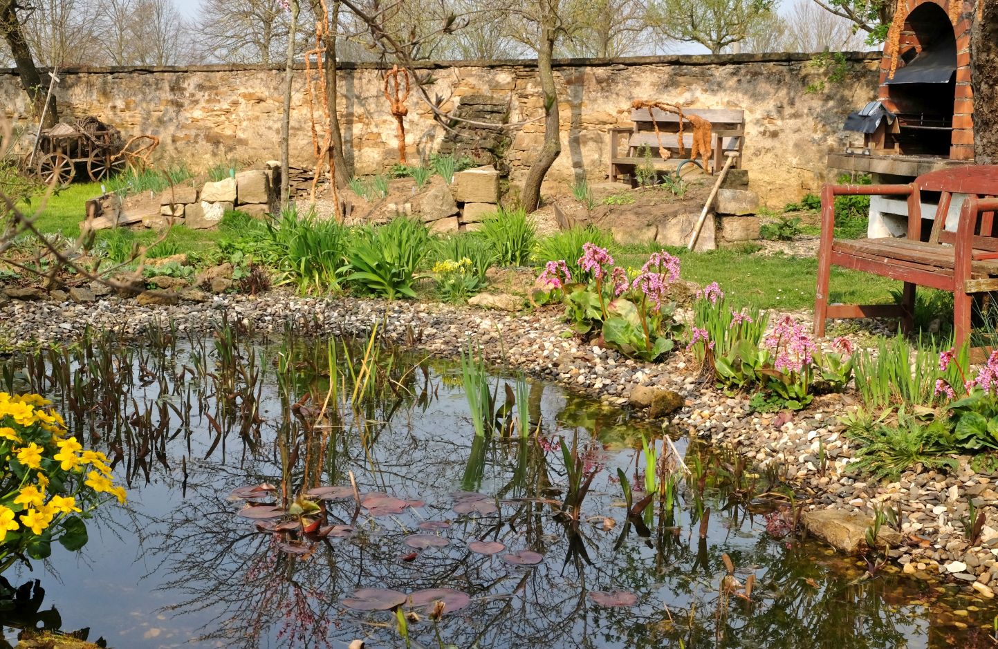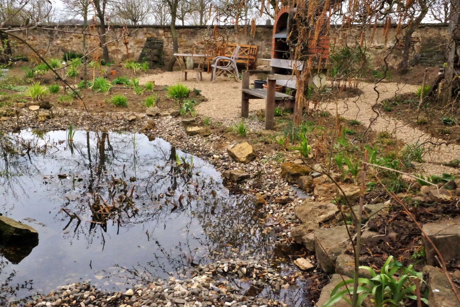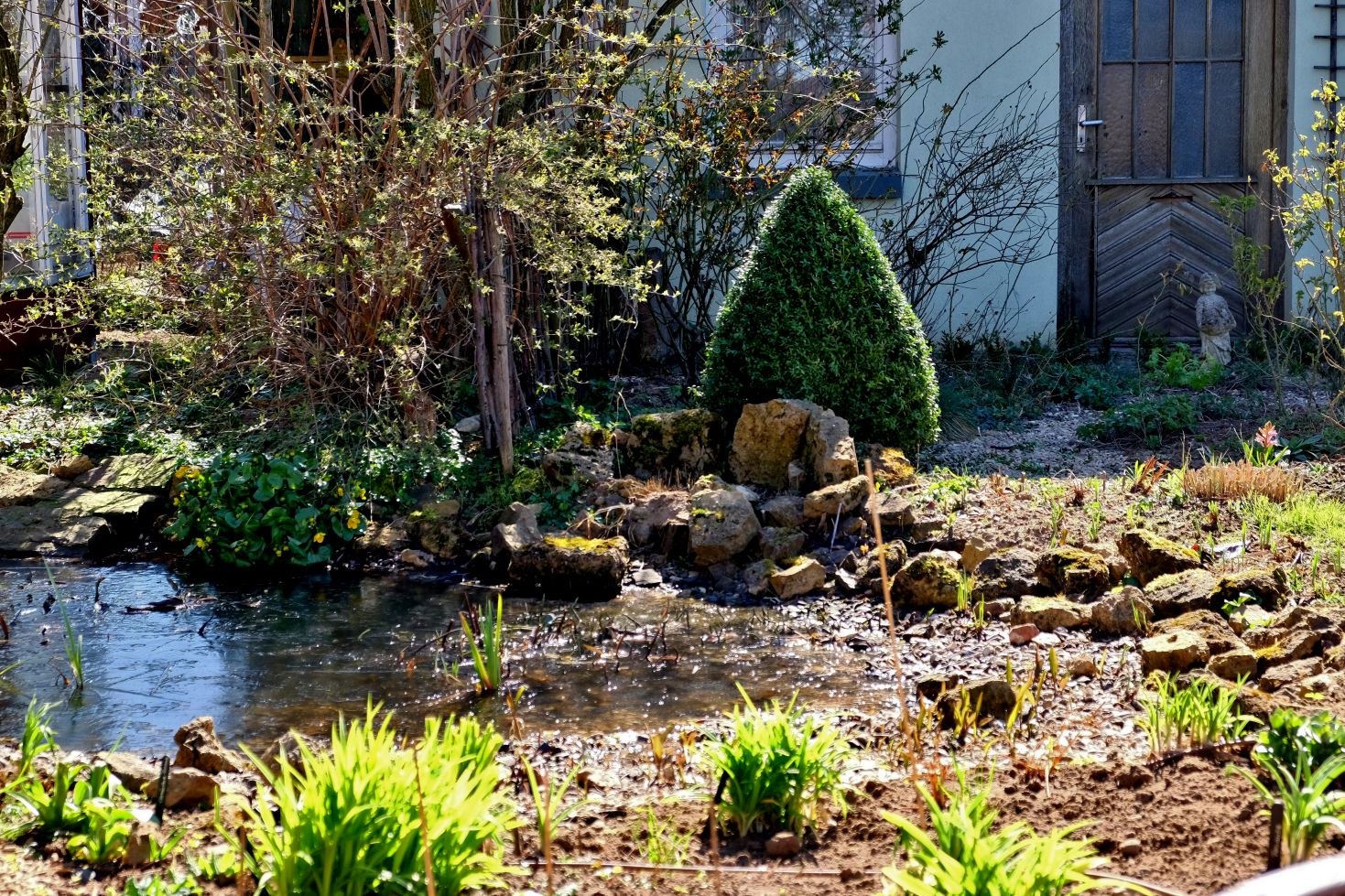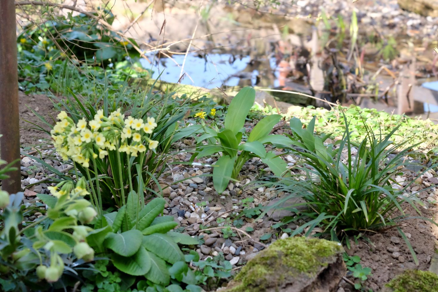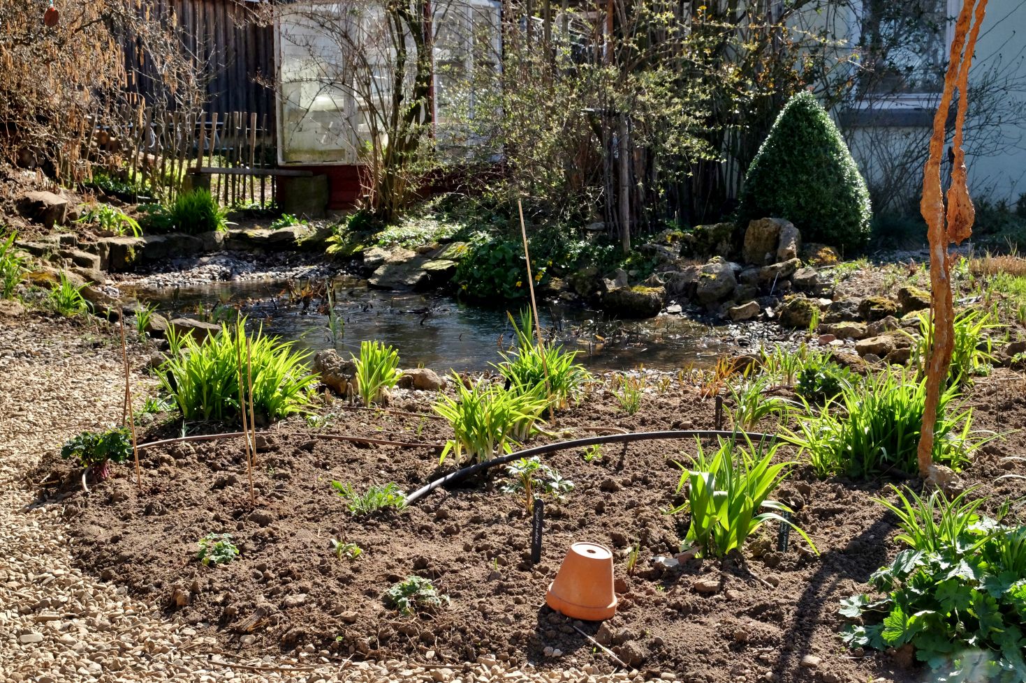 Man kann noch nicht viel von der Bepflanzung erkennen, aber zumindest einen kleinen Eindruck bekommen. Wir können jetzt den Teich und die Beete von mehreren Seiten betrachten.