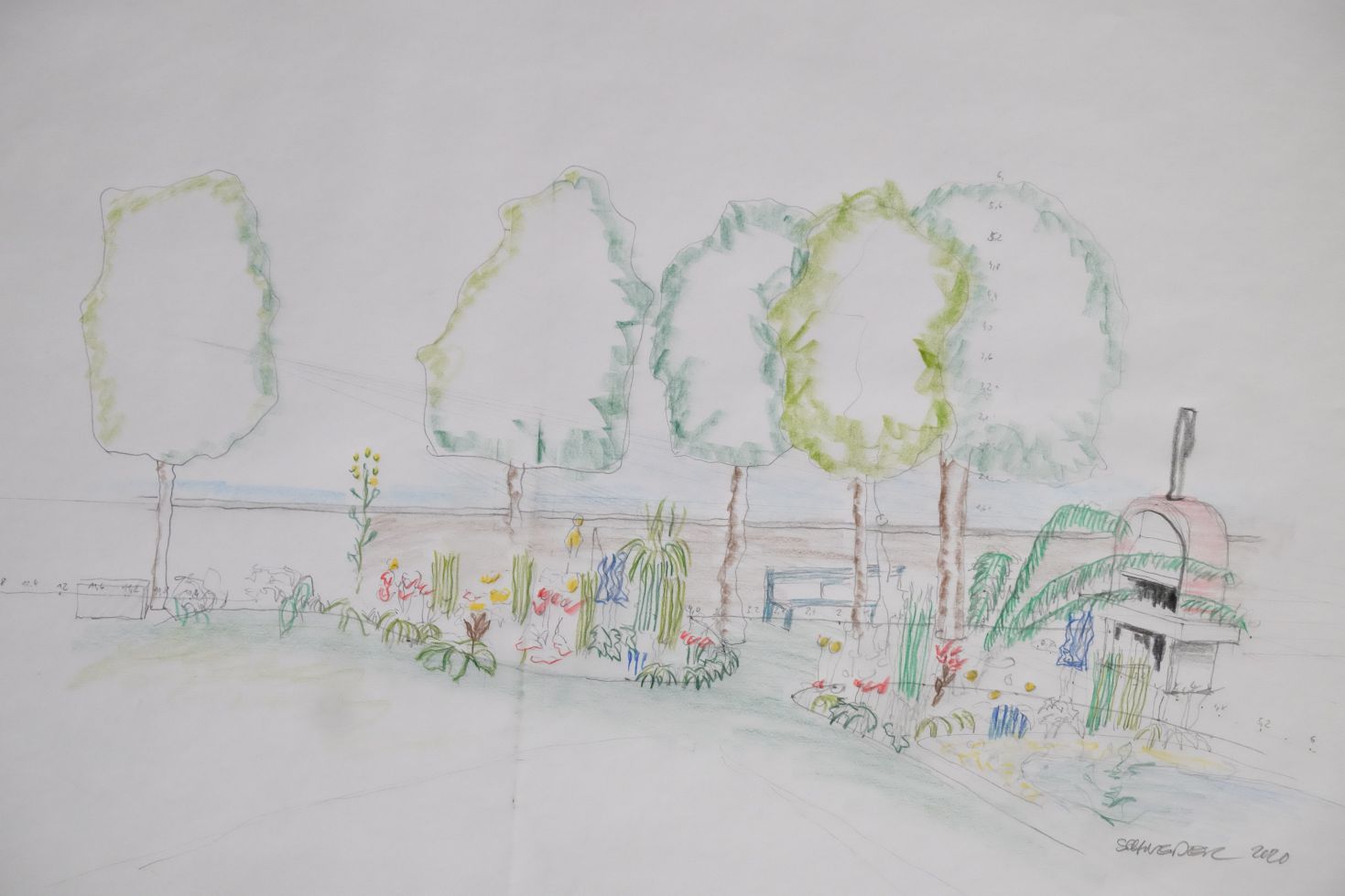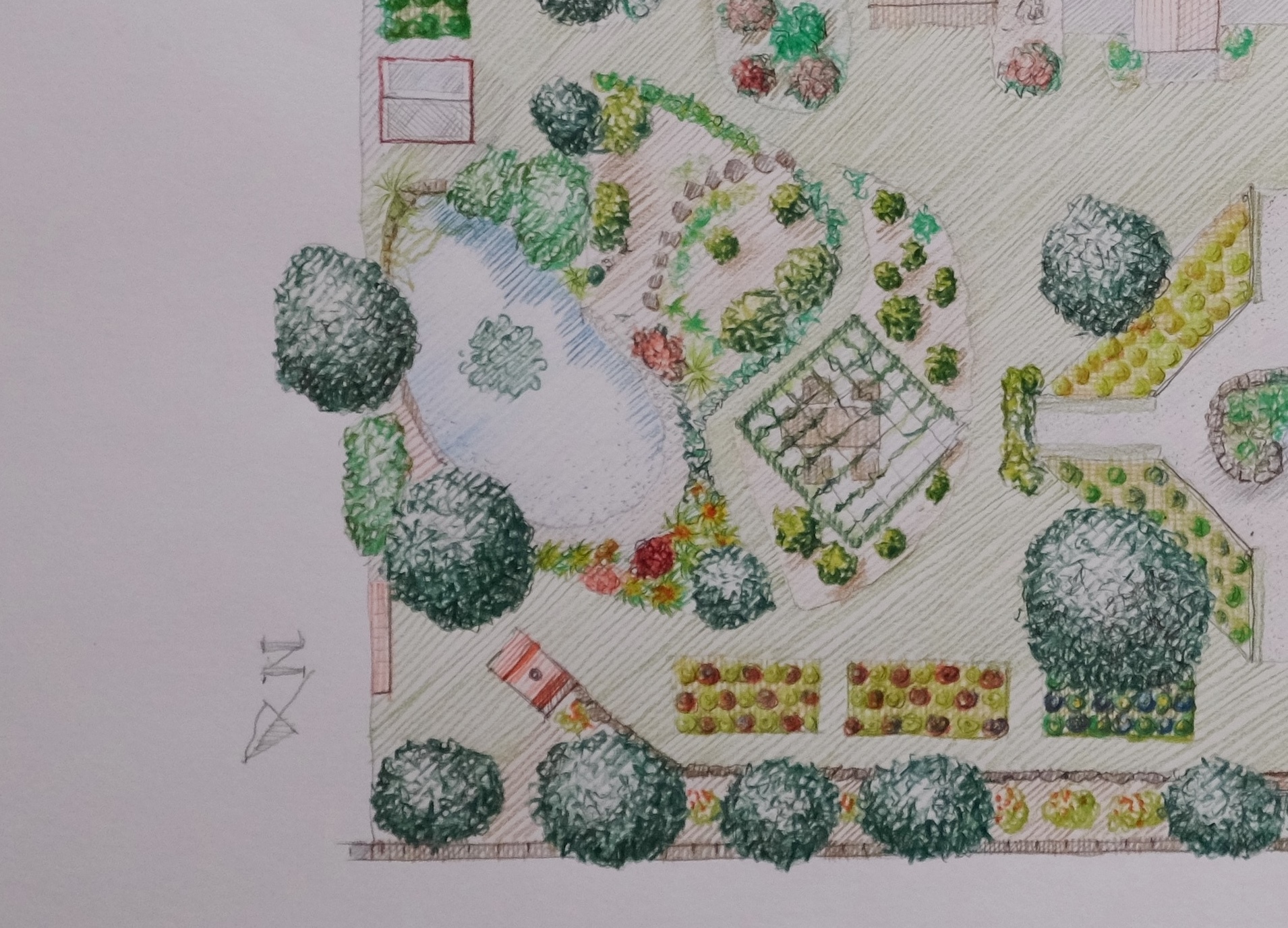 Die beiden Beete werden mit Morgensonne verwöhnt und bekommen erst am späteren Nachmittag etwas Schatten. Genau das Richtige für die feurigen Taglilien, Dahlien, Canna und Begleiter. Den Sitzplatz und die Wege dieses Bereichs versahen wir wieder mit Flusskies Körnung 8/16. Auf der alten Skizze von 2016 sieht man noch die rechteckigen Gemüsebeete, an deren Platz jetzt das neue Beet ist.