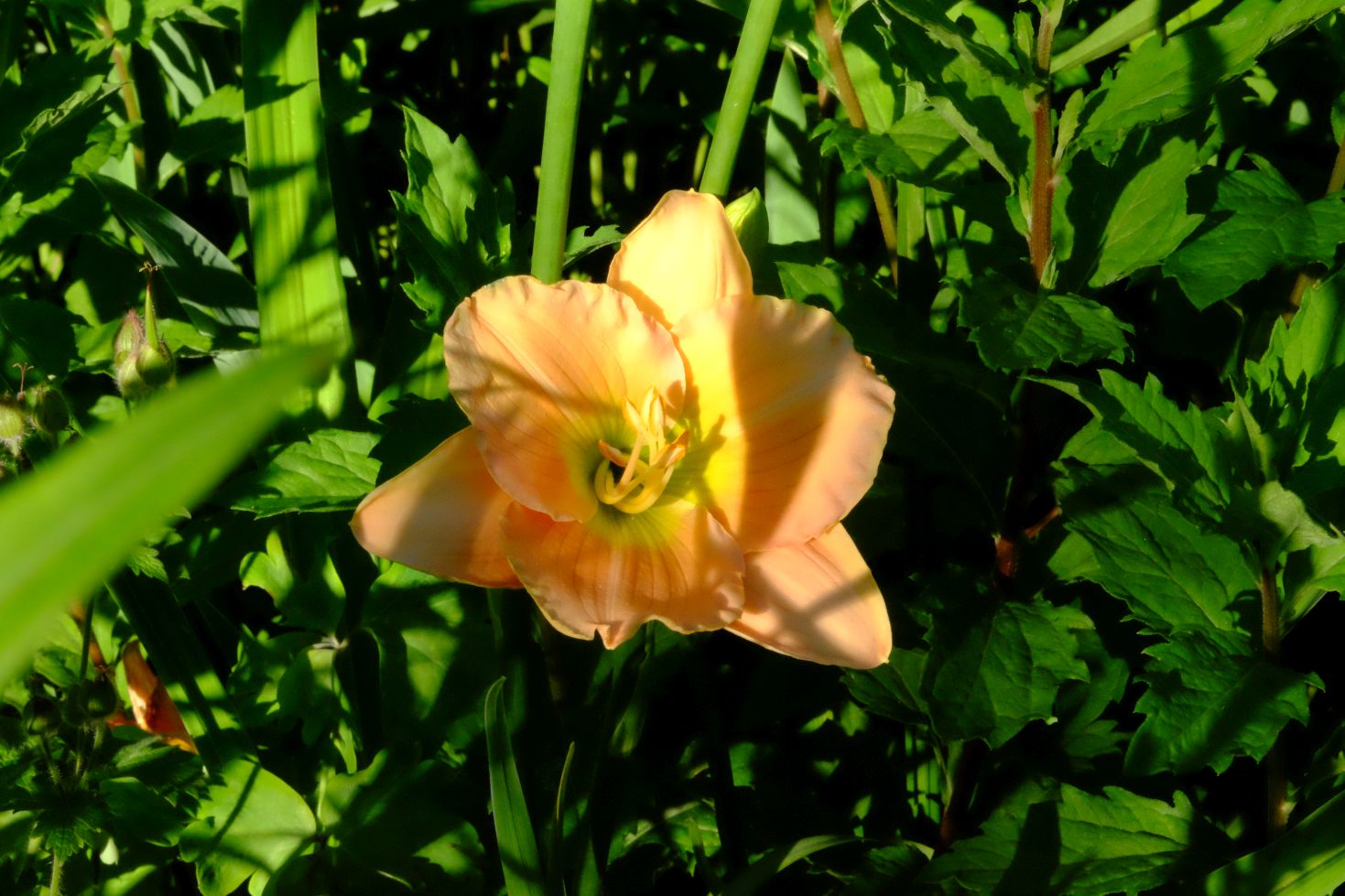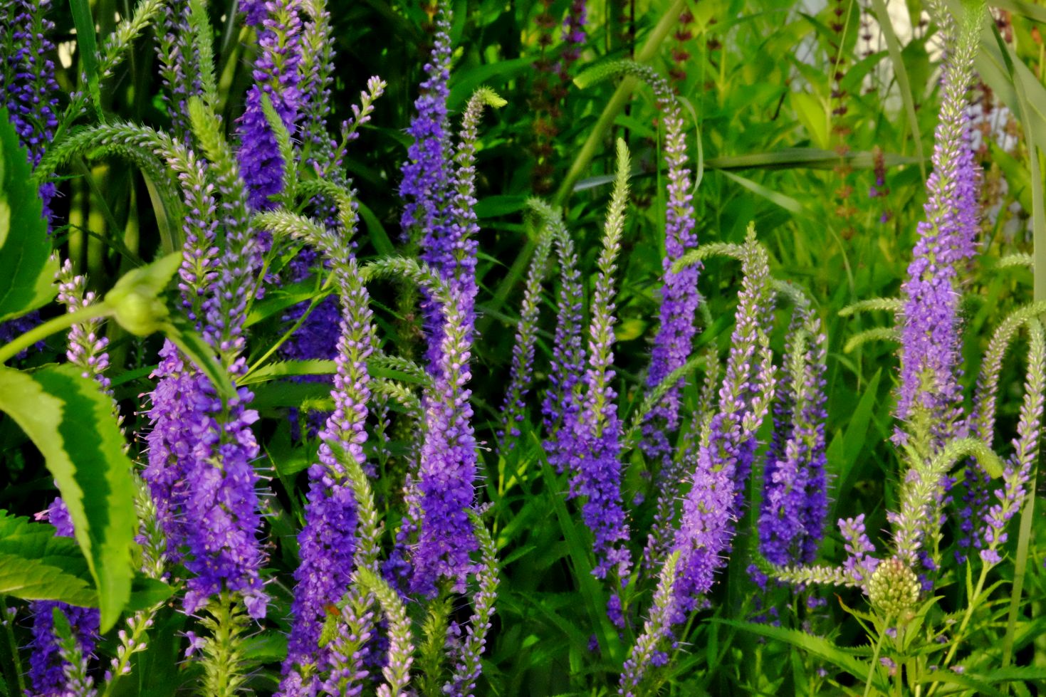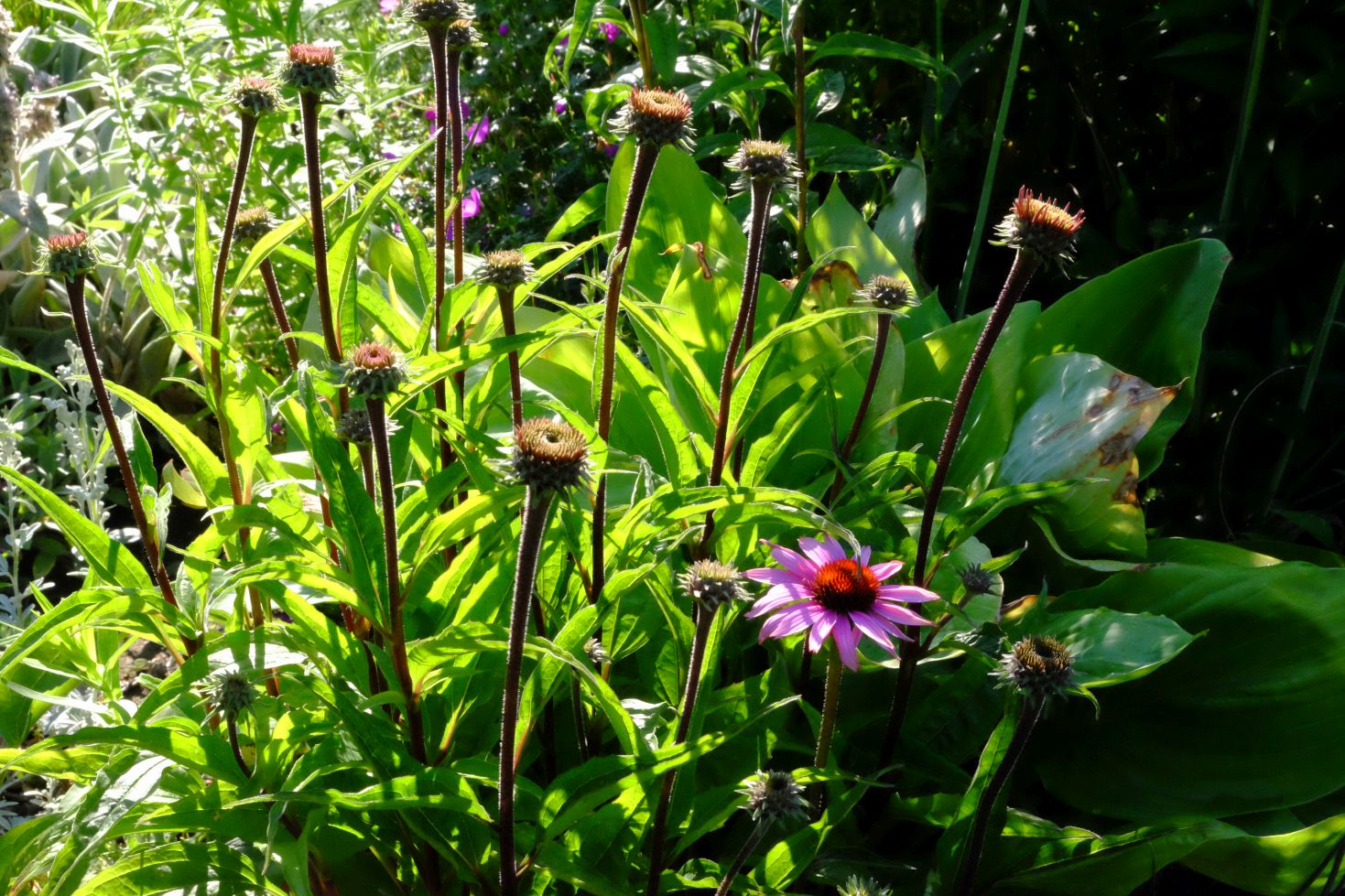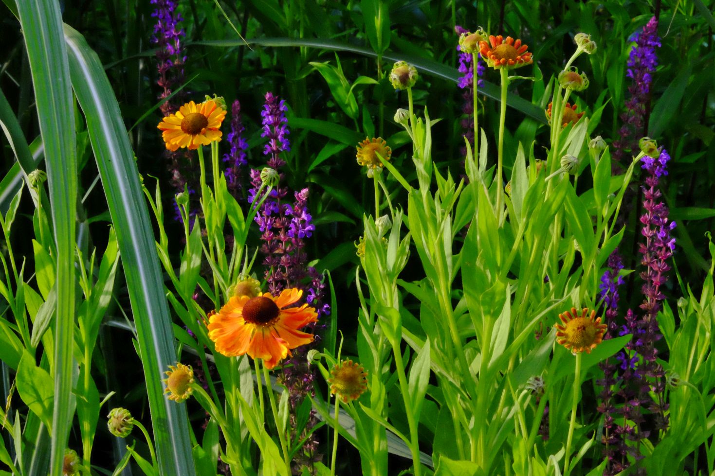 Die Taglilien in den Staudenbeeten zeigen erste Blüten, Echinacea purpurea ebenfalls. Veronica longifolia ‚Blauriesin‘ (langblättriger Ehrenpreis) blüht auf, nach und nach werden die kerzenförmigen Blüten dunkler. Sie harmonieren sehr gut mit dem orangefarbenen Helenium Hybride ‚Waltraud‘ (Sonnenbraut).