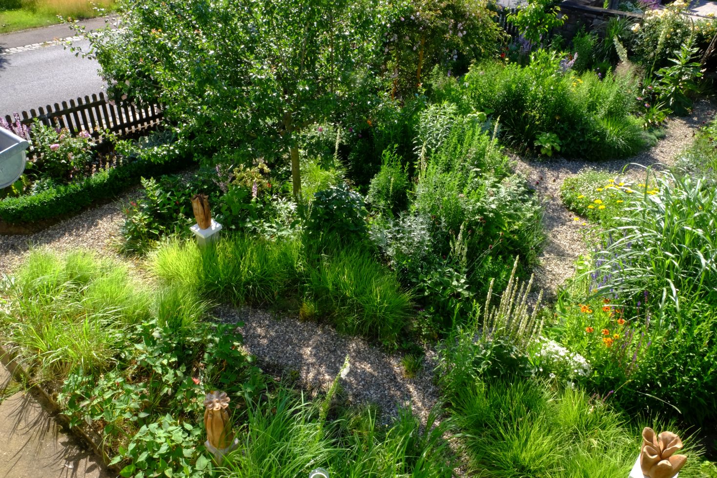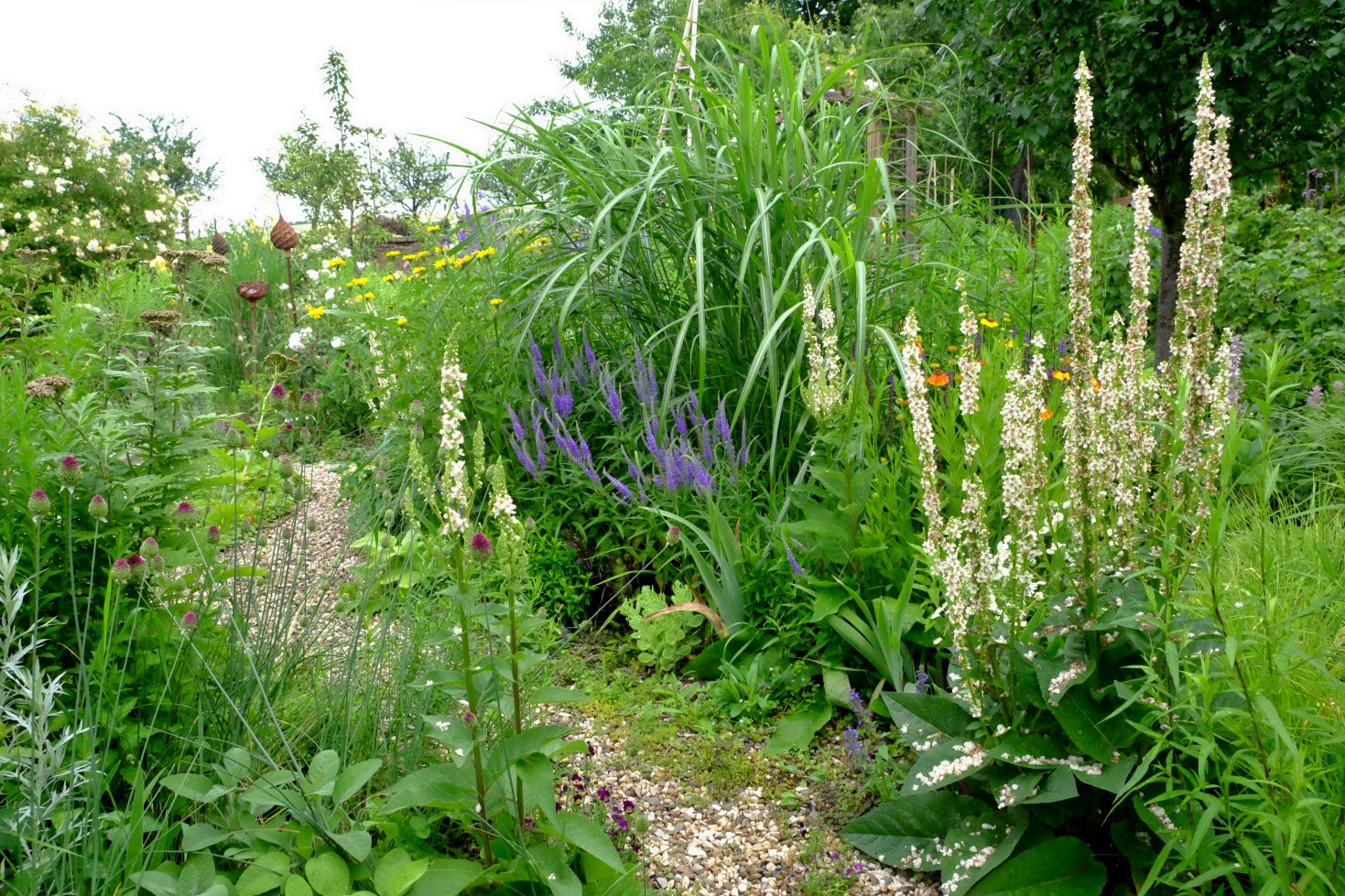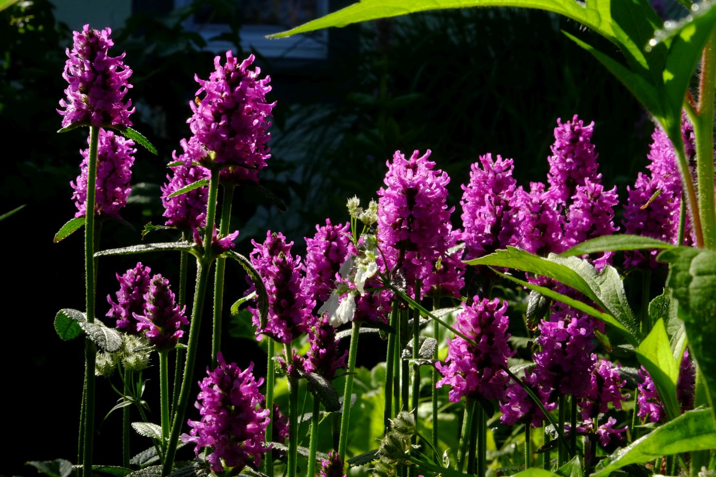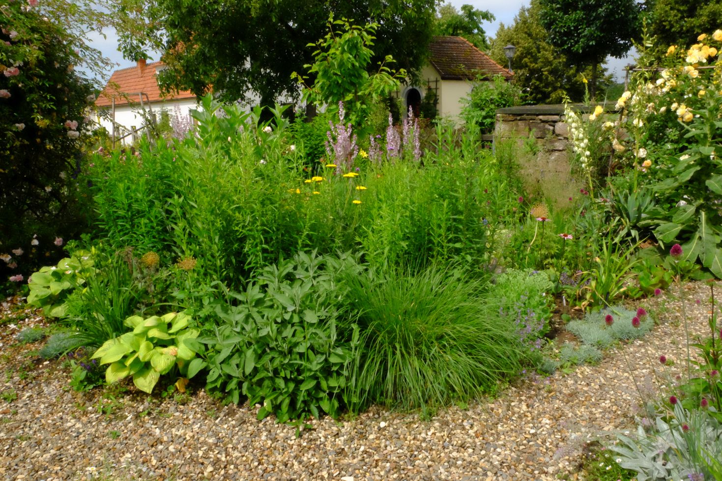Auffallend blüht in diesem Jahr die Waldschmiele Deschampsia cespitosa ‚Bronzeschleier‘, im letzten Jahr habe ich es kaum wahrgenommen. Auch Betonica hirsuta ‚Hummelo‘ (Stachys monieri) besticht durch ihre kräftige und intensive Farbe – ob wir es dem häufigen Frühjahrsregen zu verdanken haben? Der kräftige Wuchs aller Stauden und Gehölze gefällt uns jedenfalls…..