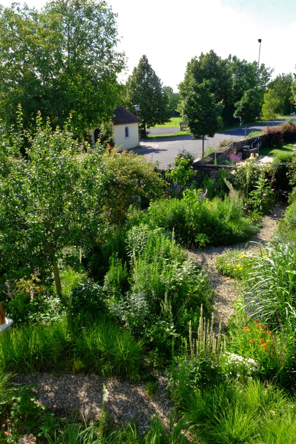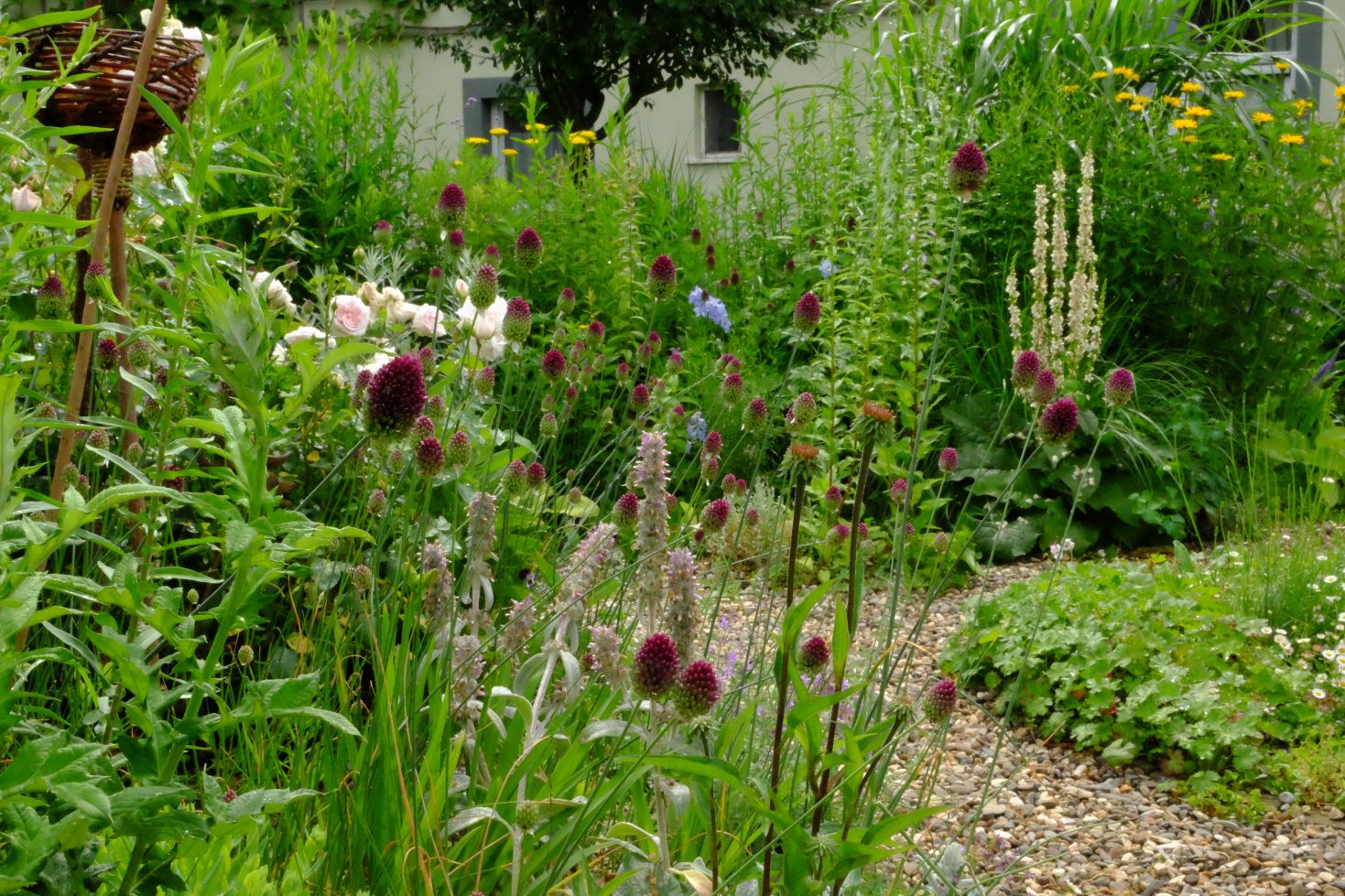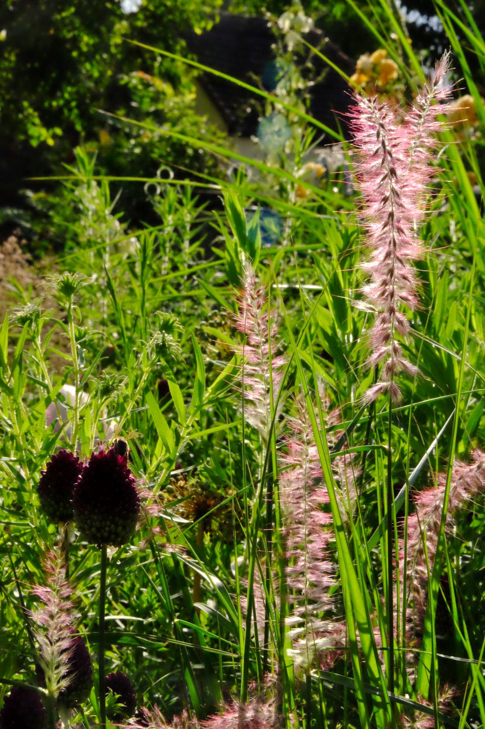 Auffallend blüht in diesem Jahr die Waldschmiele Deschampsia cespitosa ‚Bronzeschleier‘, im letzten Jahr habe ich es kaum wahrgenommen. Auch Betonica hirsuta ‚Hummelo‘ (Stachys monieri) besticht durch ihre kräftige und intensive Farbe – ob wir es dem häufigen Frühjahrsregen zu verdanken haben? Der kräftige Wuchs aller Stauden und Gehölze gefällt uns jedenfalls…..