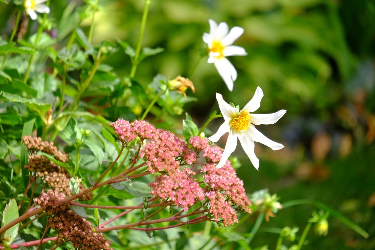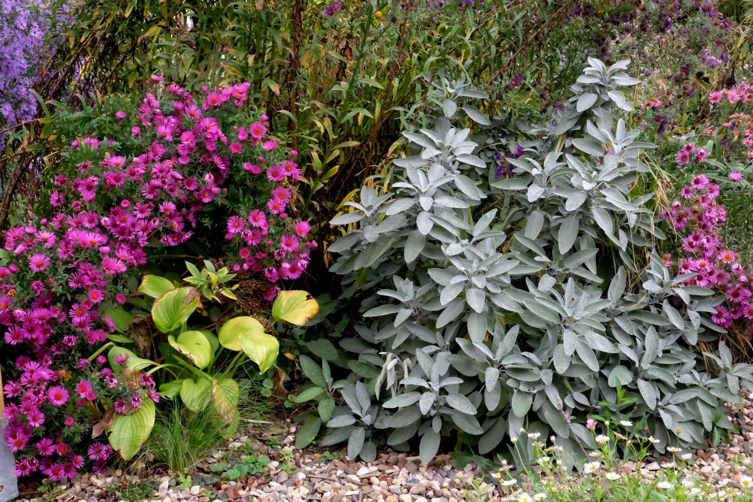 Es gibt eigentlich noch viel Blühendes – der Regen hat die Erde gut durchfeuchtet und das sieht man deutlich. An Sonne fehlt es in diesem Herbst, das würde die Leuchtkraft noch verstärken. Besonders hübsch sind die Samenstände vom Brandkraut Phlomis tuberosa