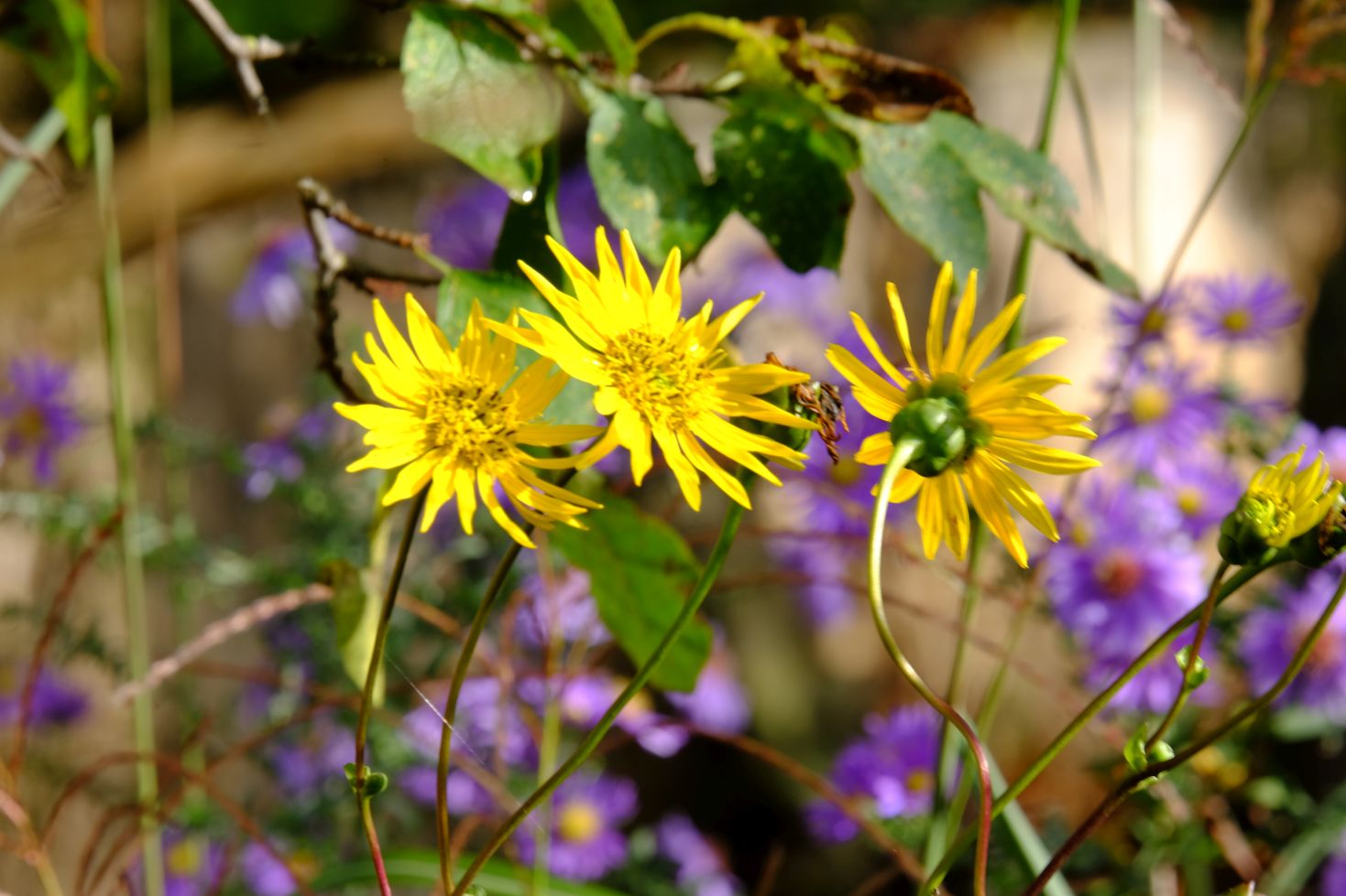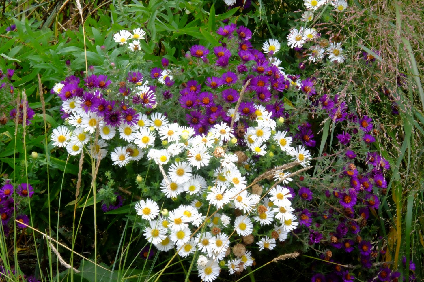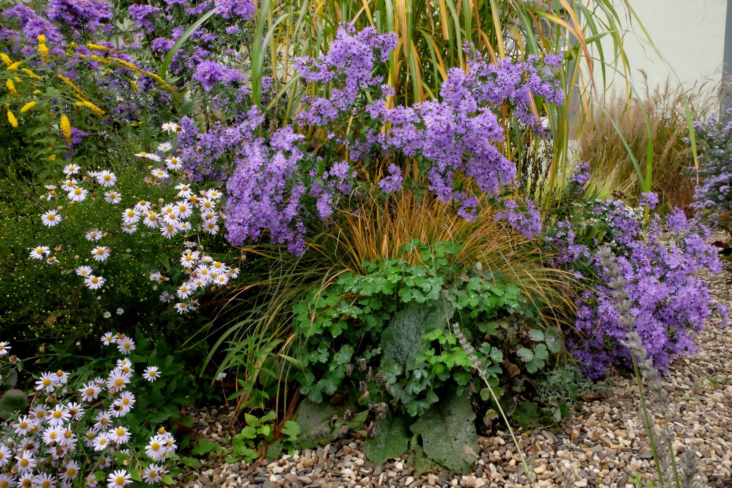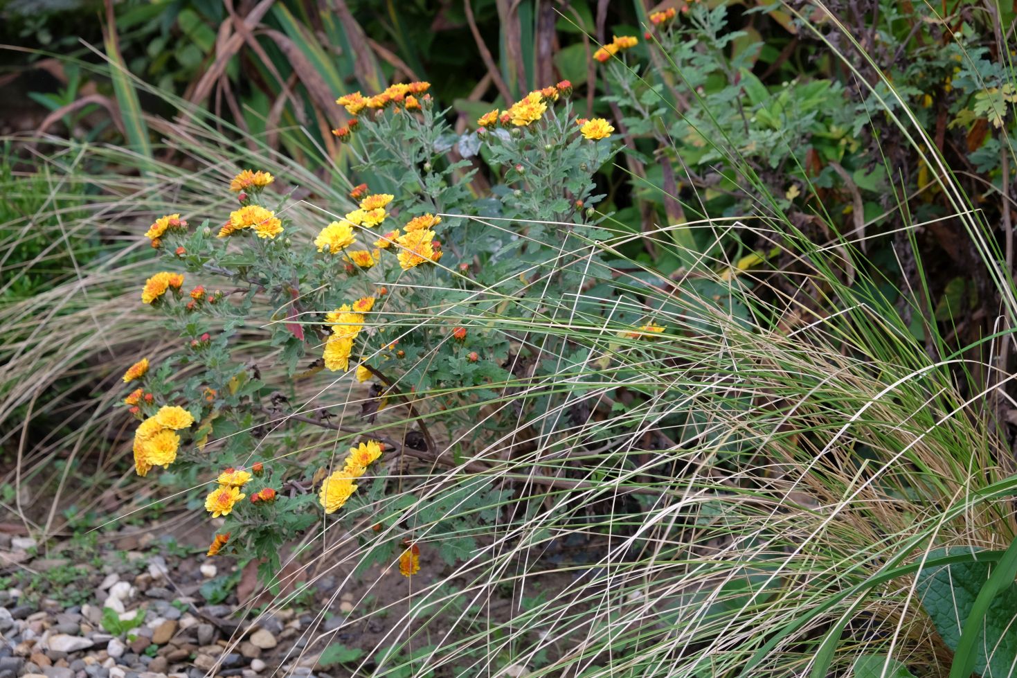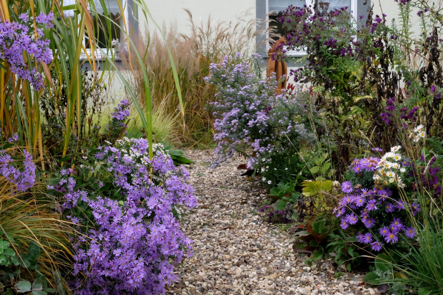 Es ist Zeit, den herbstlichen Garten zu genießen, Gräser und viele Astern und Chrysanthemen zeigen sich von schönster Seite. Selbst die wenigen Dahlien leuchten noch in warmem Orange – ideal zum dunklen Eisenhut 😉