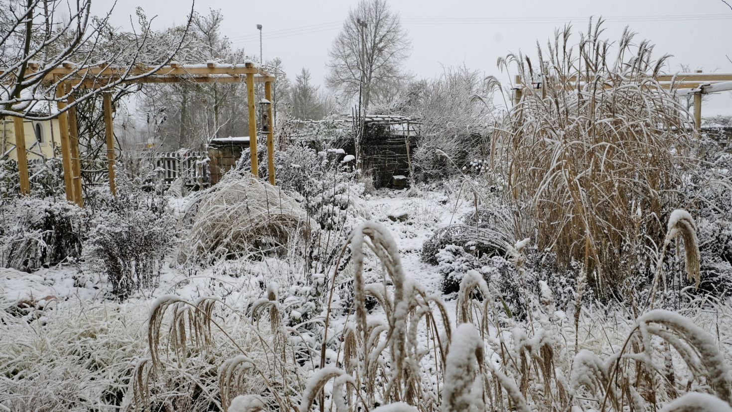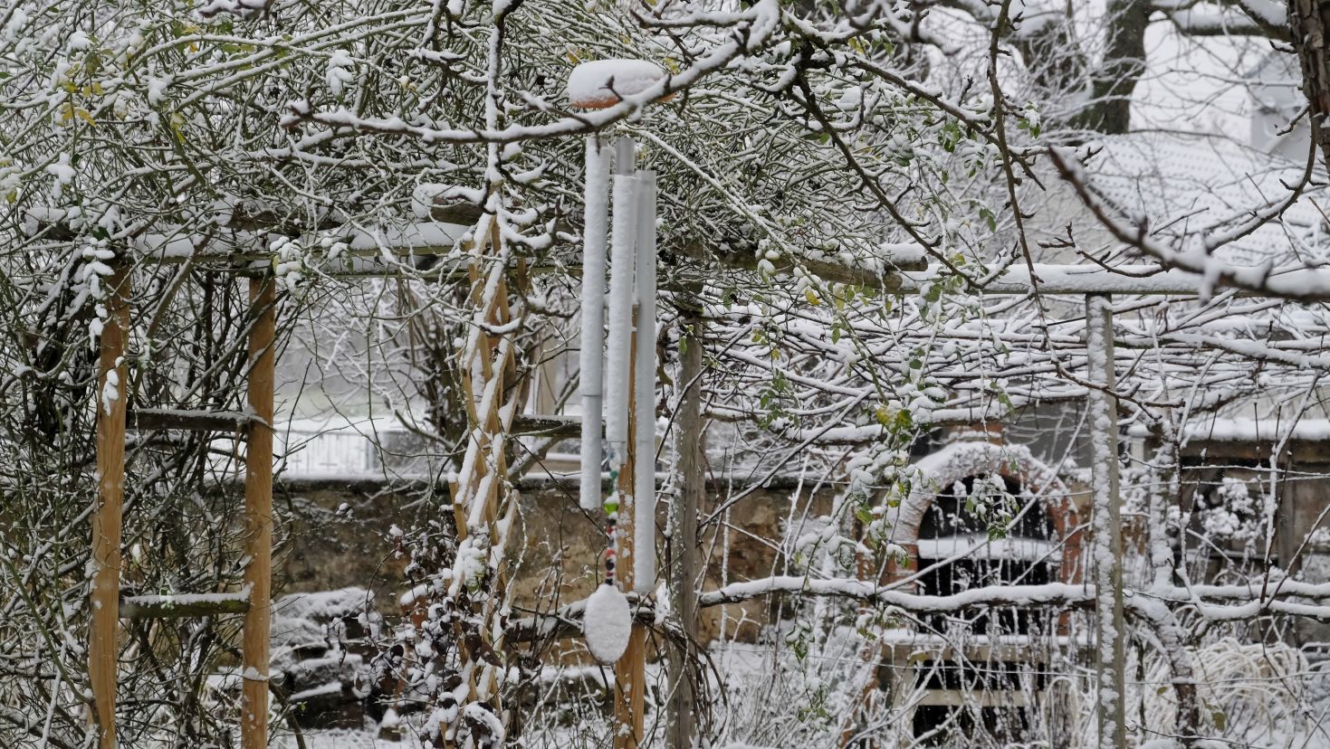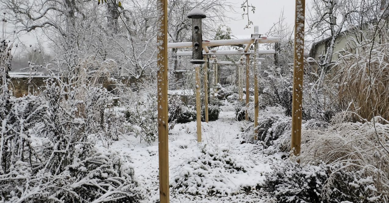 Was so ein weißes Häubchen doch ausmacht! Auf einigen Bildern erkennt man schon die Fortsetzung des kleinen Laubengangs, der demnächst entlang der Sichtachse durch den Garten führt. Die Ramblerrosen an den einzelnen Übergängen finden mehr Platz und Halt.