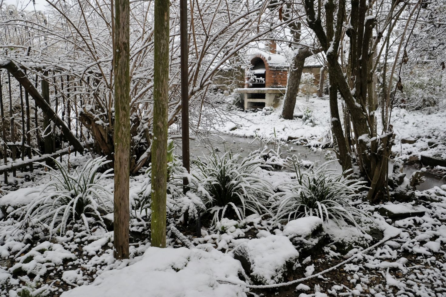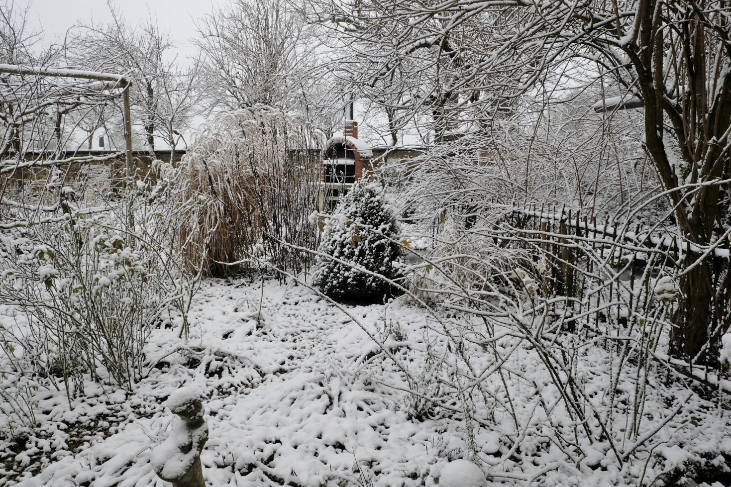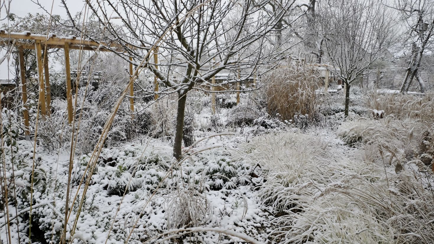 Was so ein weißes Häubchen doch ausmacht! Auf einigen Bildern erkennt man schon die Fortsetzung des kleinen Laubengangs, der demnächst entlang der Sichtachse durch den Garten führt. Die Ramblerrosen an den einzelnen Übergängen finden mehr Platz und Halt.