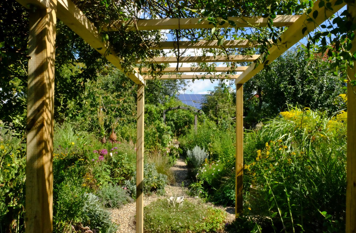 Ein Laubengang entlang der Sichtachse in unserem Garten war schon lange Wunsch: einmal wegen der Ramblerrosen, die an drei Übergängen bereits üppig wachsen und dringend mehr Platz benötigen und ein anderes Mal wegen der intensiven Sonnenbestrahlung von morgens bis abends.
