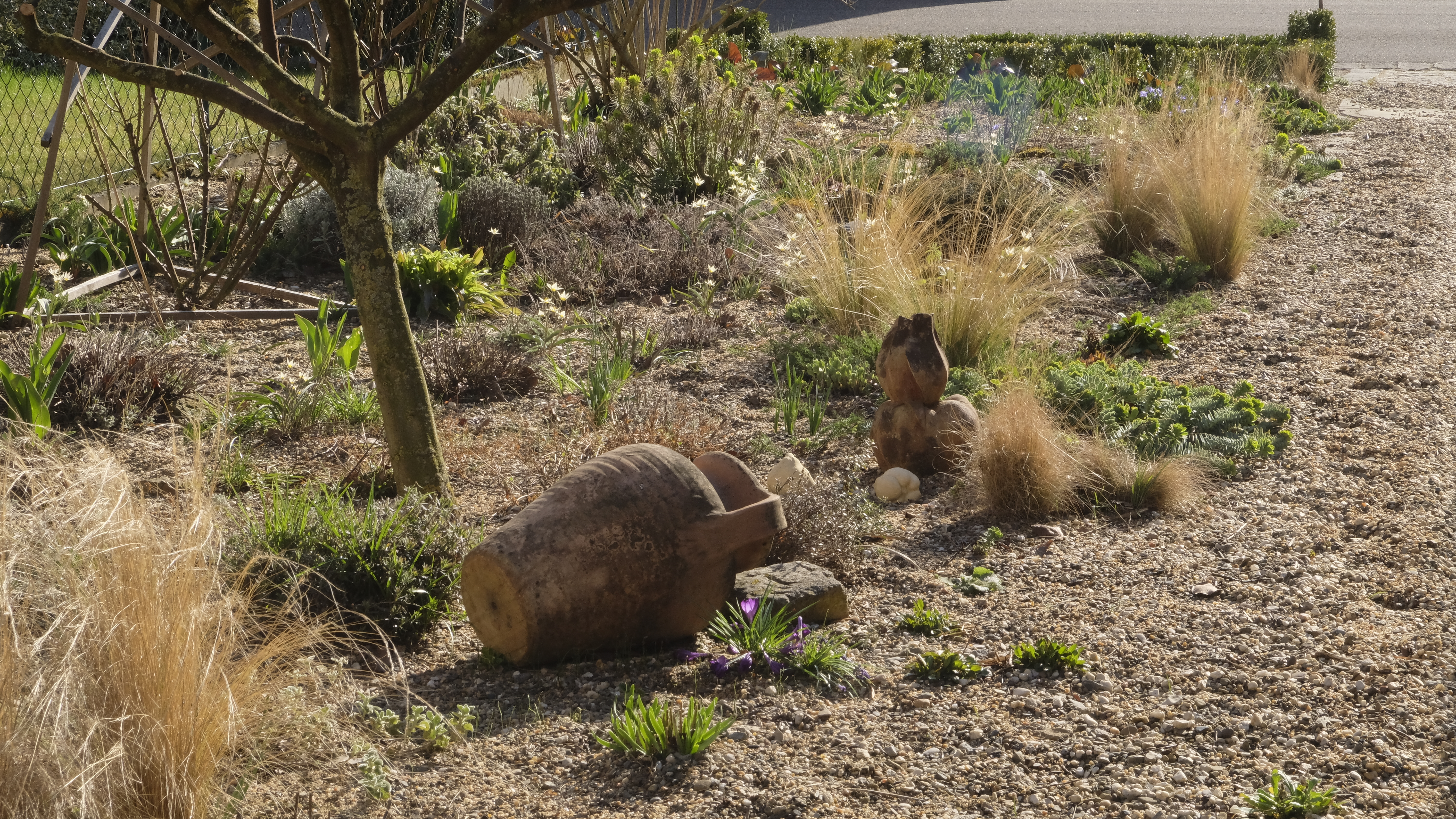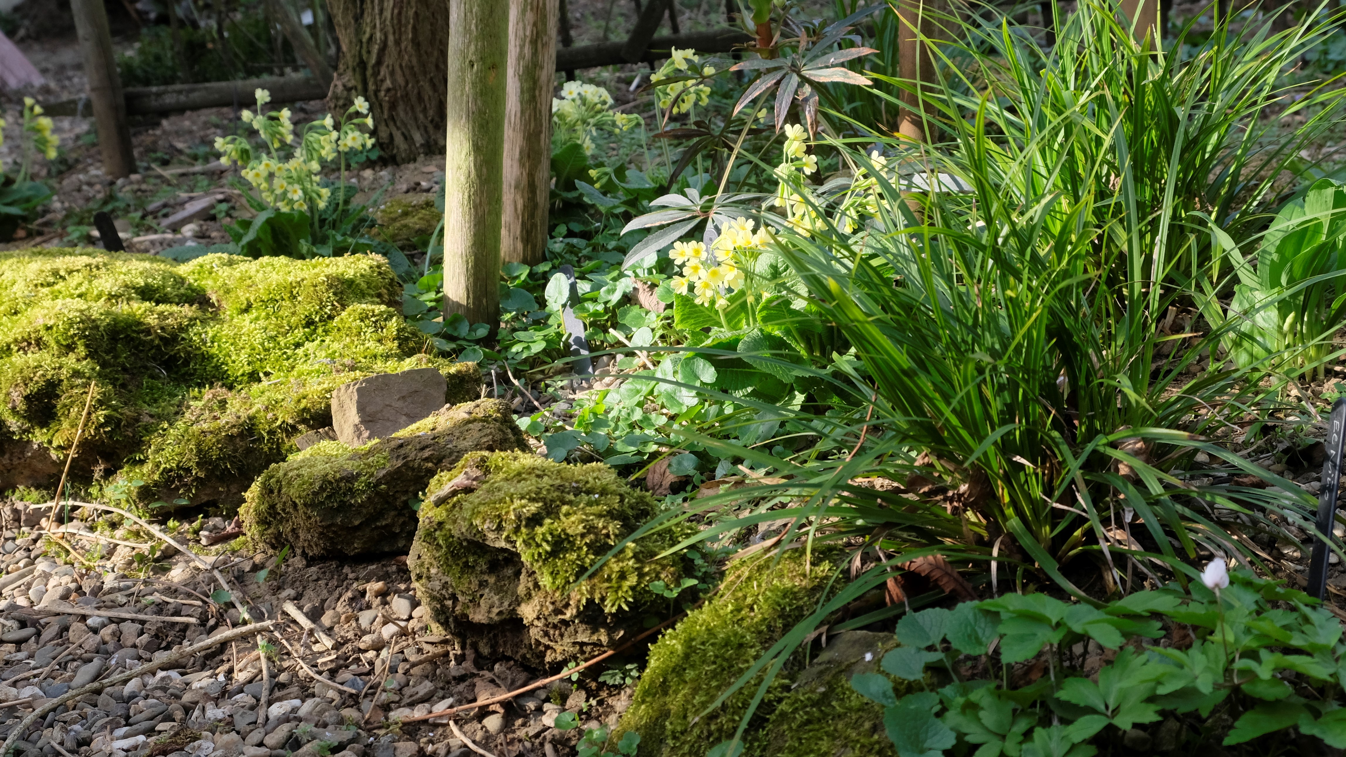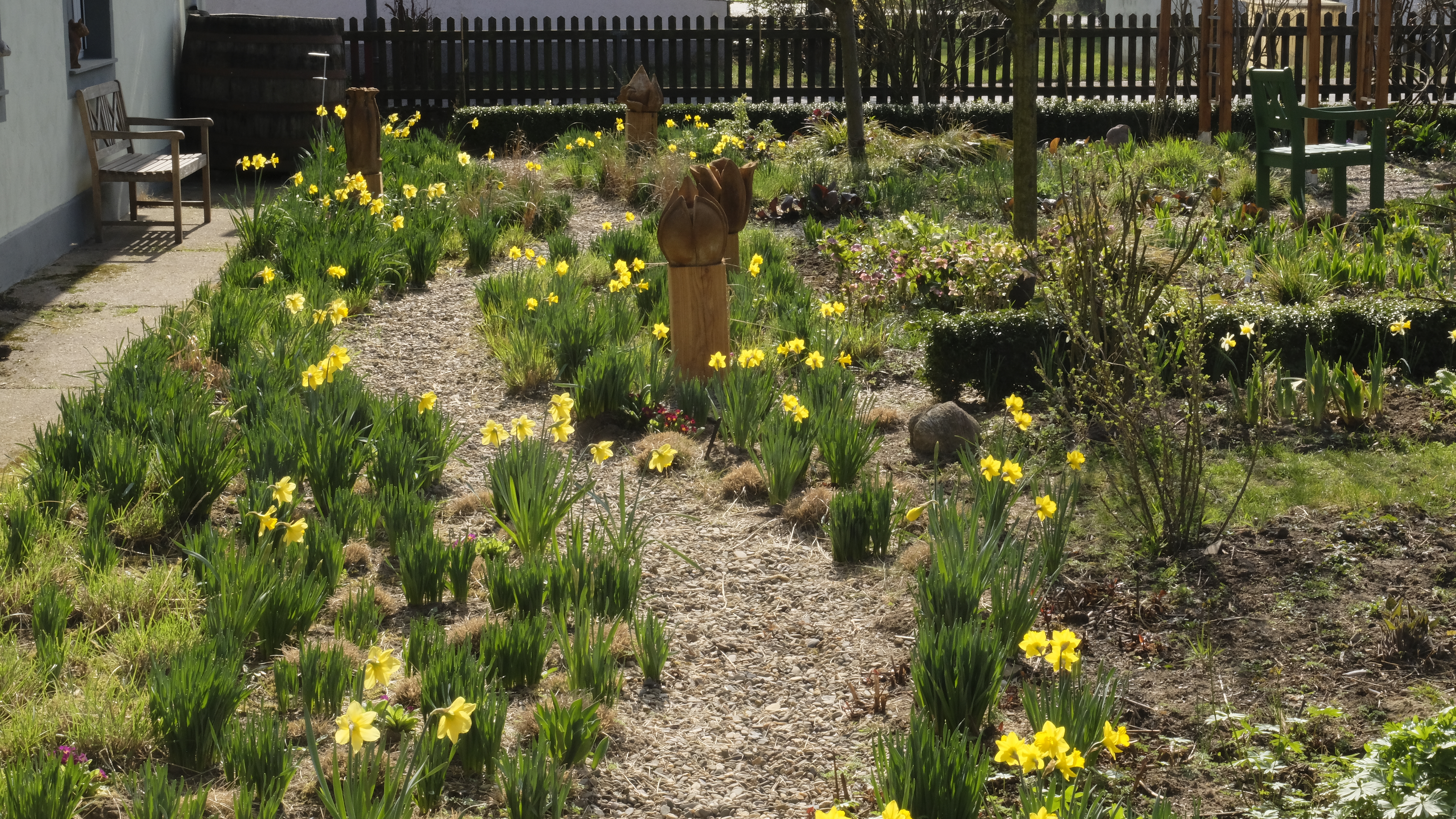 Der Bau des Laubenganges und des Sitzplatzes ist fertig. Mit Stahlseilen verspannt und ein Anstrich mit pflegendem Holzöl können wir uns jetzt den pflegenden Tätigkeiten im Garten widmen. Aber zwischendurch gibt es immer wieder Zeit, die Entwicklung im Garten zu betrachten. Dazu machen wir uns Notizen, um später Änderungen vorzunehmen. Ganz wichtig ist uns seit einigen Jahren die Frühjahrsblüher vermehrt einzusetzen.