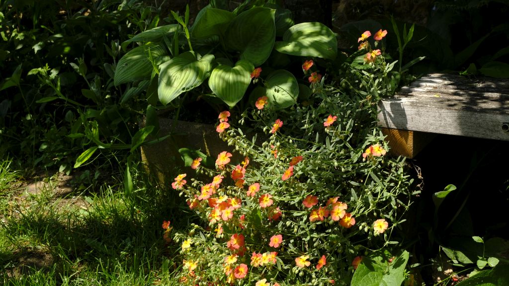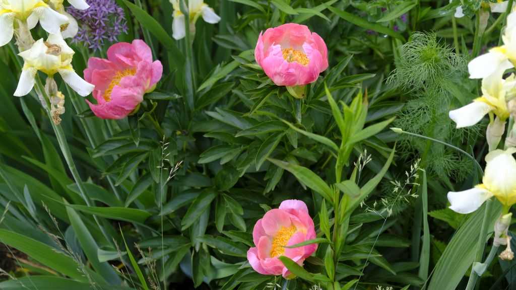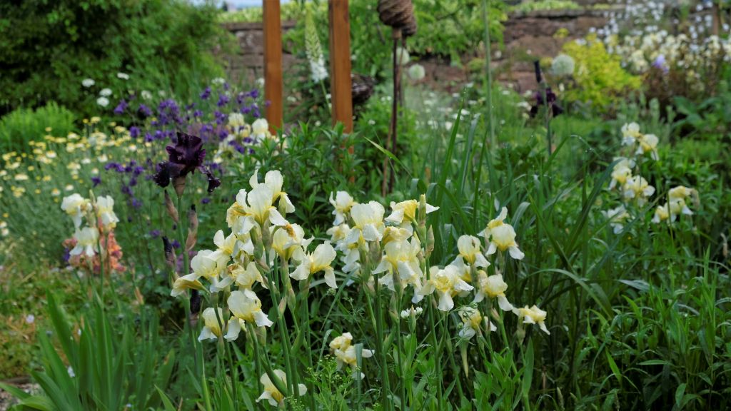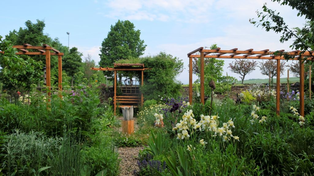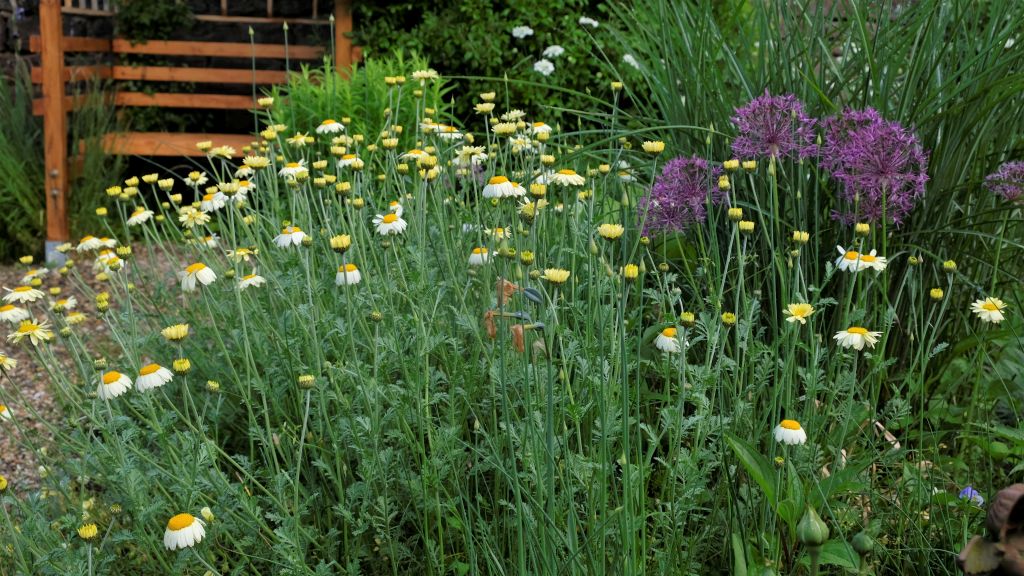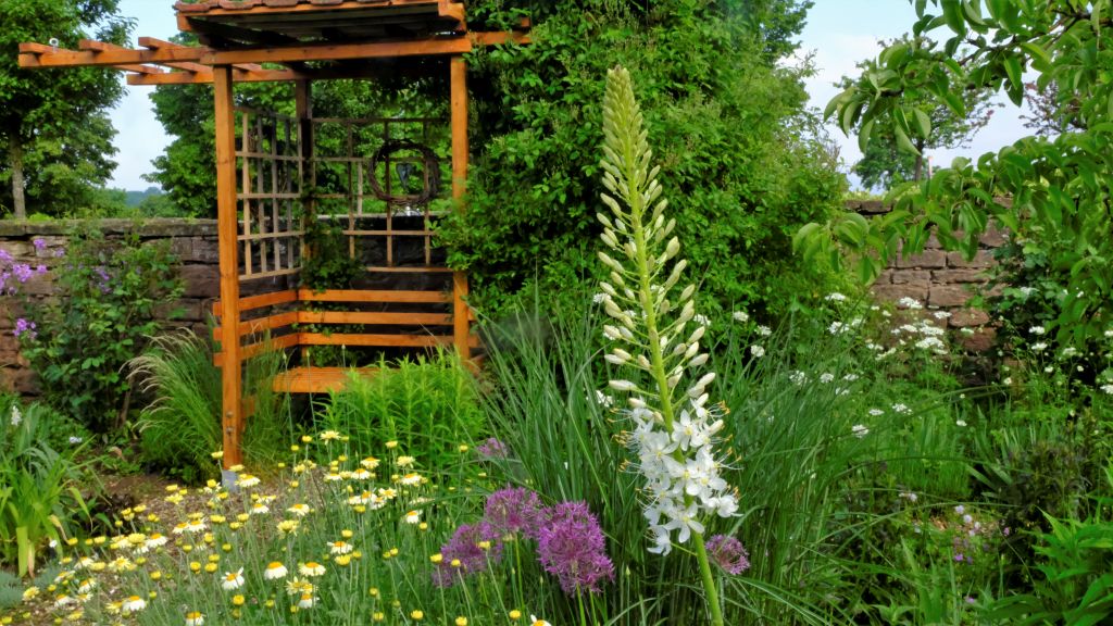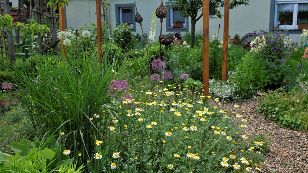 aber auch Helianthemum, die ersten Päeonien, Akeleien, Steppenkerzen und die Färberkamille lassen den Garten erstrahlen.