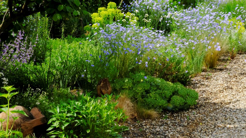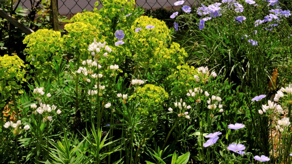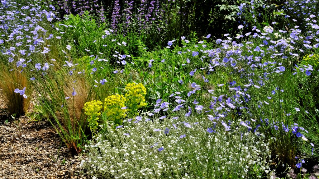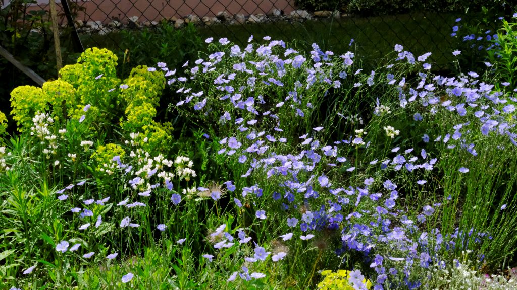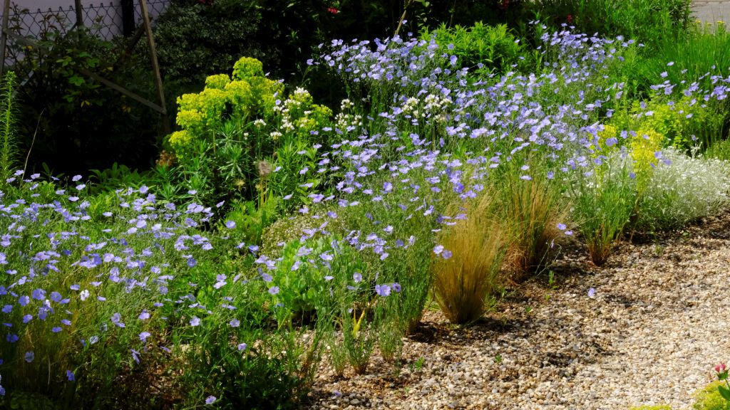 Im Kiesgarten indessen tobt das Leben. Linum perenne, der Staudenlein hat überall seine Kinder verteilt und blüht mit Cerastium tomentosum, dem Hornkraut um die Wette. Seit einigen Tagen hat sich Allium roseum dazugesellt…