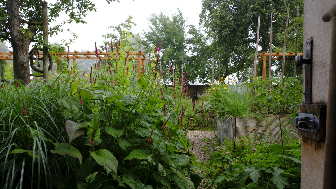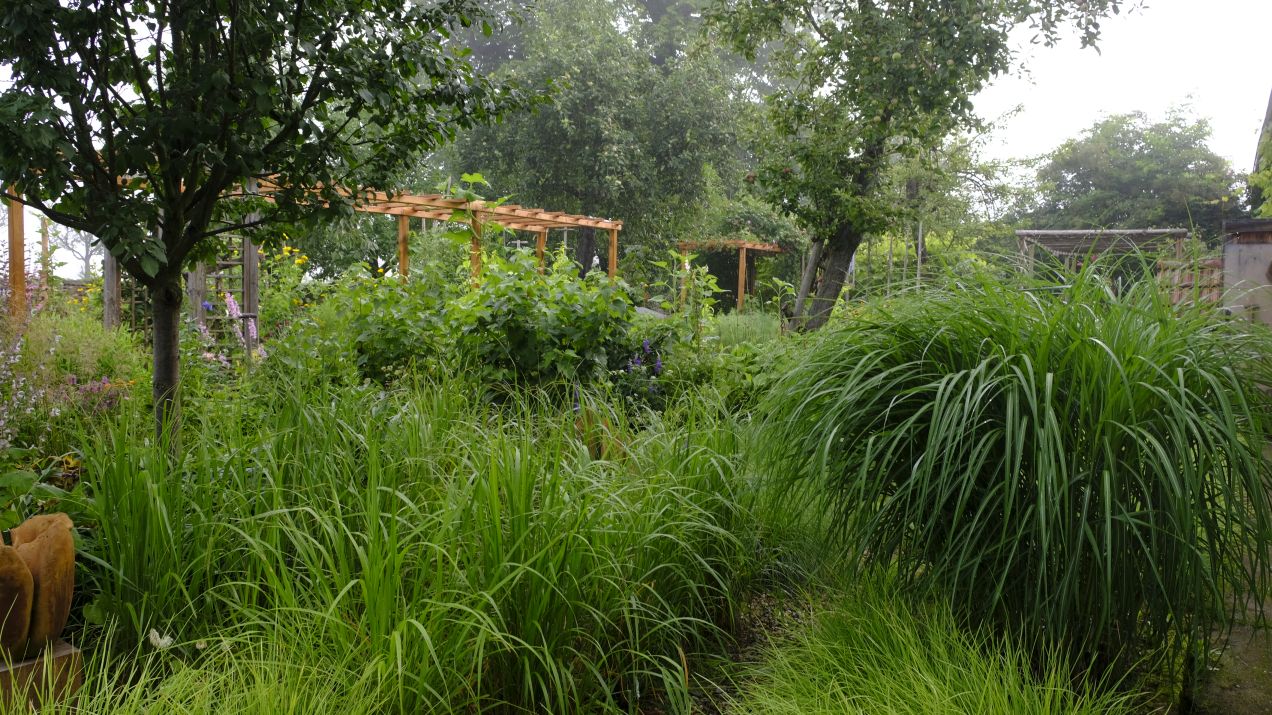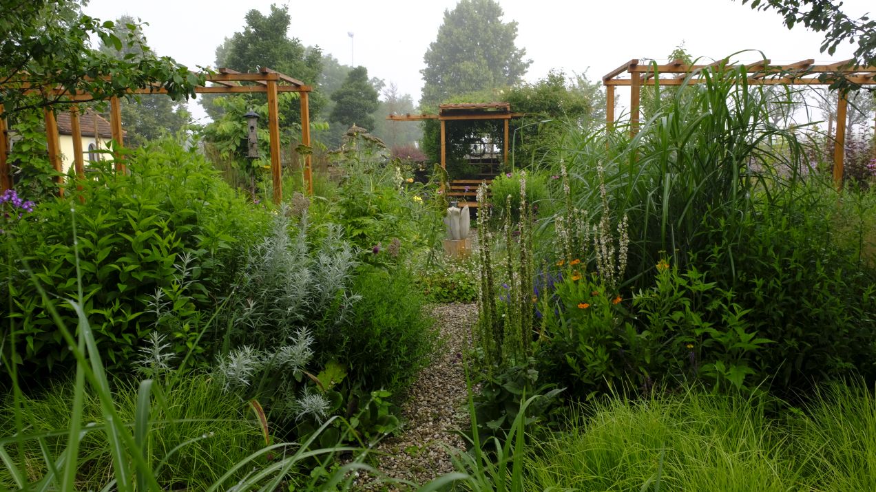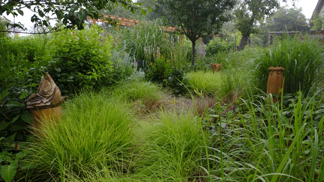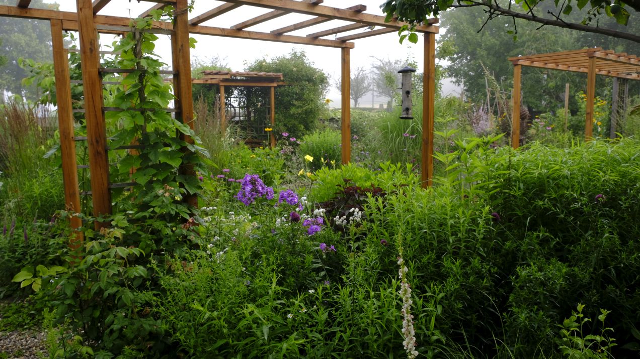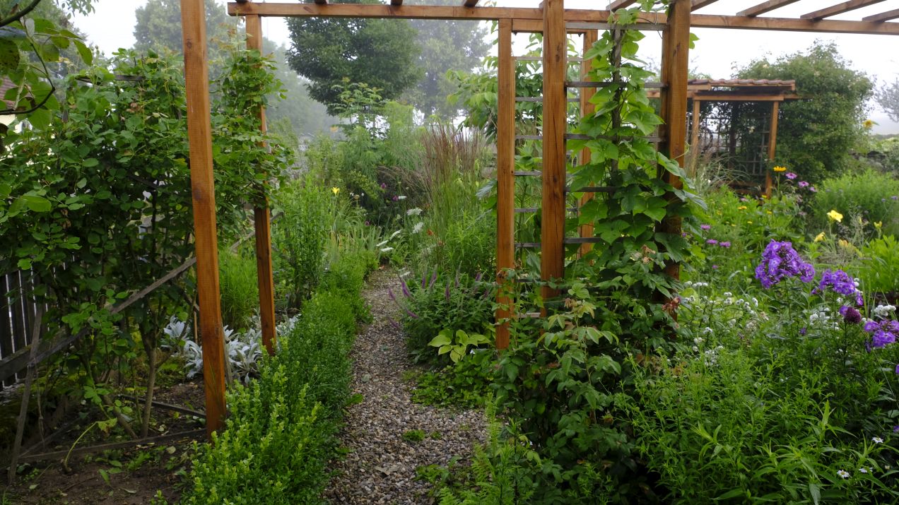 Nach wochenlanger Regenperiode war heute Morgen dichter Nebel über dem Garten. Der Nebel und das üppige Wachstum der letzten Tage verwandelte den Garten in ein wahres Labyrinth. Blüten der Taglilien, Hosta, Echinacea, hellten das Dunkel auf.