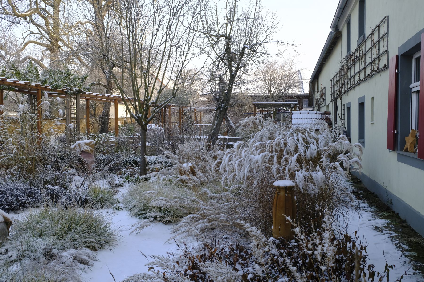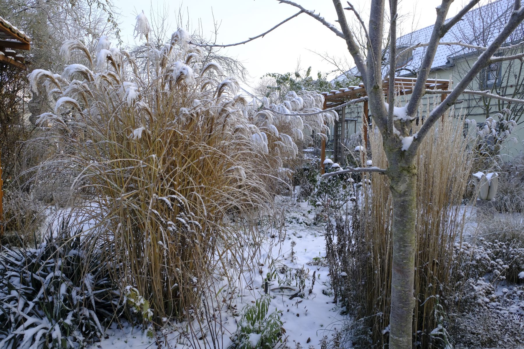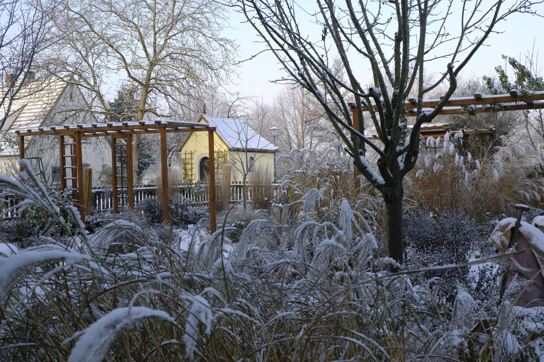 Wer im Herbst auf den Rückschnitt von Stauden und Gräsern verzichtet, bietet der Fauna Futter, Schutz und Rückzugsorte, aber auch wunderbare Winteraspekte. Oft müssen wir wettertechnisch auf diese wunderbaren Bilder verzichten, aber in diesem Jahr haben wir Glück und starten eine Bilderflut! Mit zweistelligen Minusgraden bekamen kürzlich auch unsere neuen Zistrosen und andere empfindlichen Gewächse einen entsprechenden Schutz.