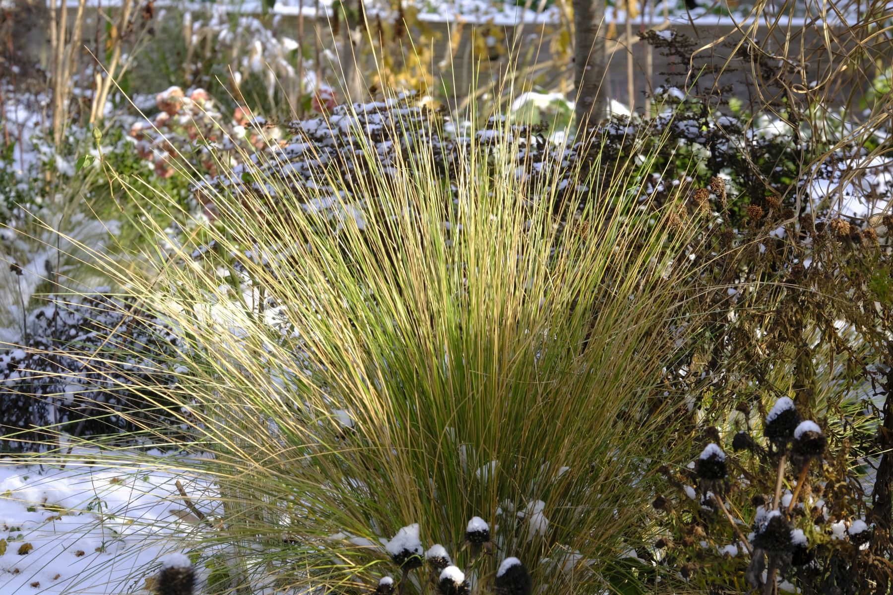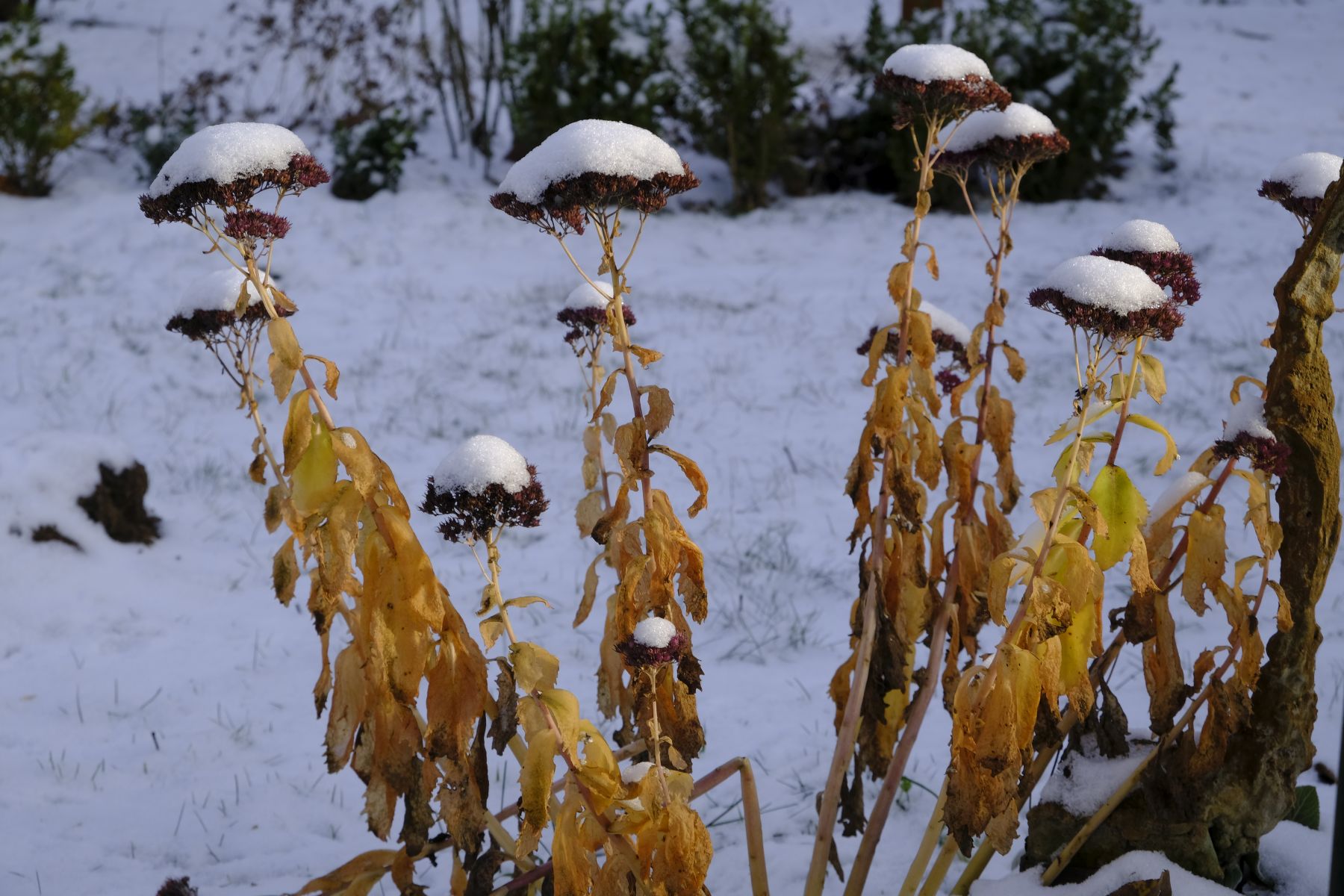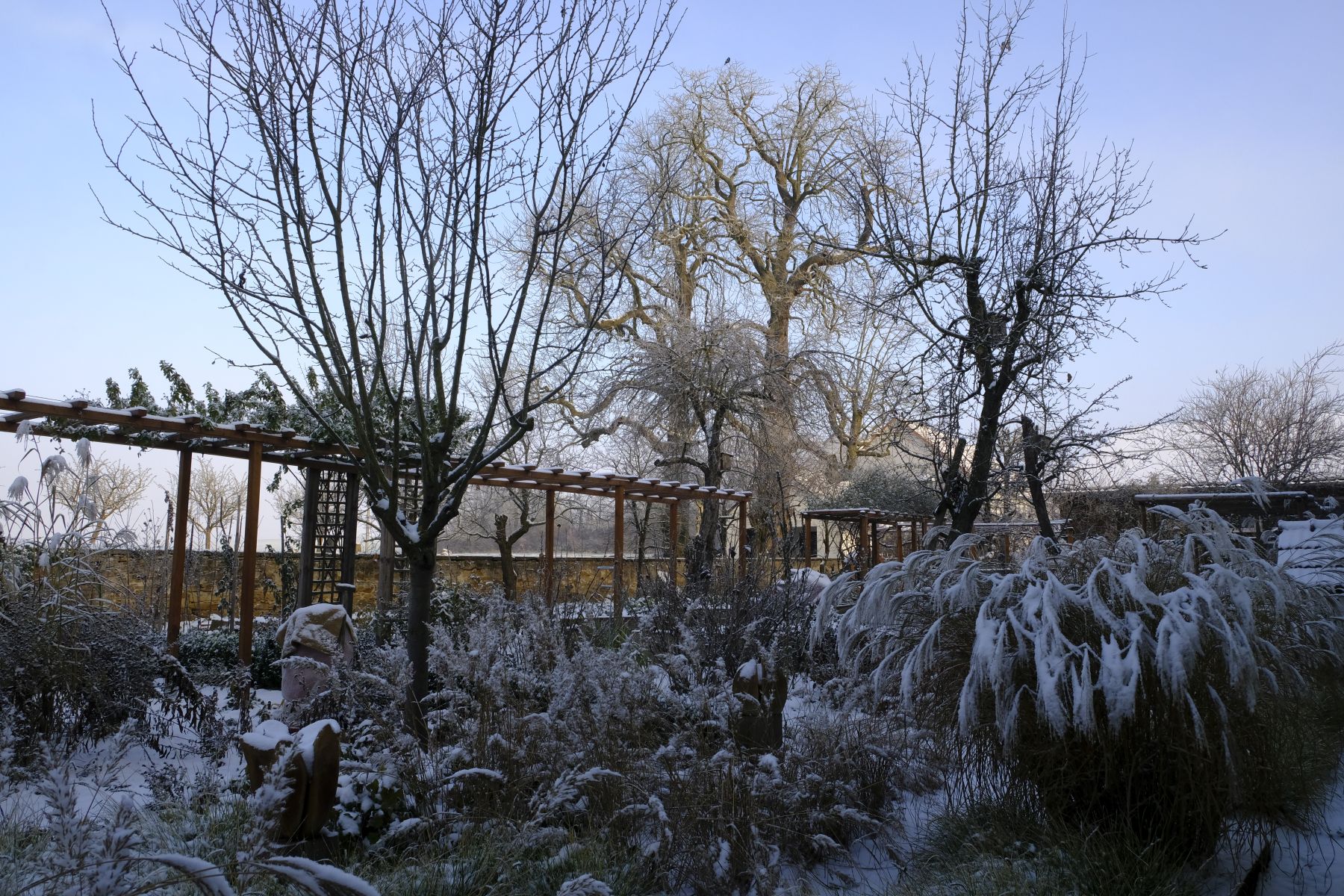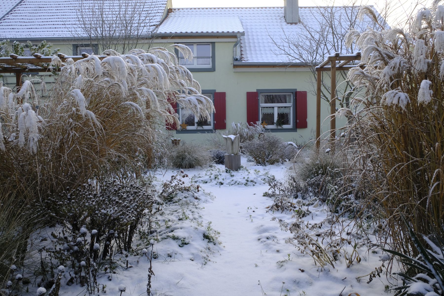Wer im Herbst auf den Rückschnitt von Stauden und Gräsern verzichtet, bietet der Fauna Futter, Schutz und Rückzugsorte, aber auch wunderbare Winteraspekte. Oft müssen wir wettertechnisch auf diese wunderbaren Bilder verzichten, aber in diesem Jahr haben wir Glück und starten eine Bilderflut! Mit zweistelligen Minusgraden bekamen kürzlich auch unsere neuen Zistrosen und andere empfindlichen Gewächse einen entsprechenden Schutz.