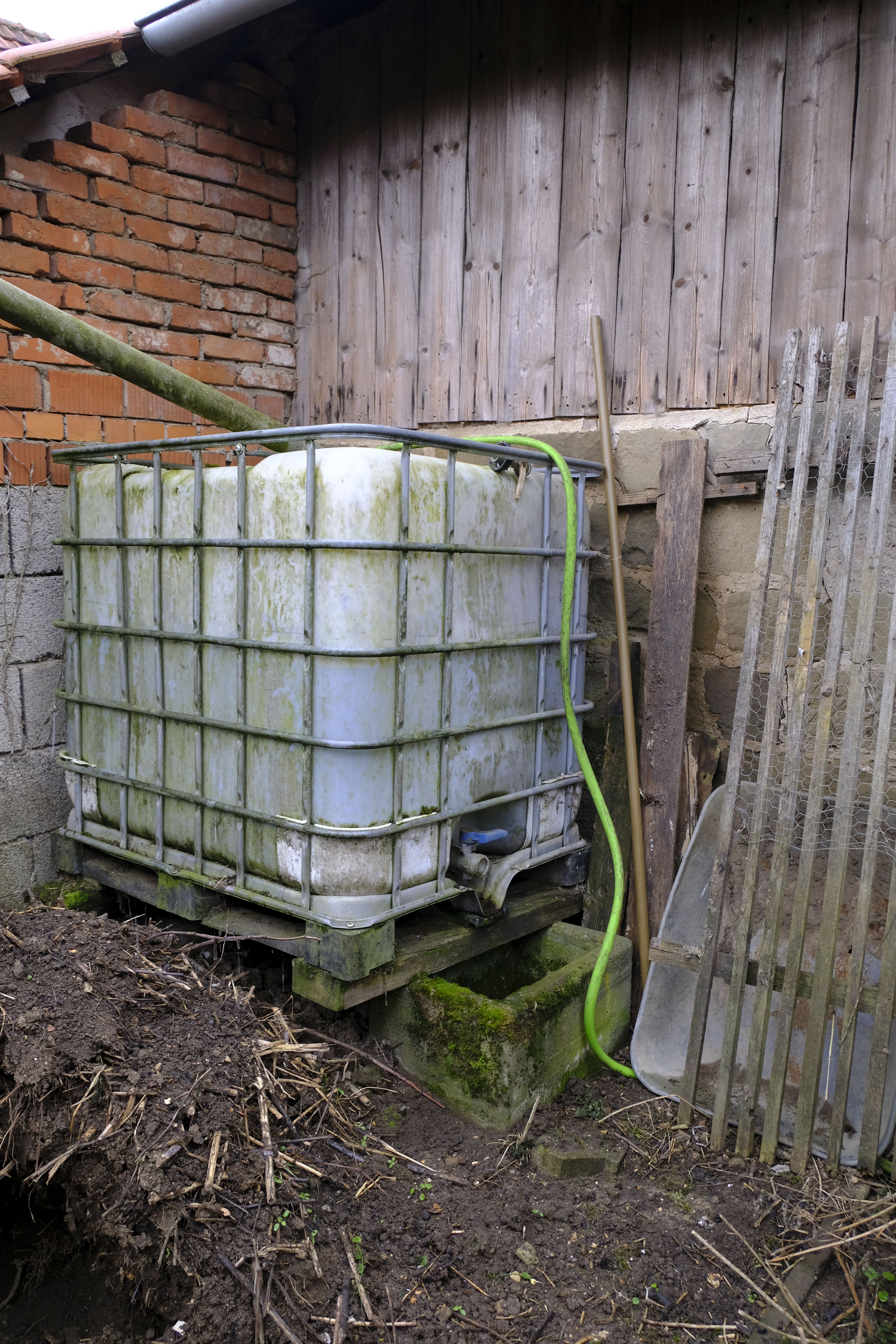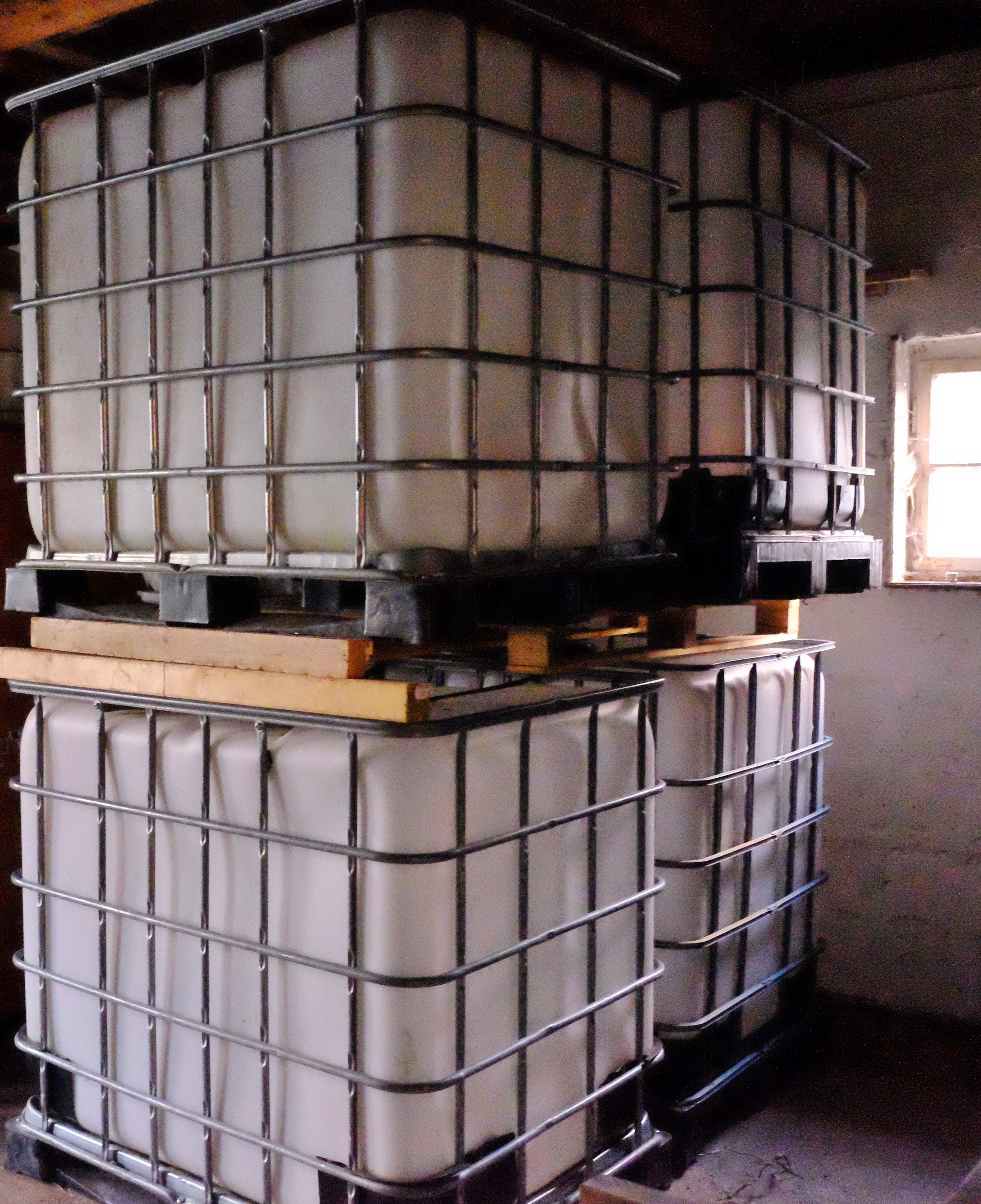 Vor fünf Jahren haben wir eine günstige Gelegenheit genutzt und uns einige große Eichenfässer zugelegt. Sie sehen viel besser als Kunststofffässer aus und halten lange! Mit einem Fassungsvermögen von ca. 800 l pro Fass kommt man schon eine Weile aus.