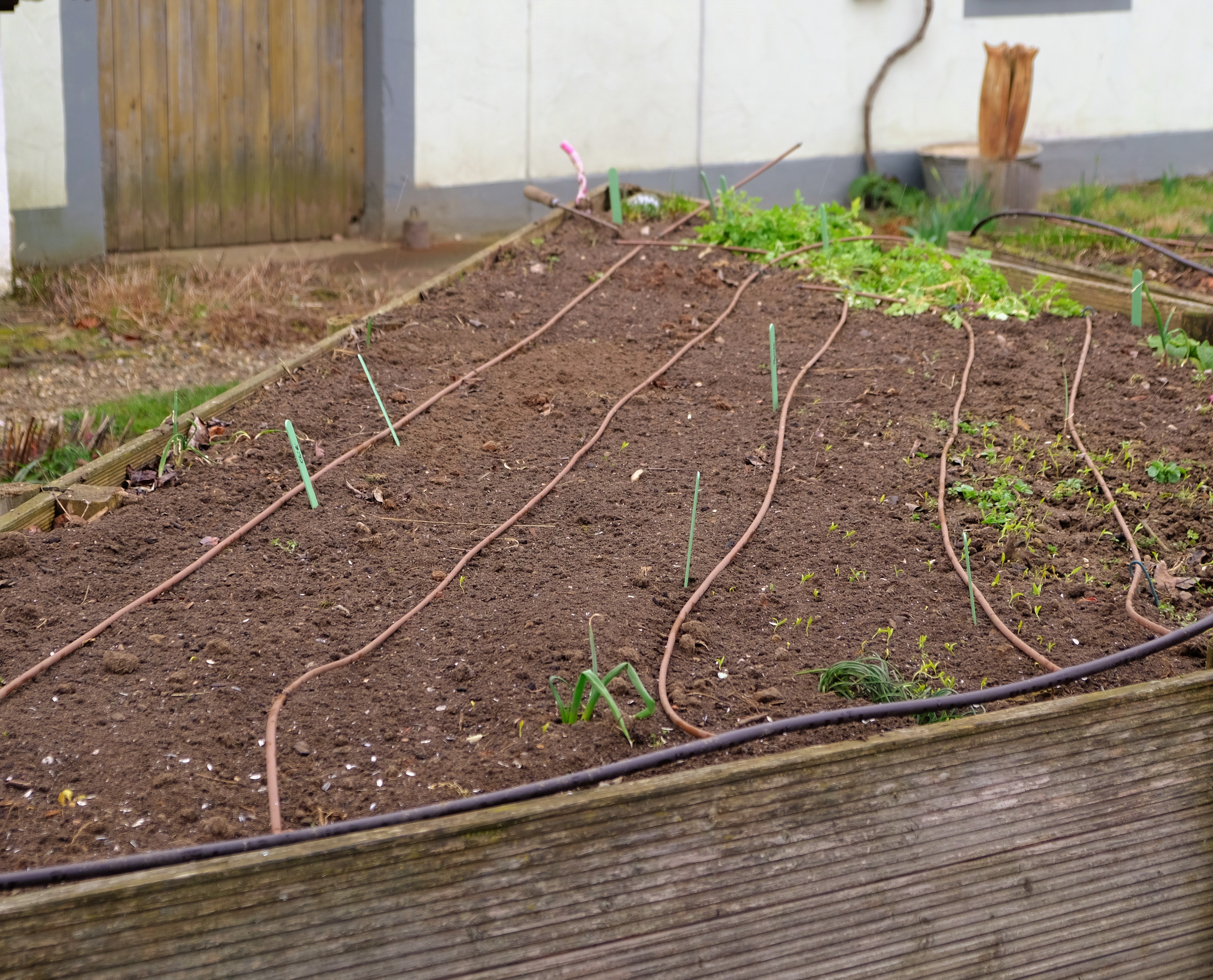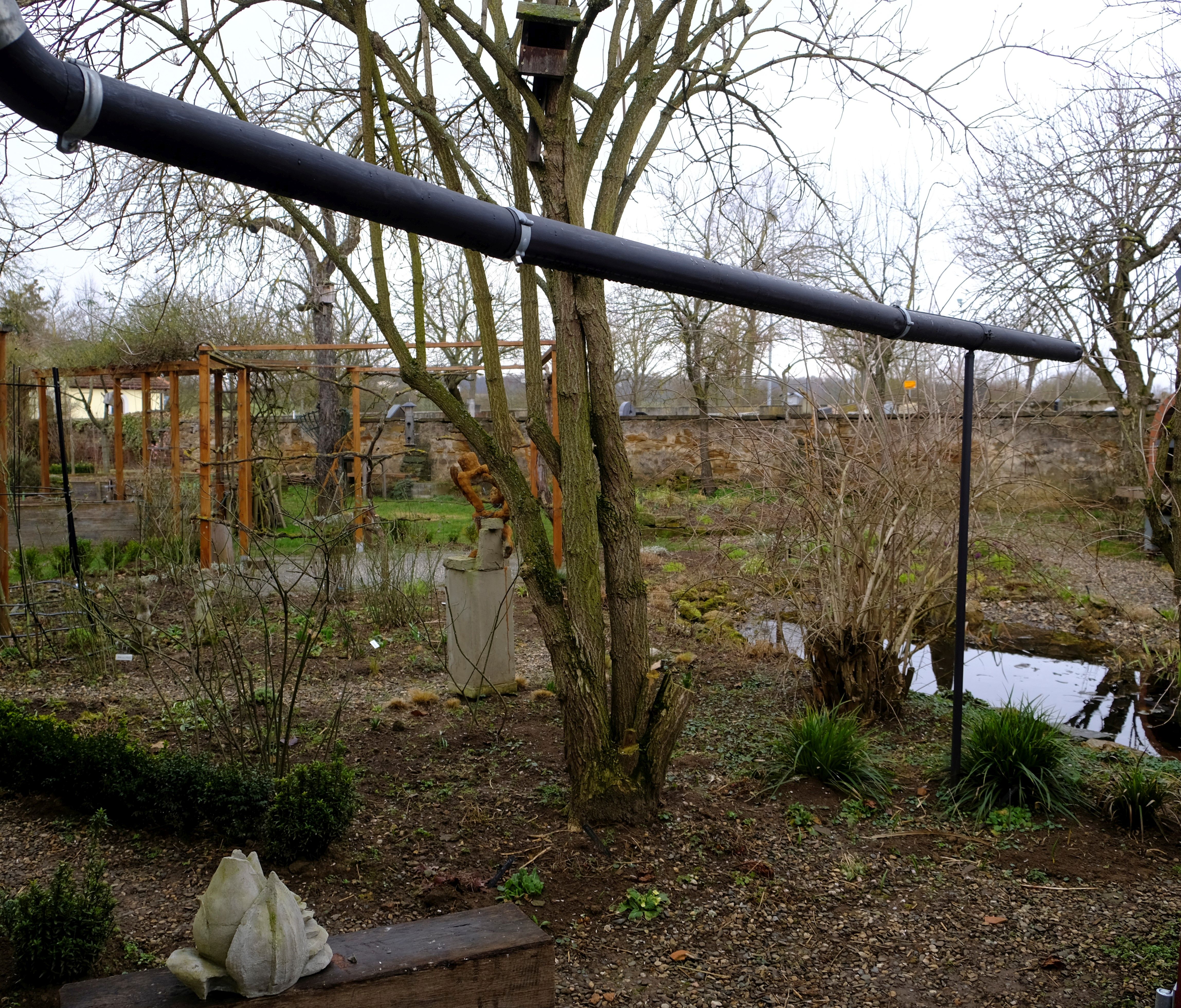 Jetzt wird es langsam Zeit, die Schläuche für die Hochbeete auszulegen und zu prüfen, ob alles läuft. Über die Bewässerung im Küchengarten haben wir bereits berichtet.