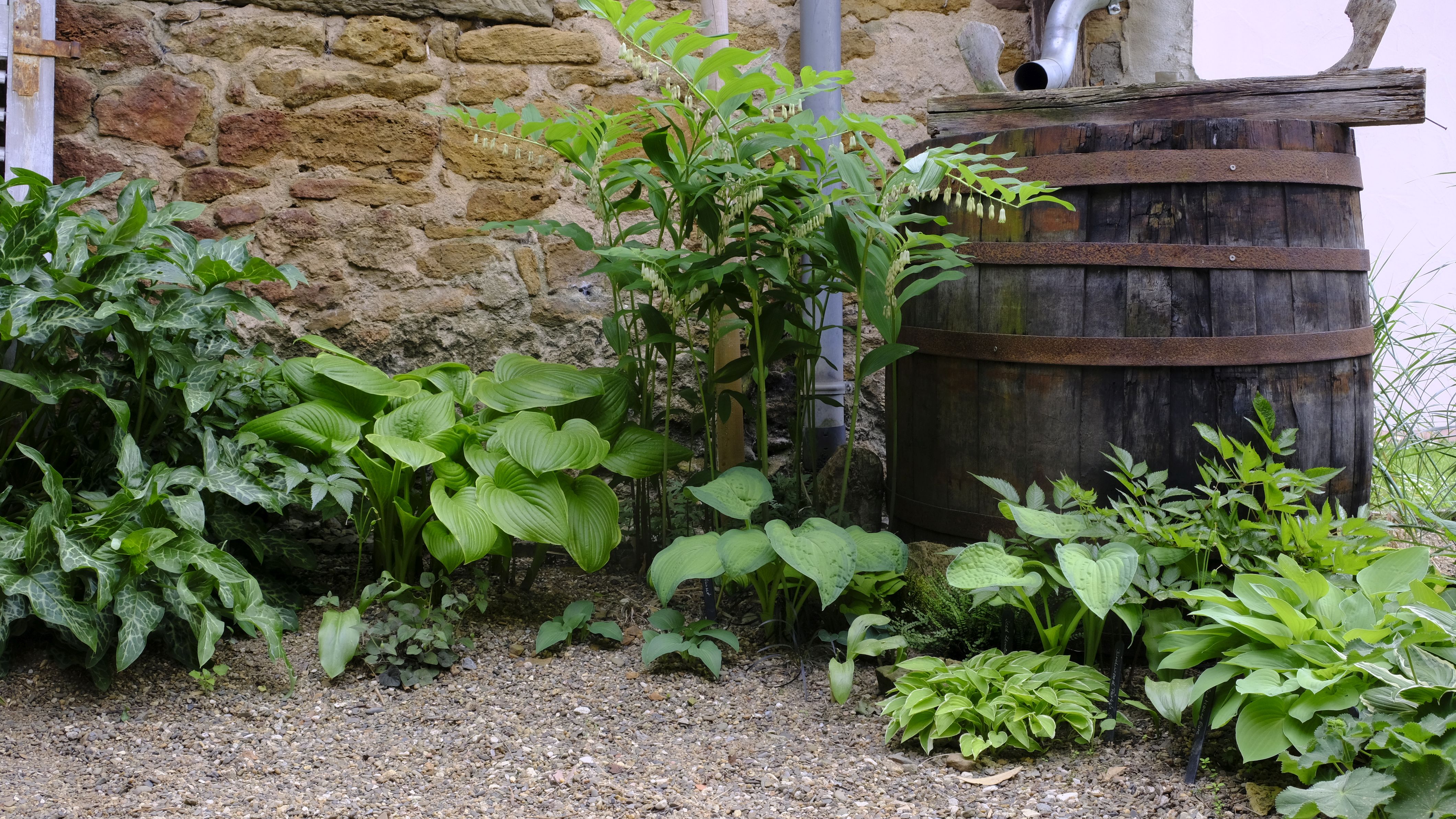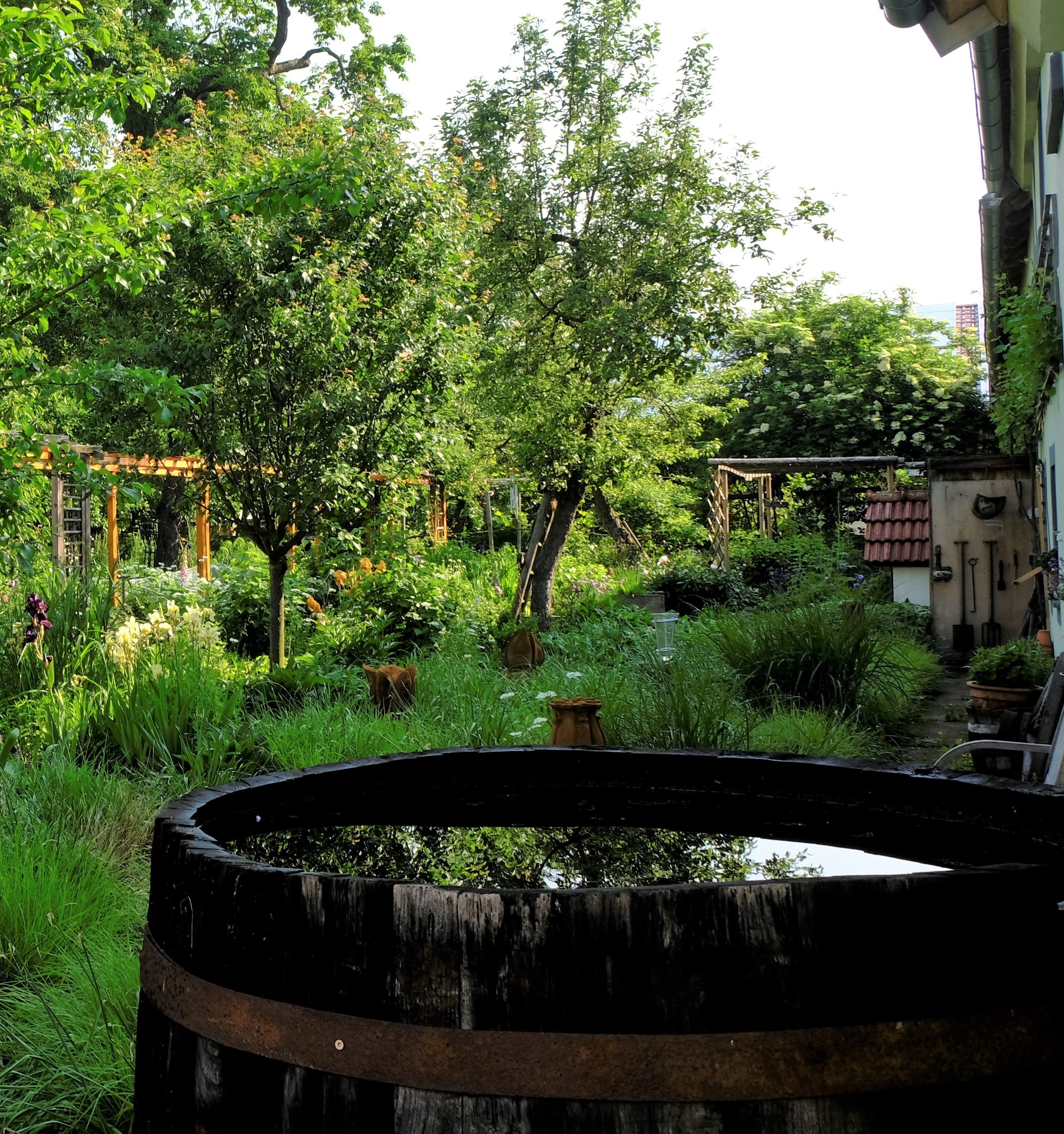 Da es bekanntlich eher im Herbst und Winter regnet, sammeln wir das Wasser und leiten es in große Tanks in der Scheune und im Weinkeller. Bei tagelangem starken Frost decken wir die Fässer allerdings ab, damit sie nicht undicht werden. Auf diese Weise können wir im Frühjahr dem Garten das nötige Nass zurückgeben, da es gerade dann immer sehr trocken und warm ist. Das Wasser, was im Spätsommer und Herbst gesammelt wird, kommt sofort wieder an die Gehölze und Stauden zur intensiven Bewässerung der tieferliegenden Schichten.
