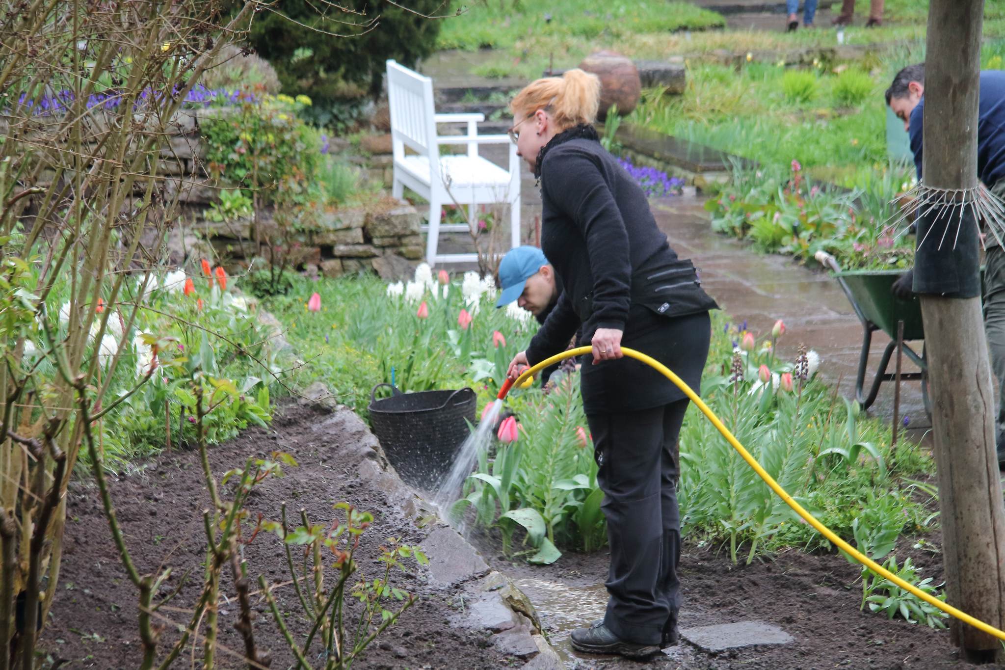 Im nächsten Jahr jährt sich der Geburtstag Karl Foersters zum 150. Mal und viele Besucher werden sich den historischen Senkgarten und das inzwischen liebevoll restaurierte Wohnhaus des bekannten Staudenzüchters ansehen. Alle Staudenbeete werden immer mal wieder von Beikräutern befreit und dabei möchten wir helfen. Es regnete zeitweise und es war recht kühl. Alle Helfer und Chefgärtnerin Kristina Scheller waren trotzdem guter Dinge und in einigen Stunden bot sich uns ein zufriedenstellendes Bild. Gemeinsam schafft man viel und freut sich bei Kaffee und Gebäck an sichtbarem Erfolg.