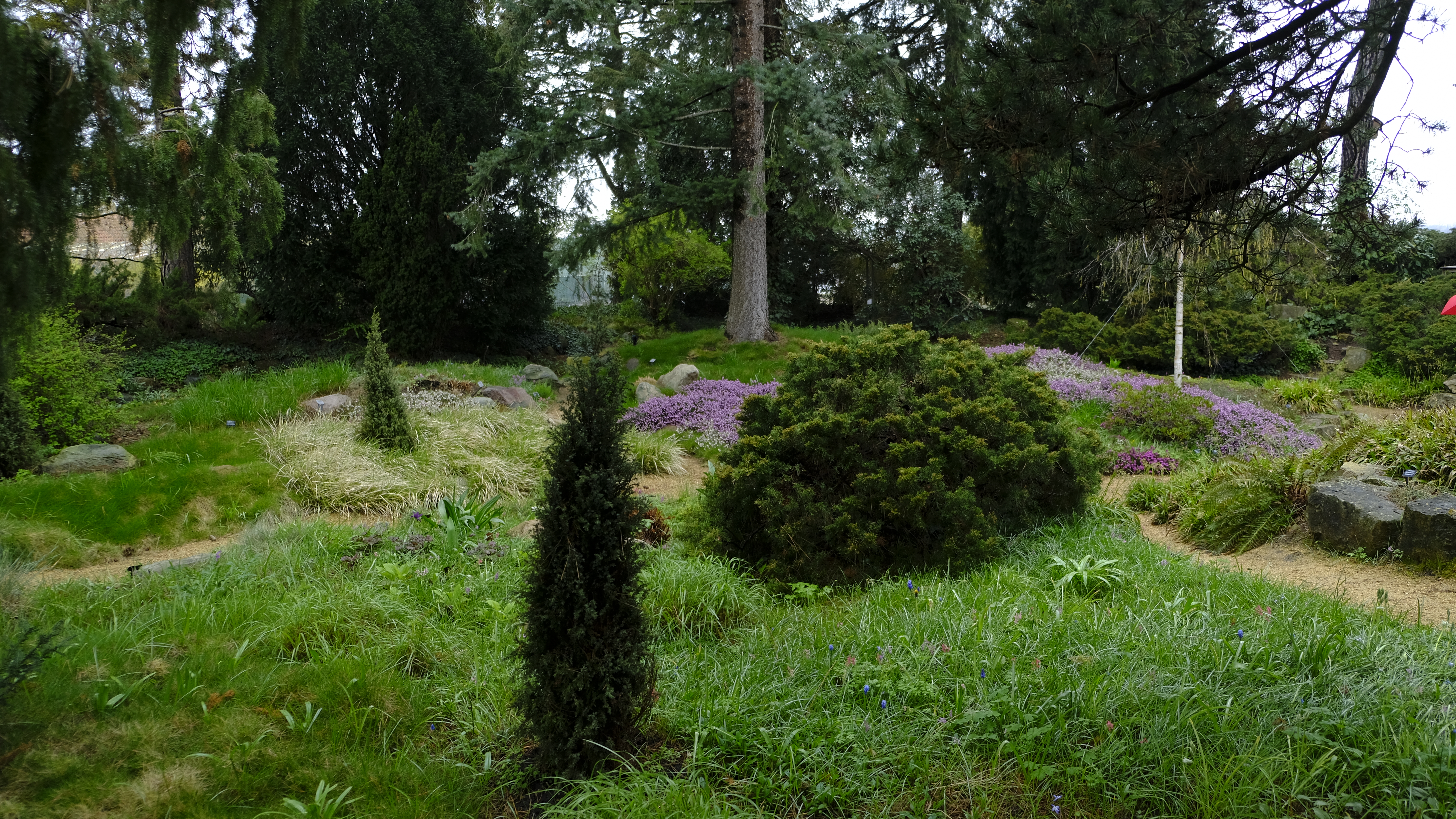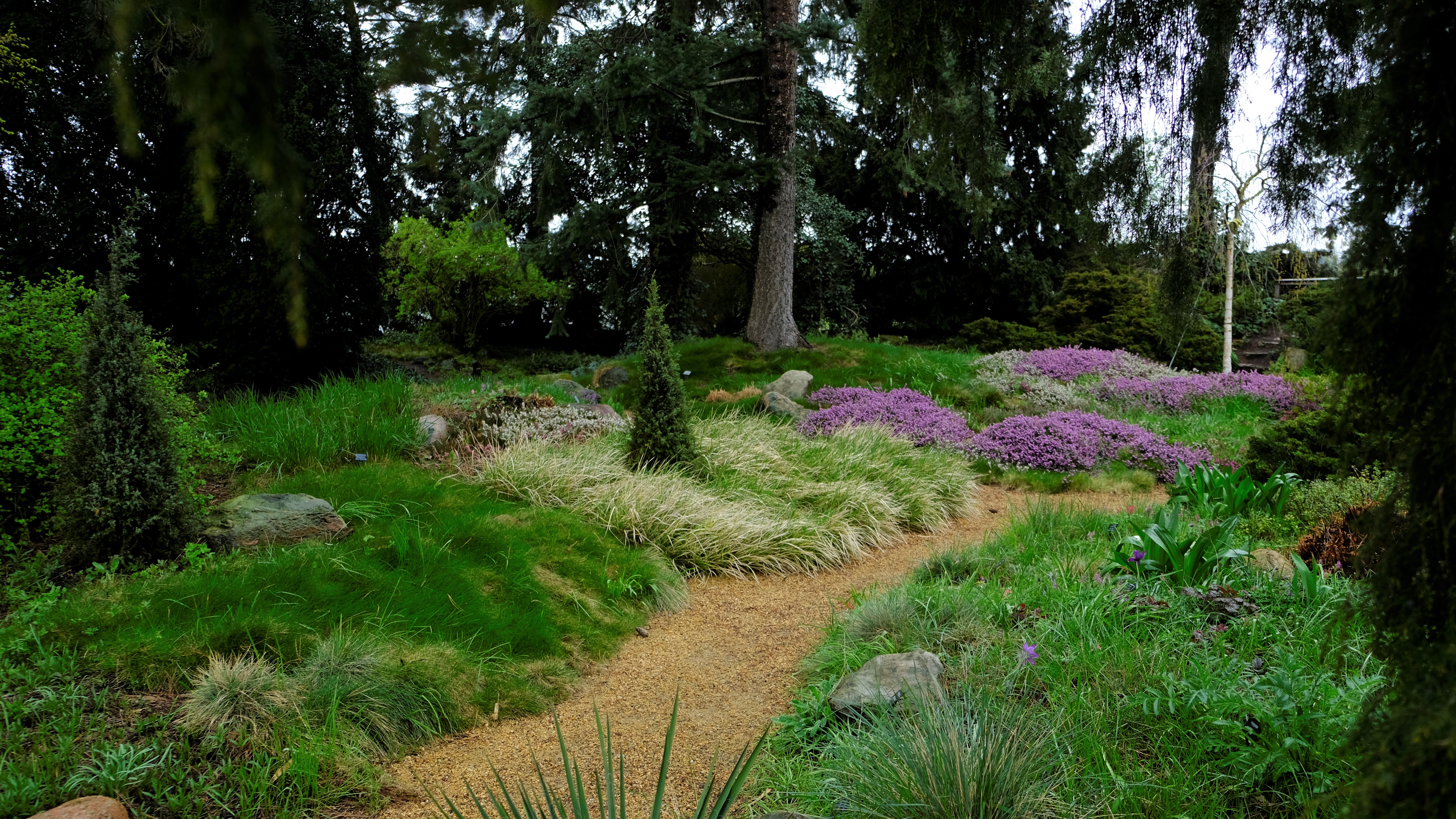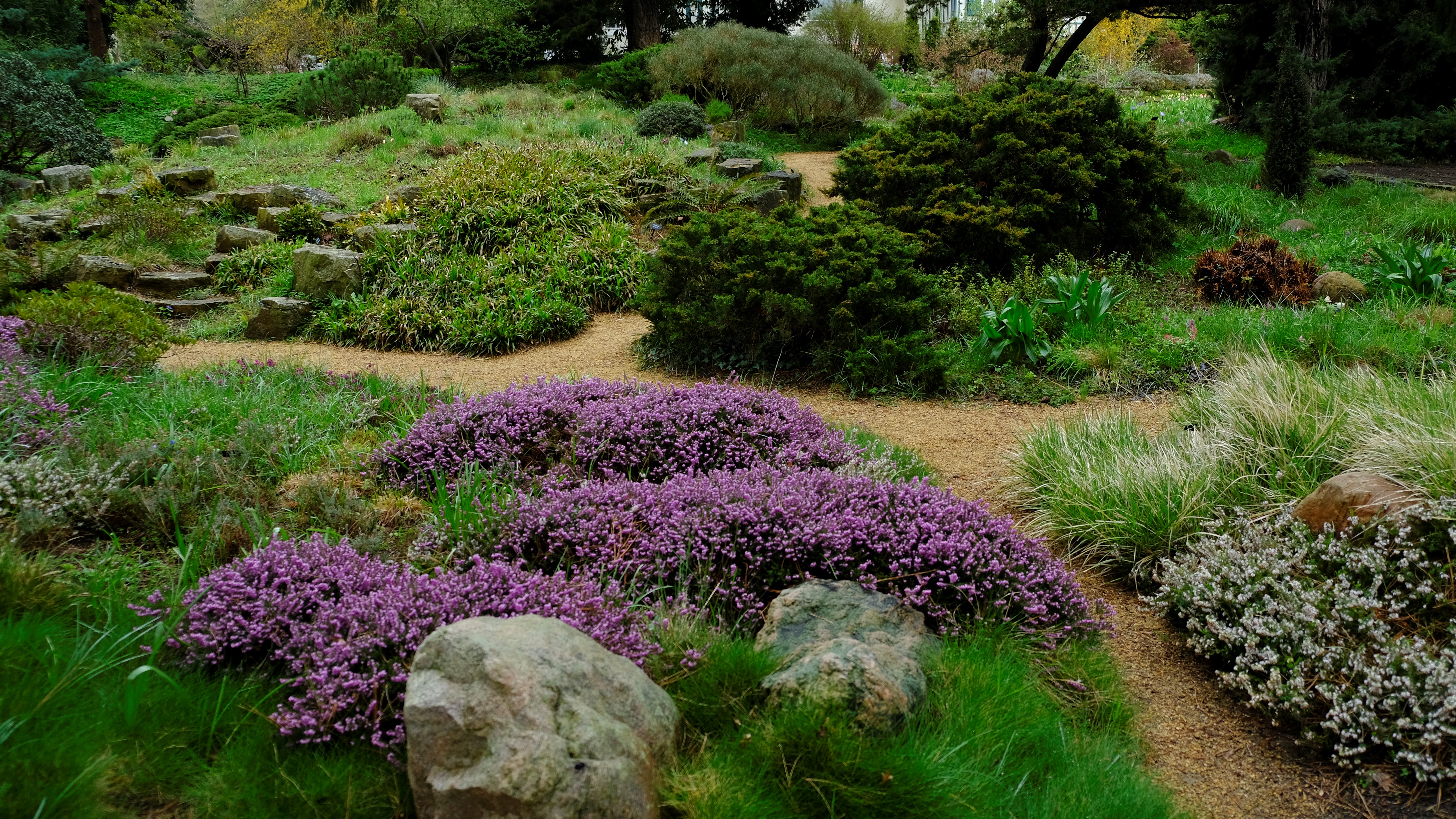 Den Steingarten mit seinem abwechslungsreichen Geländeprofil und geschwungenen Wegen mussten wir uns diesmal genauer ansehen. Vielfältiges Grün und bunte Heideflächen betonen die wunderbare Gestaltung.