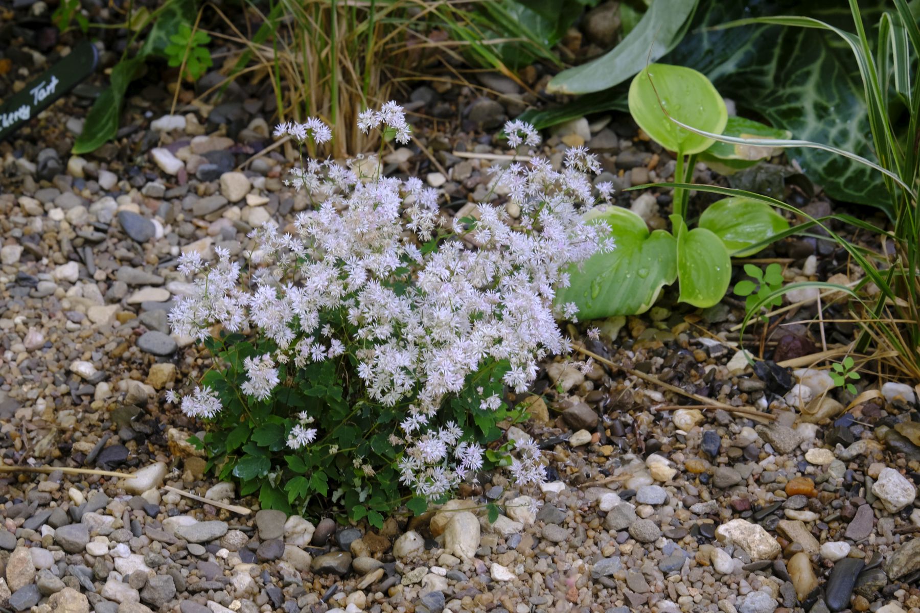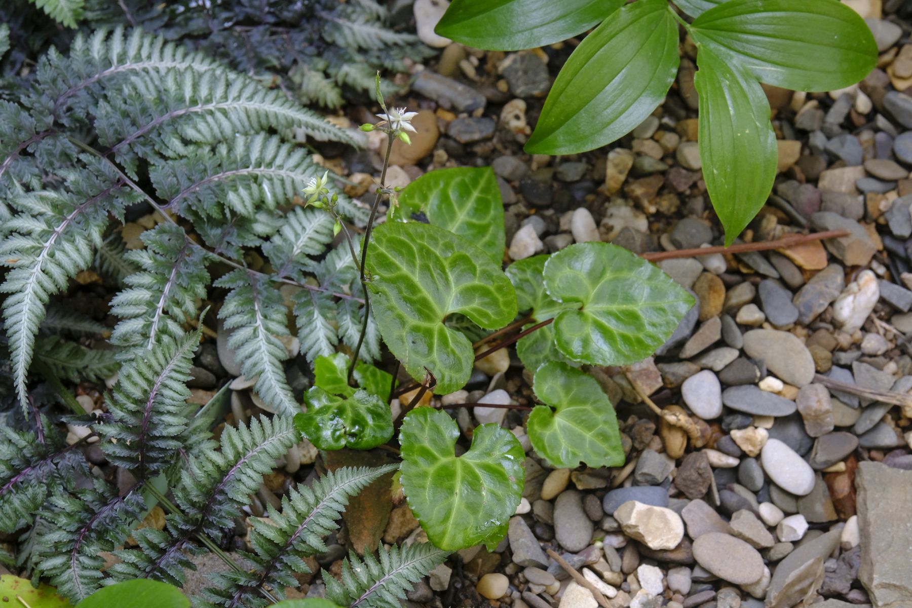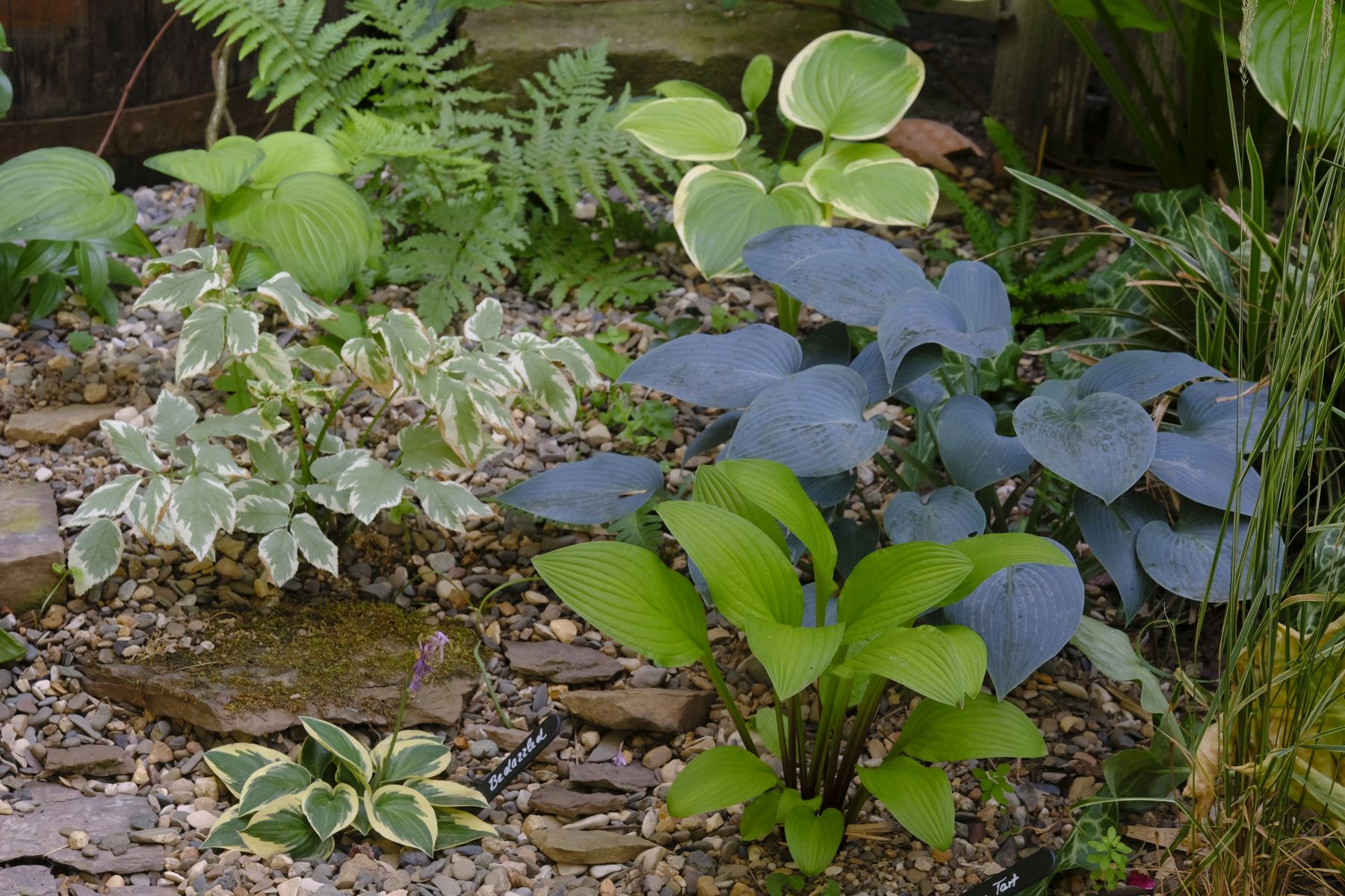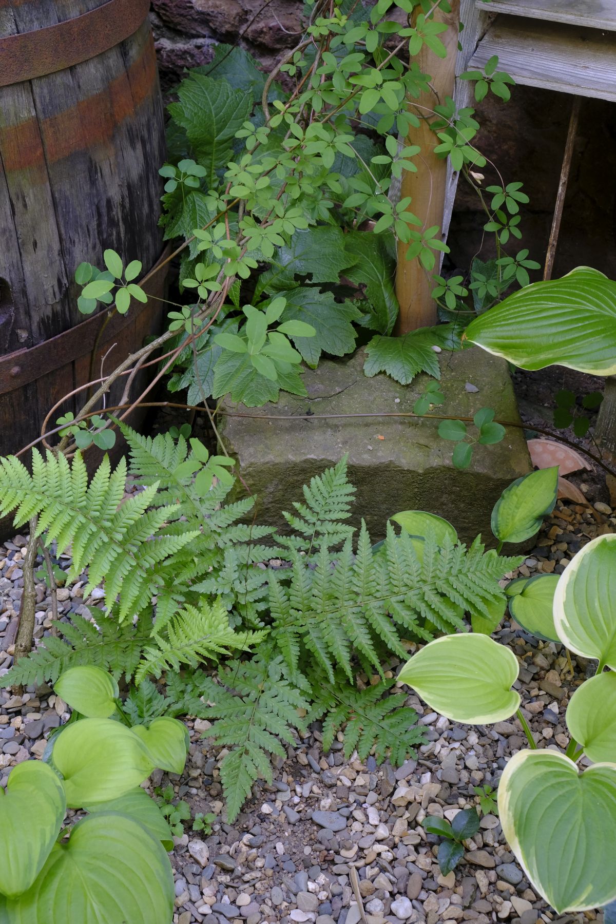 Mehrfach haben wir schon über unsere kleine Sammlung von Schattenpflanzen berichtet. Sie befindet sich am Ende des Eingangsbereich, den wir aus optischen Gründen wie die gesamte Fläche bereits 2018 mit Kies als mineralischen Mulch versehen hatten. Mancher findet den Anblick ungewöhnlich, wir aber schätzen die Vorzüge, brauchen uns hier nicht um Wasser oder Schnecken kümmern. Diese Stelle war im Gegensatz zum vorderen, sonnigen Teil wegen einer Wasserader und auch einem früheren Brunnen immer etwas feucht. Jetzt können wir problemlos die Fläche jederzeit betreten, ohne auszurutschen oder einzusinken. Eine Pergola zur zusätzlichen Beschattung wird durch eine Akebia quinata und eine Clematis gouriana bot. Art berankt.