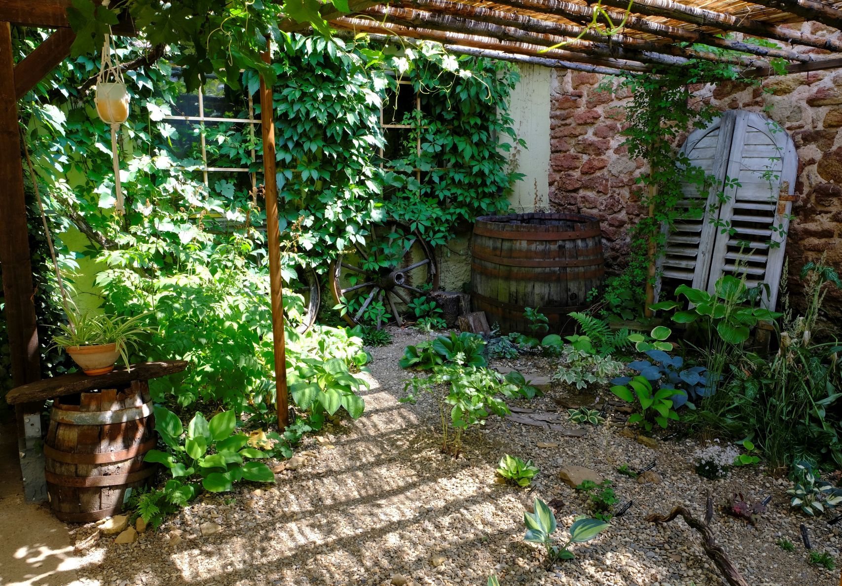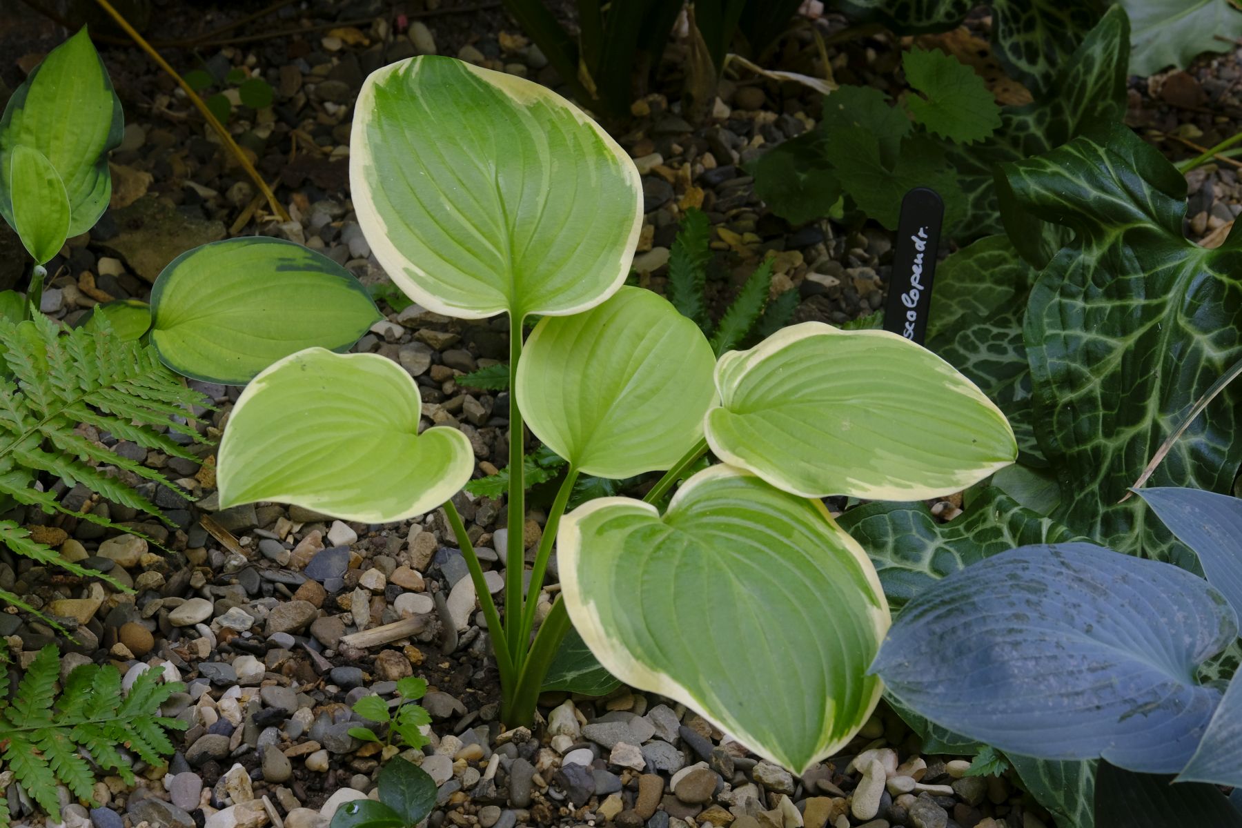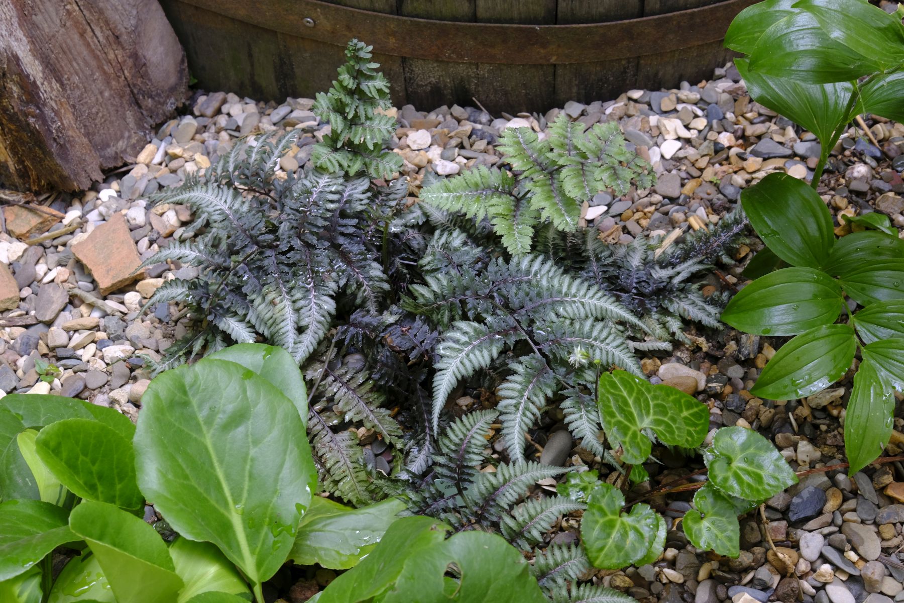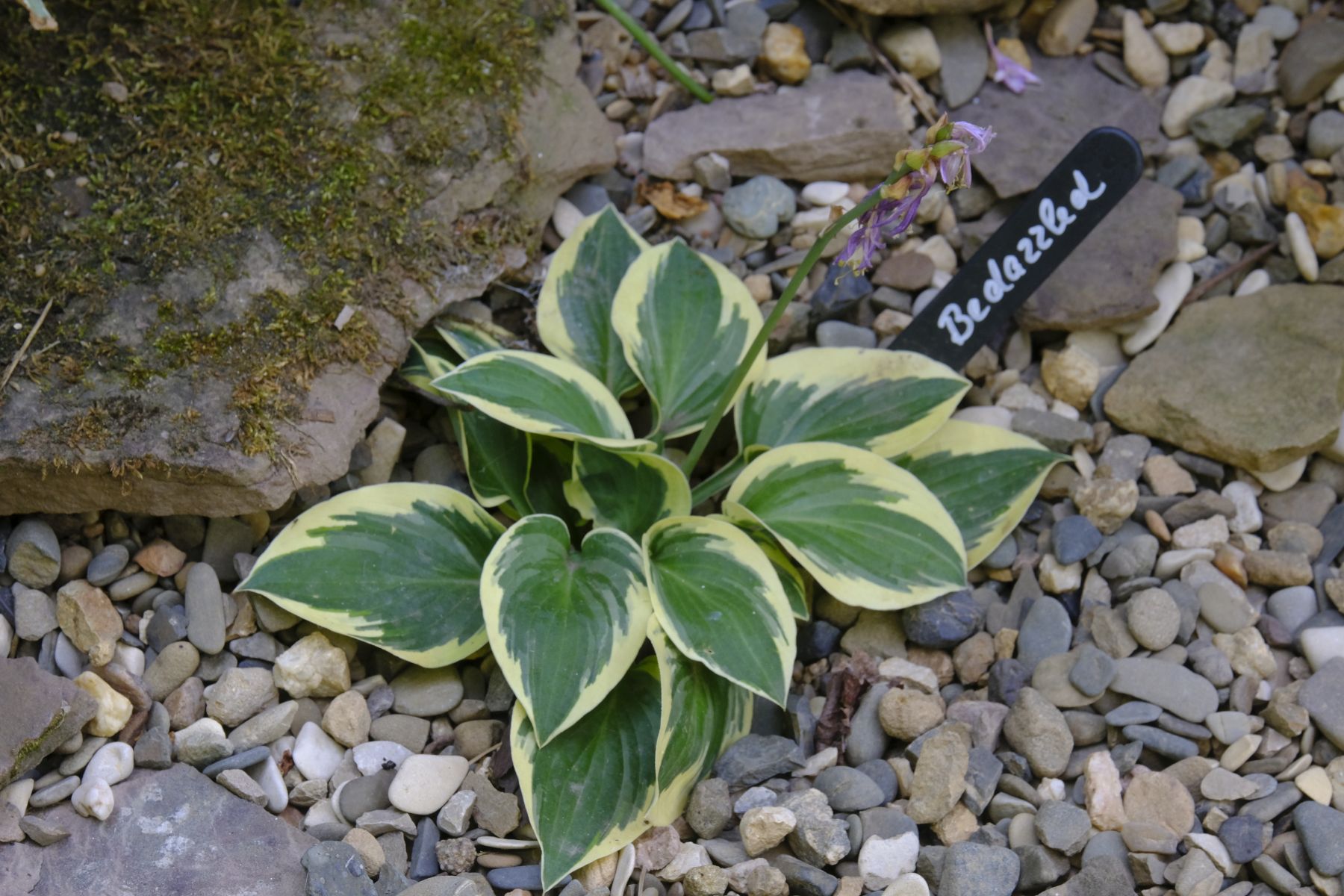 Mehrfach haben wir schon über unsere kleine Sammlung von Schattenpflanzen berichtet. Sie befindet sich am Ende des Eingangsbereich, den wir aus optischen Gründen wie die gesamte Fläche bereits 2018 mit Kies als mineralischen Mulch versehen hatten. Mancher findet den Anblick ungewöhnlich, wir aber schätzen die Vorzüge, brauchen uns hier nicht um Wasser oder Schnecken kümmern. Diese Stelle war im Gegensatz zum vorderen, sonnigen Teil wegen einer Wasserader und auch einem früheren Brunnen immer etwas feucht. Jetzt können wir problemlos die Fläche jederzeit betreten, ohne auszurutschen oder einzusinken. Eine Pergola zur zusätzlichen Beschattung wird durch eine Akebia quinata und eine Clematis gouriana bot. Art berankt.