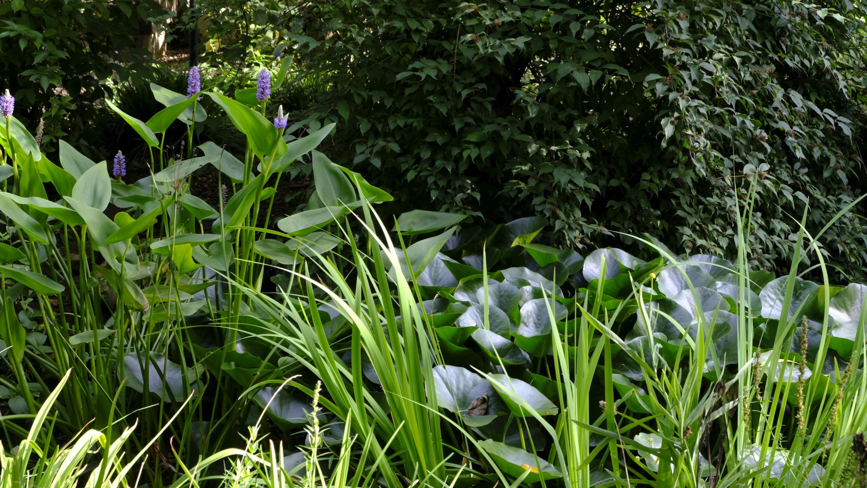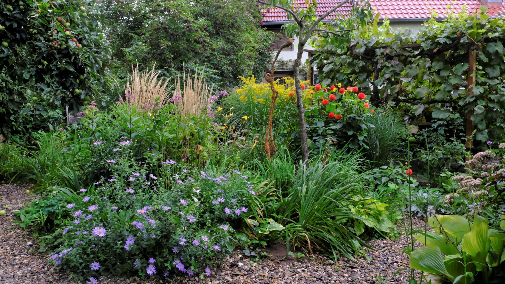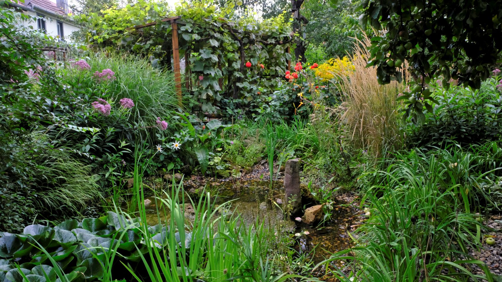 Hinter dem Teich prunkt Rosa canina mit zahlreichen Hagebutten! Sommeraster Aster frikartii ‚Mönch‘ , Goldrute und Dahlien bringen Farbe ins Spiel, während Heuchera villosa var. macrorrhiza und Hosta plantaginea ‚Guacamole‘ mit weißen Blüten sich vornehm zurückhalten.