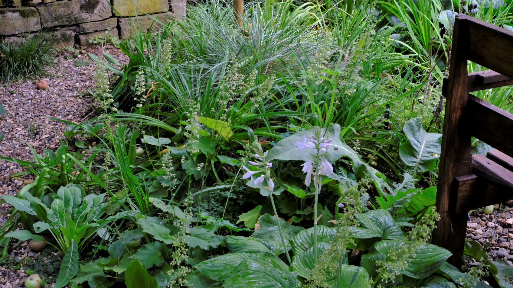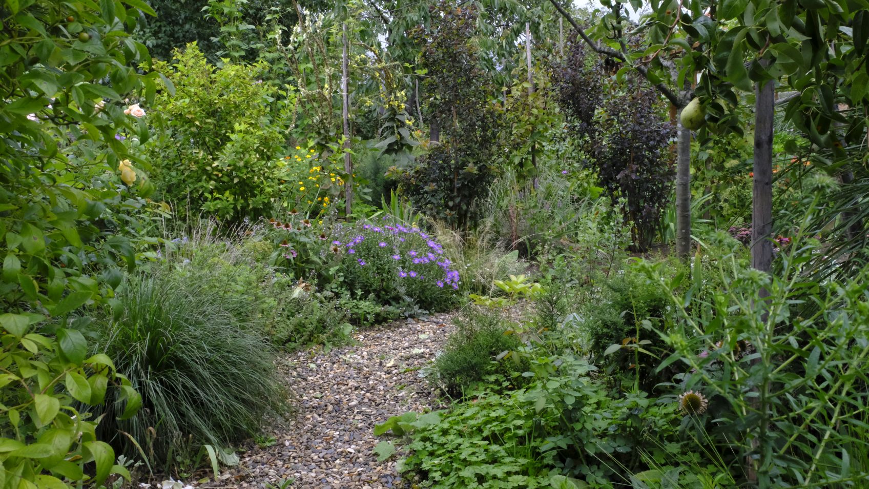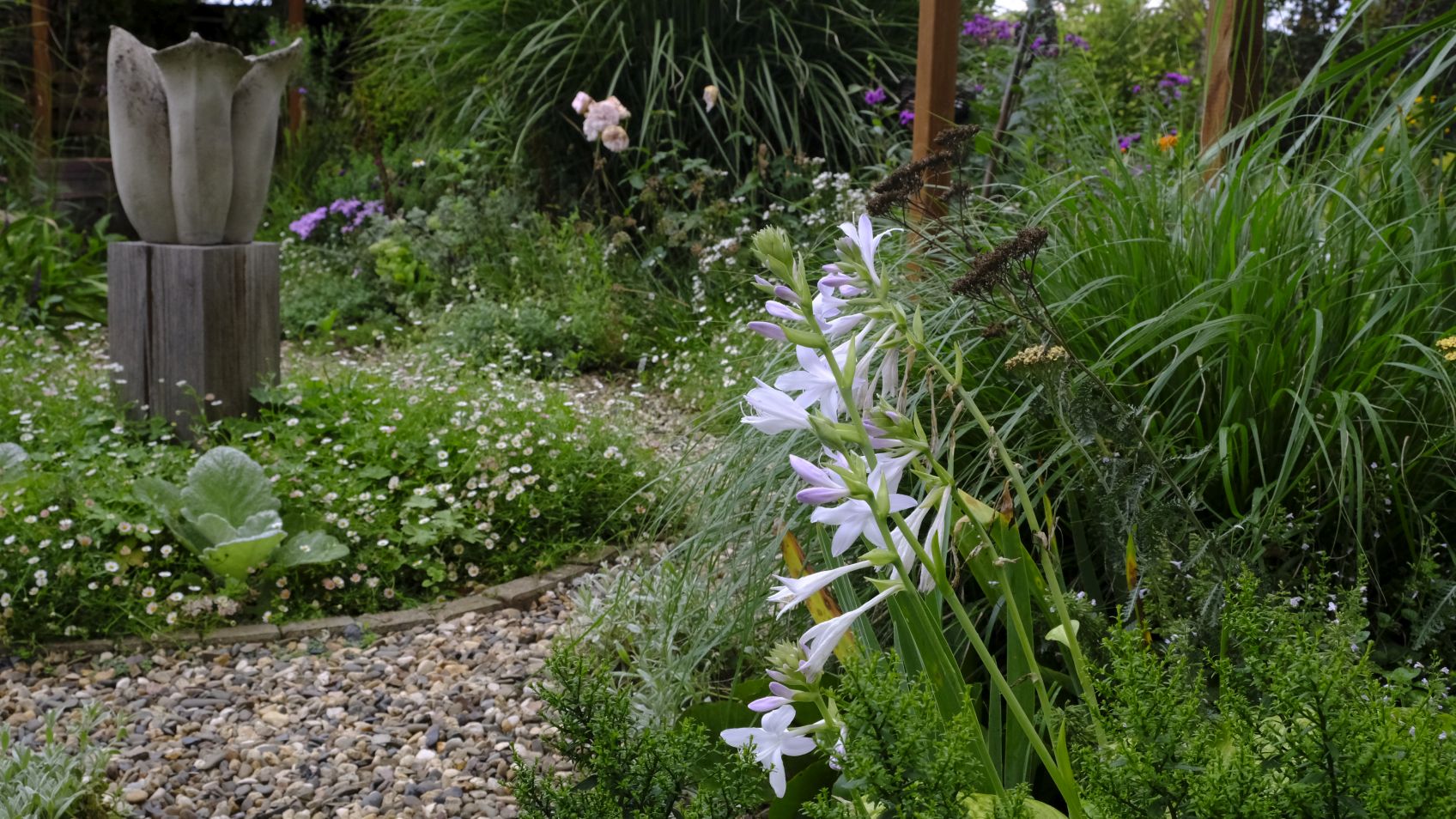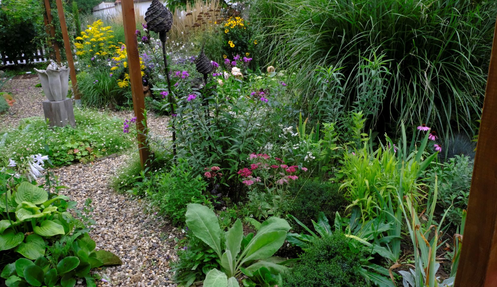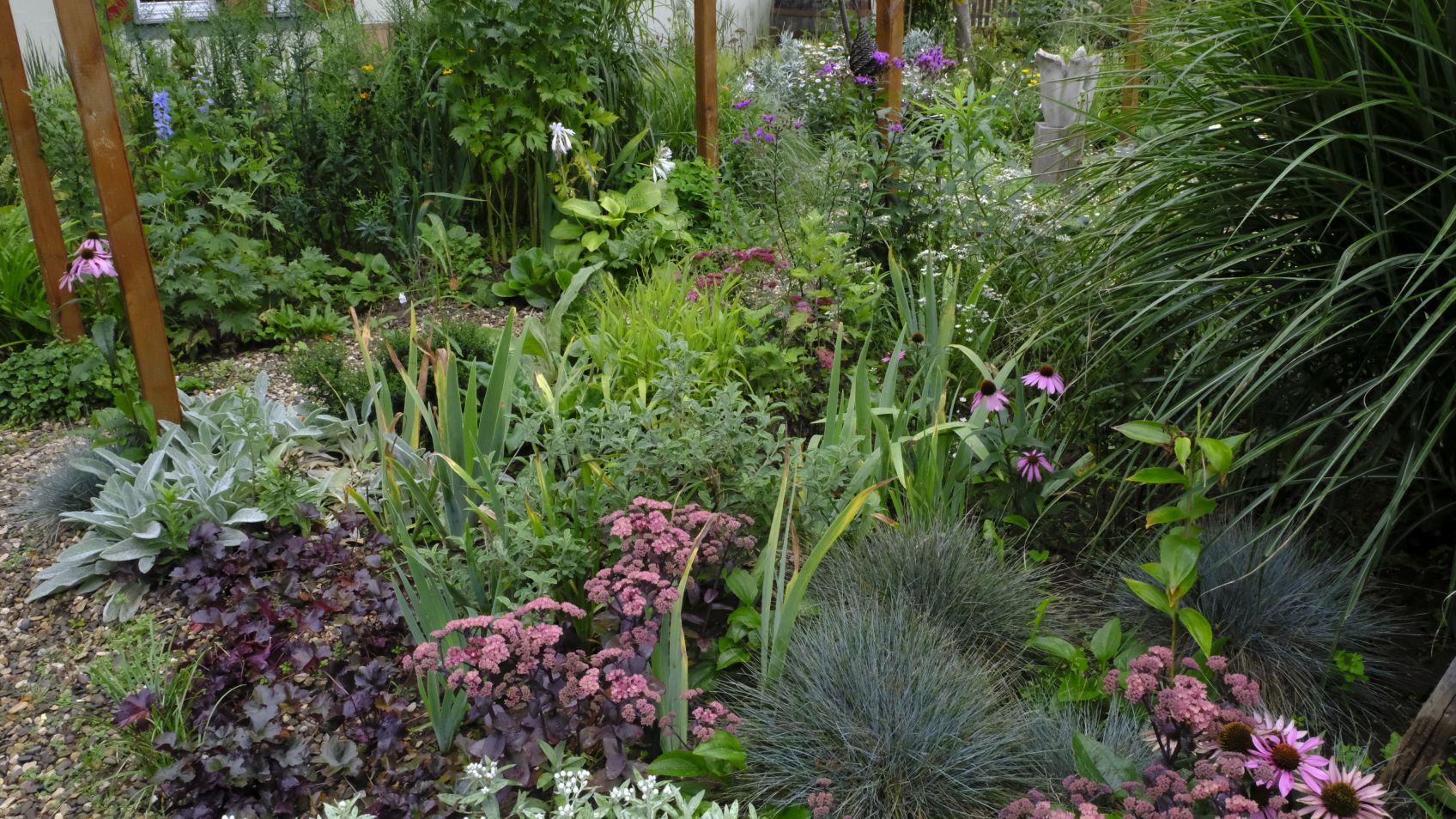 Die Staudenbeete haben sich prächtig entwickelt, warten aber auf Sonne! Goldruten haben sich dazugesellt, mehr als wir geplant haben. Sobald sie verblühen, werden wir hier etwas dezimieren. Ein Hingucker ist das Beet mit Anaphalis triplinervis, Sedum ‚Karfunkelstein‘, Heuchera ‚Obsidian‘ und Festuca cinerea ‚Elijah Blue‘