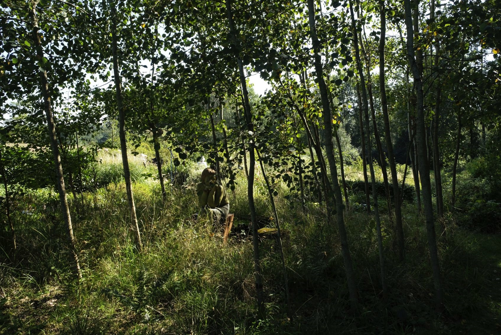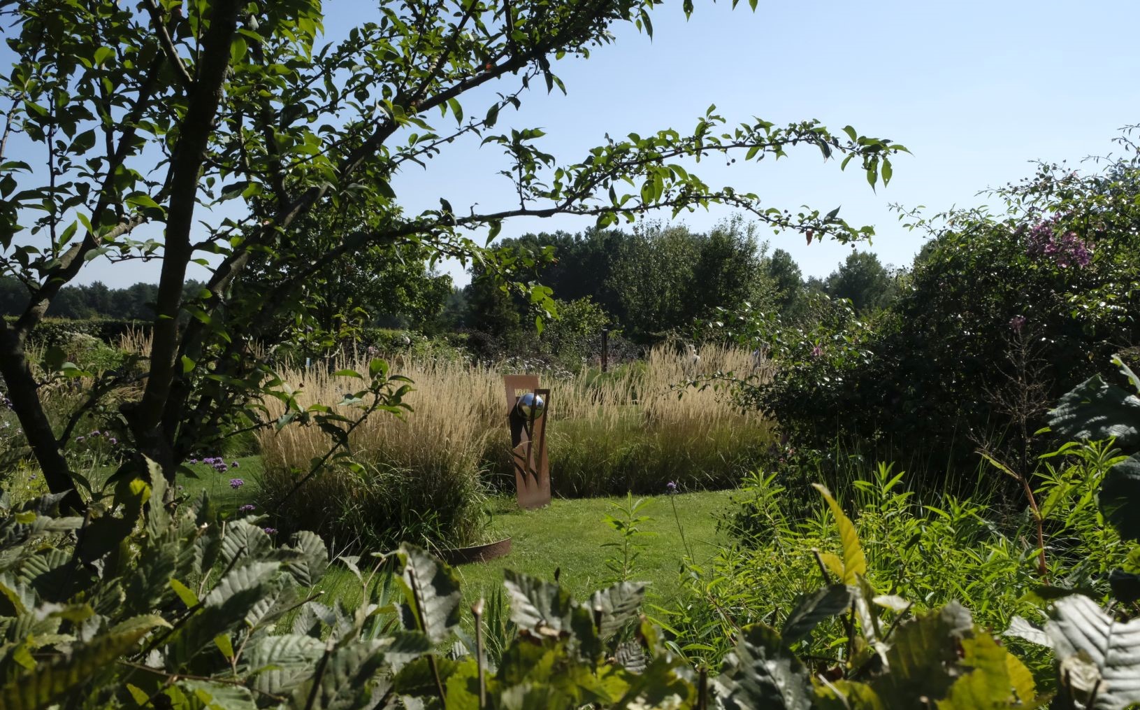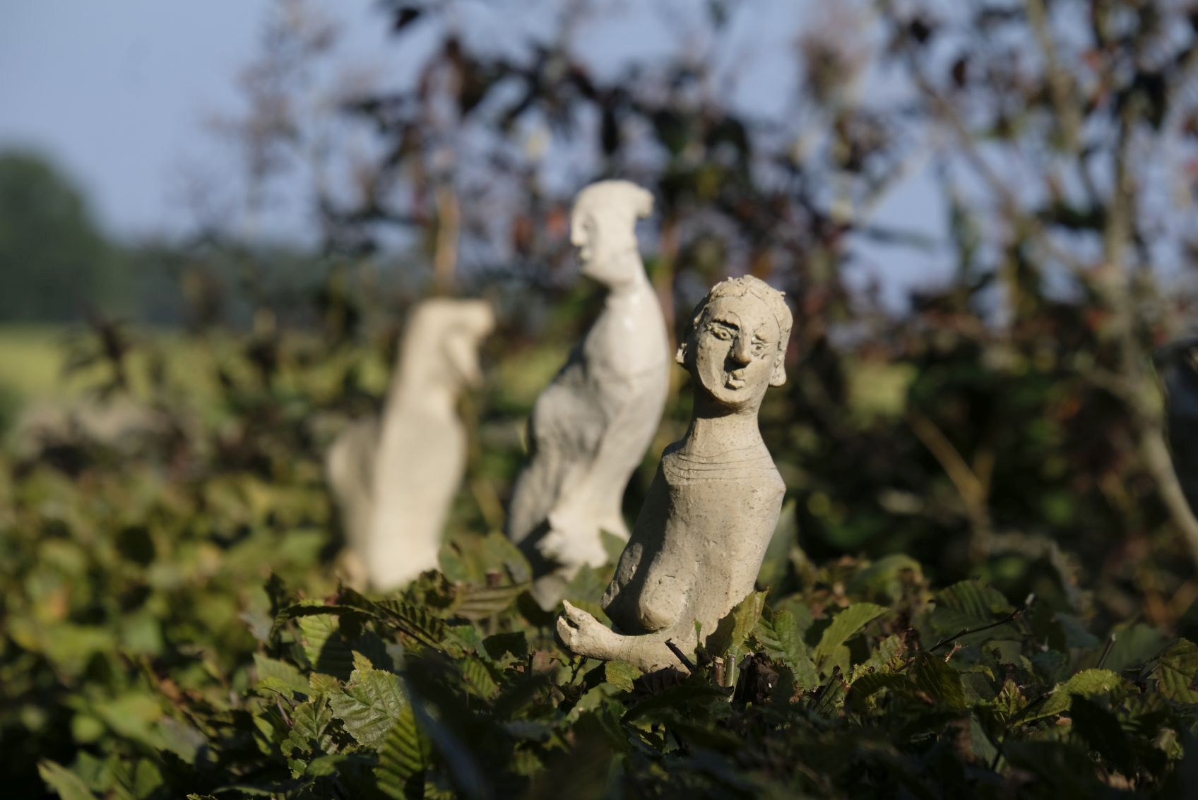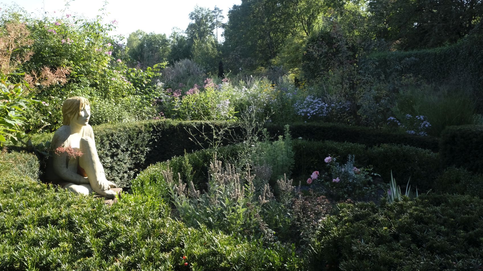 Noch einmal in die Stille des Waldteiches lauschen und an duftigen Staudenrabatten vorbeistreifen. Da glitzern mehrere Miscanthus auf, als wollten sie das Licht kämmen. Noch wie berauscht biegen wir auf einen geraden Weg ein, gesäumt von Buchenhecken. Kleine Skulpturen schweben, wie in Gedanken versunken, über dem Buchenlaub. Als wolle uns eine Figur zum Abschied zurufen: „Komm bald wieder!“ geht es zurück zur Gärtnerin Carola Rückert, die über diesen wunderbaren Gartenschatz wacht.