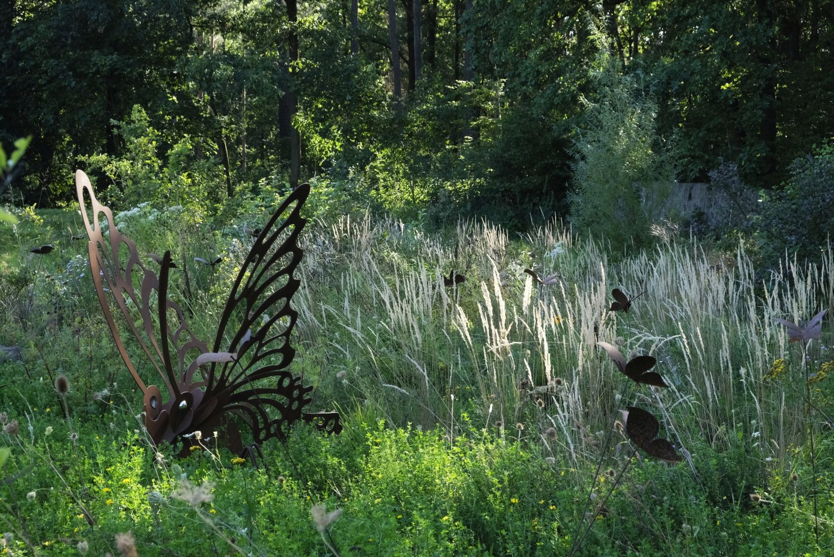 Eine flammende Skulptur zieht den Blick in ein Heckenlabyrinth. Zwischen jungen Bäumen sitzt sinnend eine Frau. Quer zur Gartenachse lädt ein Heckenweg zum Weitergehen ein, sich wie auf einer Reise zu einem neuen Gartenraum zu begeben. Eine Blühwiese breitet sich in der spätsommerlichen Sonne vor uns aus. Schmetterlinge schweben über der Wiese von einer Blüte zur nächsten. Lichtstrahlen, die durch hohe Laubbäume fallen, blitzen auf die bronzefarbenen Falterflügel in der Mitte.