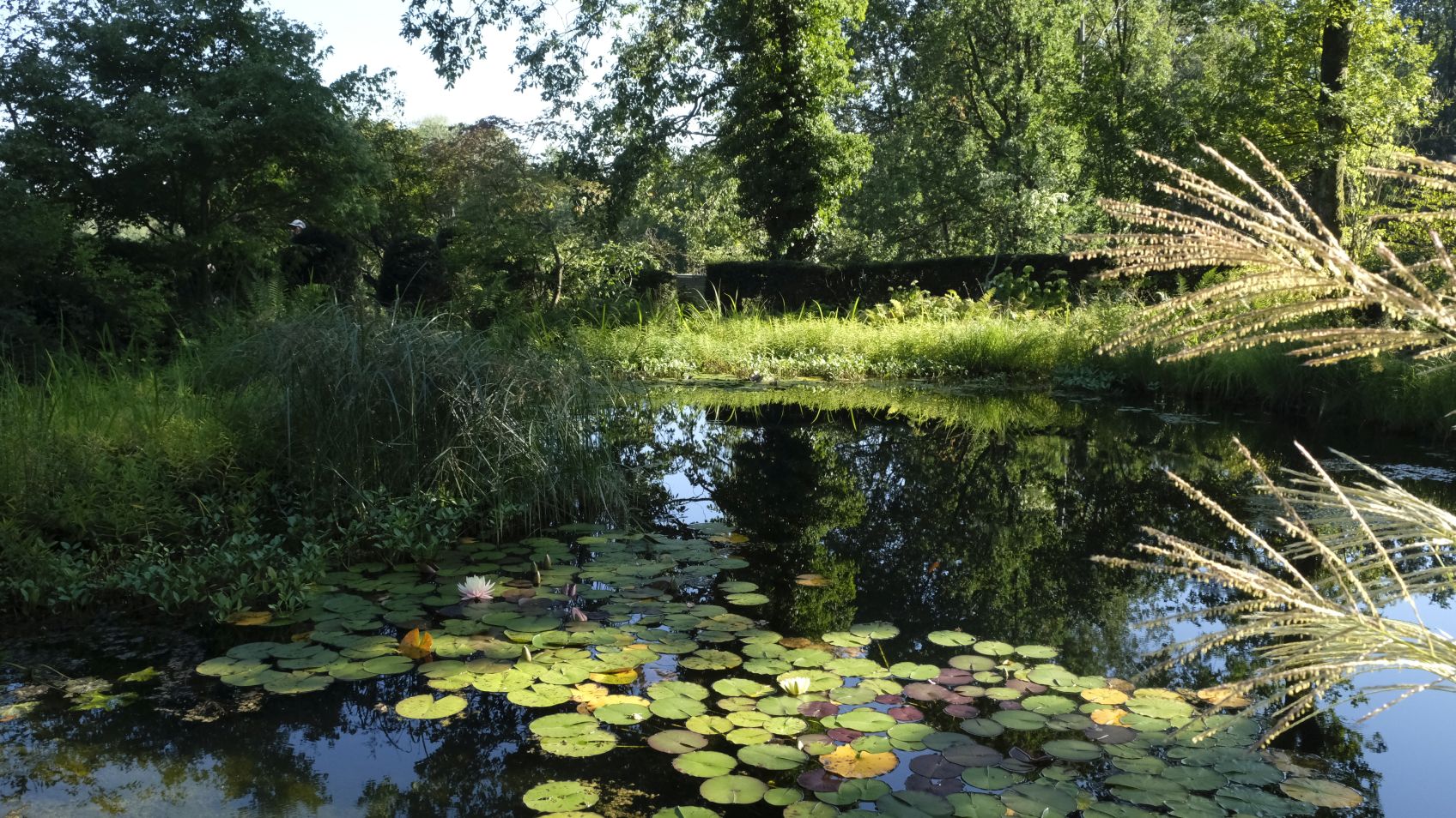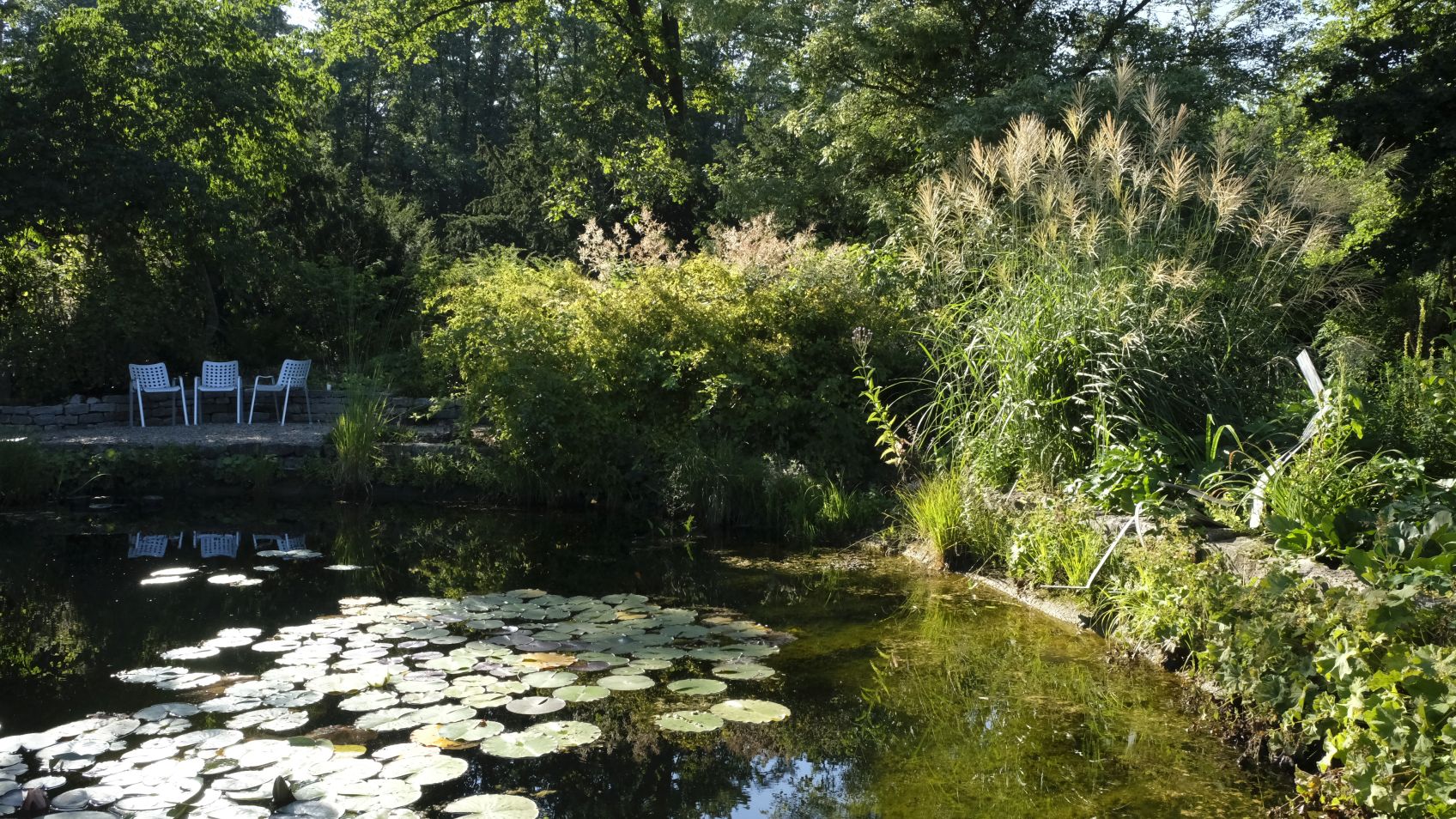 In der spätsommerlichen Wärme fällt der Blick auf einen kühlen Schattenweg am Waldsaum und verlockt, neue Landschaften zu entdecken. Zwischen rhythmisch angeordneten alten Eibensäulen blitzt eine Wasserlandschaft mit Gräsern, Teichrosen und Gehölzen auf und lädt ein, auf kühlen Sitzplätzen zu verweilen. Libellen schwirren über die ruhige Fläche des Waldteichs hin und her und nehmen uns in Gedanken mit.