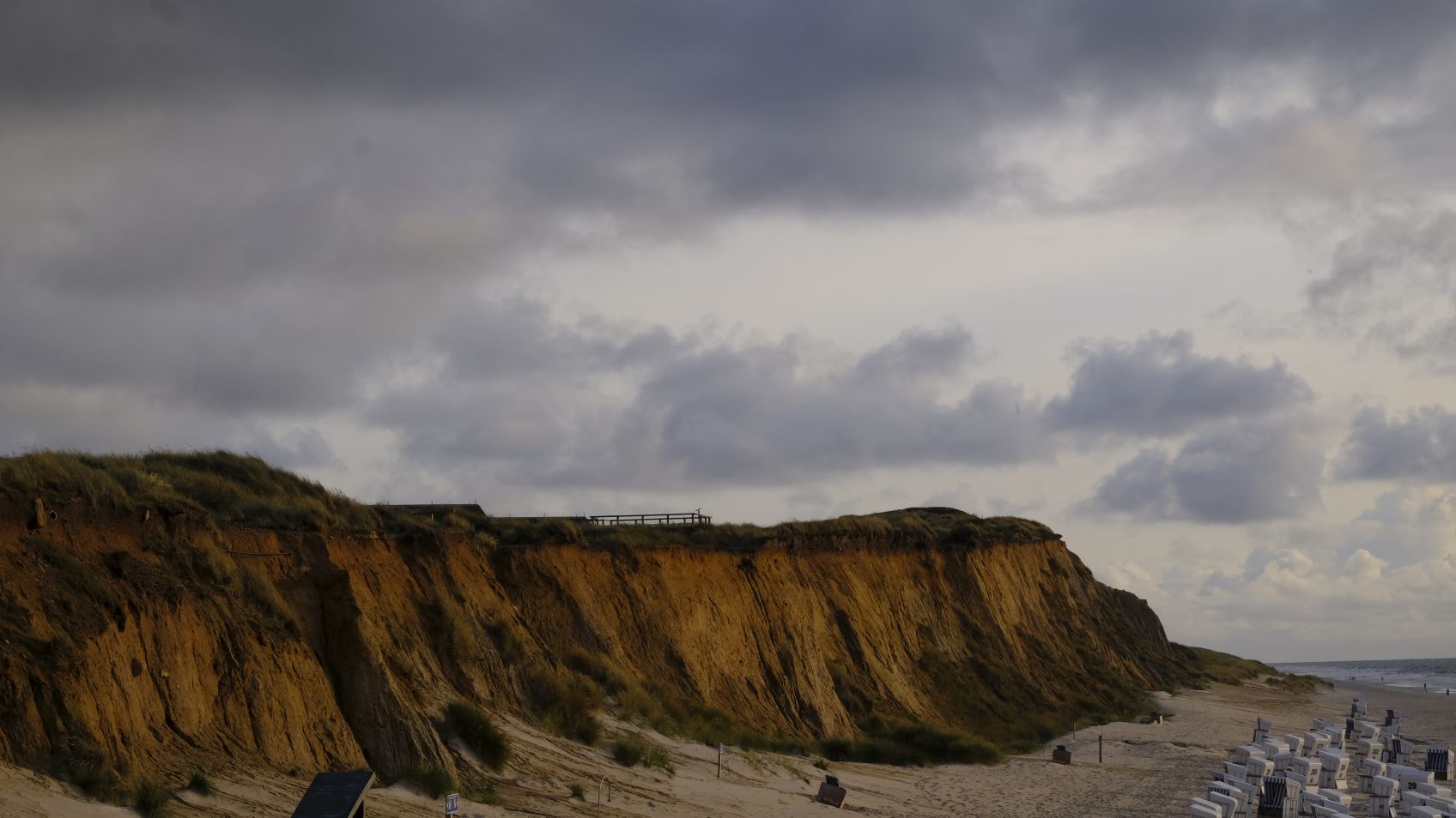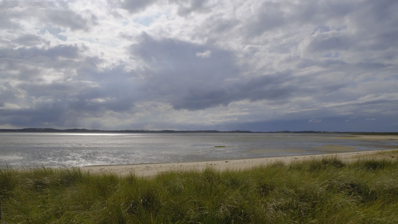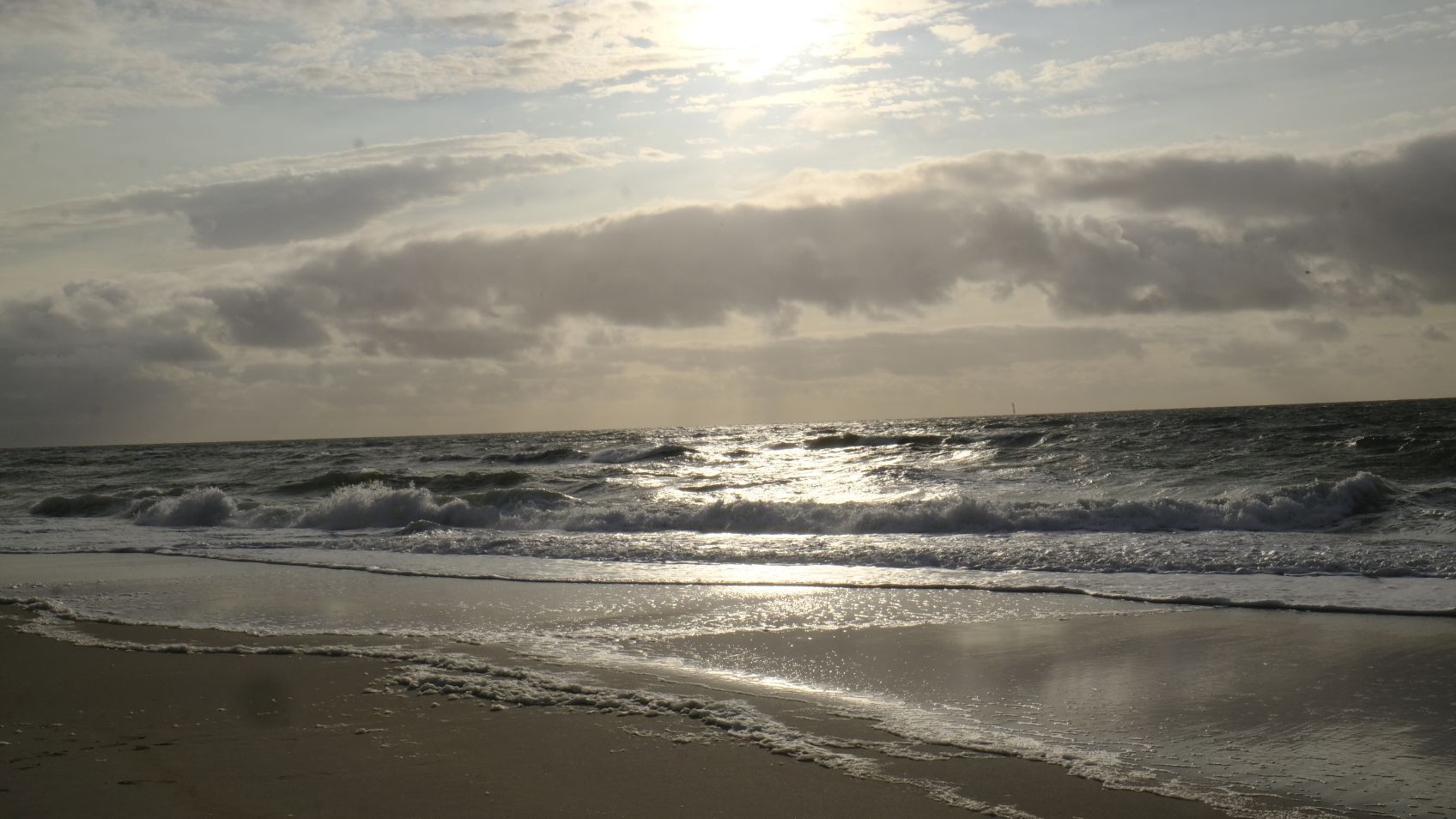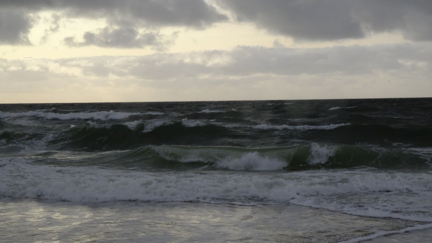 Dann, vor Kampen am „Roten Kliff“, nimmt uns die Abendstimmung ein. Über dem schier endlosen Meer, das sich wie ein glitzerndes Tischtuch ausbreitet, türmen sich Lichtlandschaften aus schwarzen und gleißend-hellen Wolken auf und wechseln die Stimmung von einer Minute zur nächsten. Gischt-schäumend stürzen die Wellenberge auf den Strand, rollen den Küstensaum empor, um dann in glitzernden Streifen wieder sanft zurückzufließen, dem nächsten Wellenkamm entgegen.
