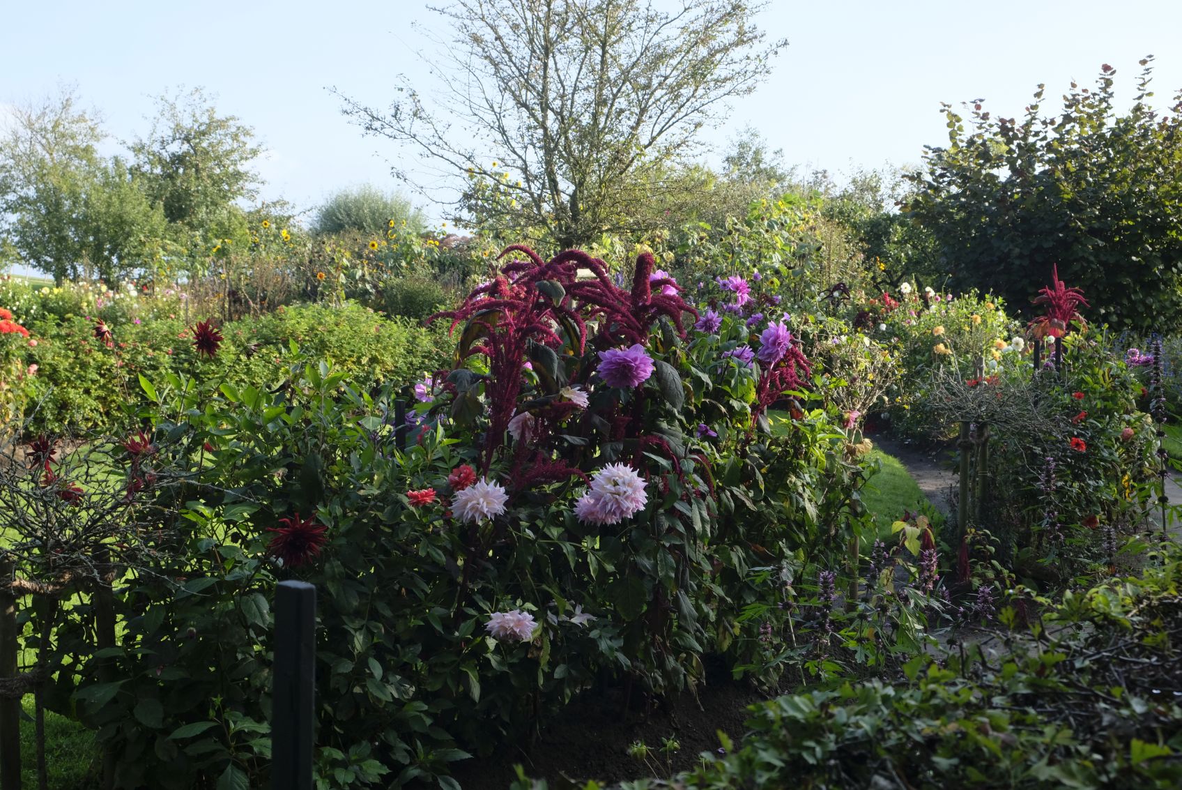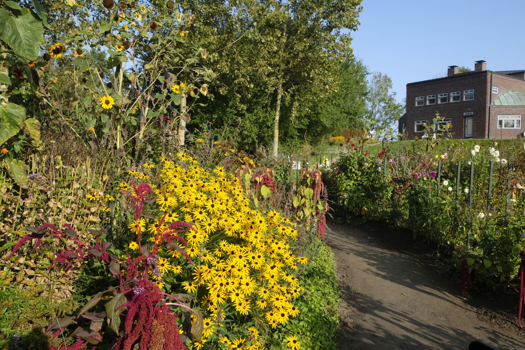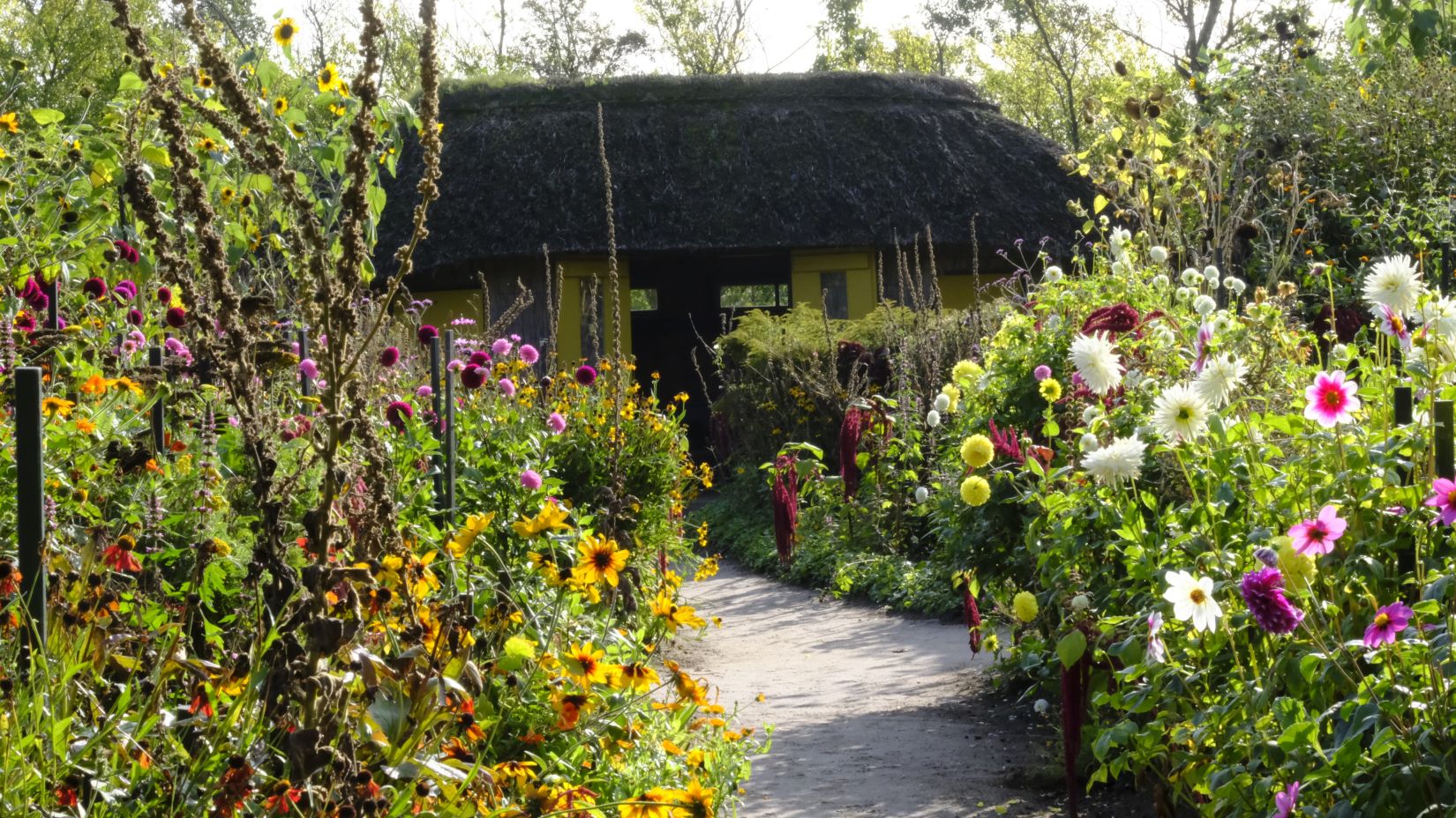 Was für eine Überraschung! Vom Eingang führt ein Weg durch hohes Gehölz und dann steht man unvermittelt vor diesem bunten, blüten-überschäumenden Garten – Dahlien leuchten in allen Farben und Formen, sonnenblumige Riesen stehen auf armdicken Säulen in einer Üppigkeit, dass man glaubt in durch einen Wald zu wandeln. Leuchtend blauer Eisenhut kontrastiert die flammenden Orangetöne. Unvermittelt leuchtet kobaltblau aus einem Salbeibeet unter einem Gehölz hervor. Drei fruchtbehangene Quittenbäume auf grüner Wiese wirken wie ein ruhiger Gegenpol zum überschäumenden Garten und leitet den Weg zur reetgedeckten Gartenhütte.