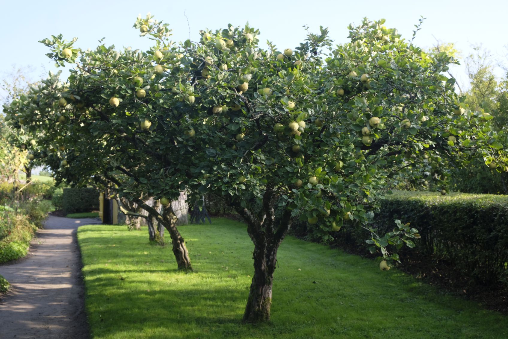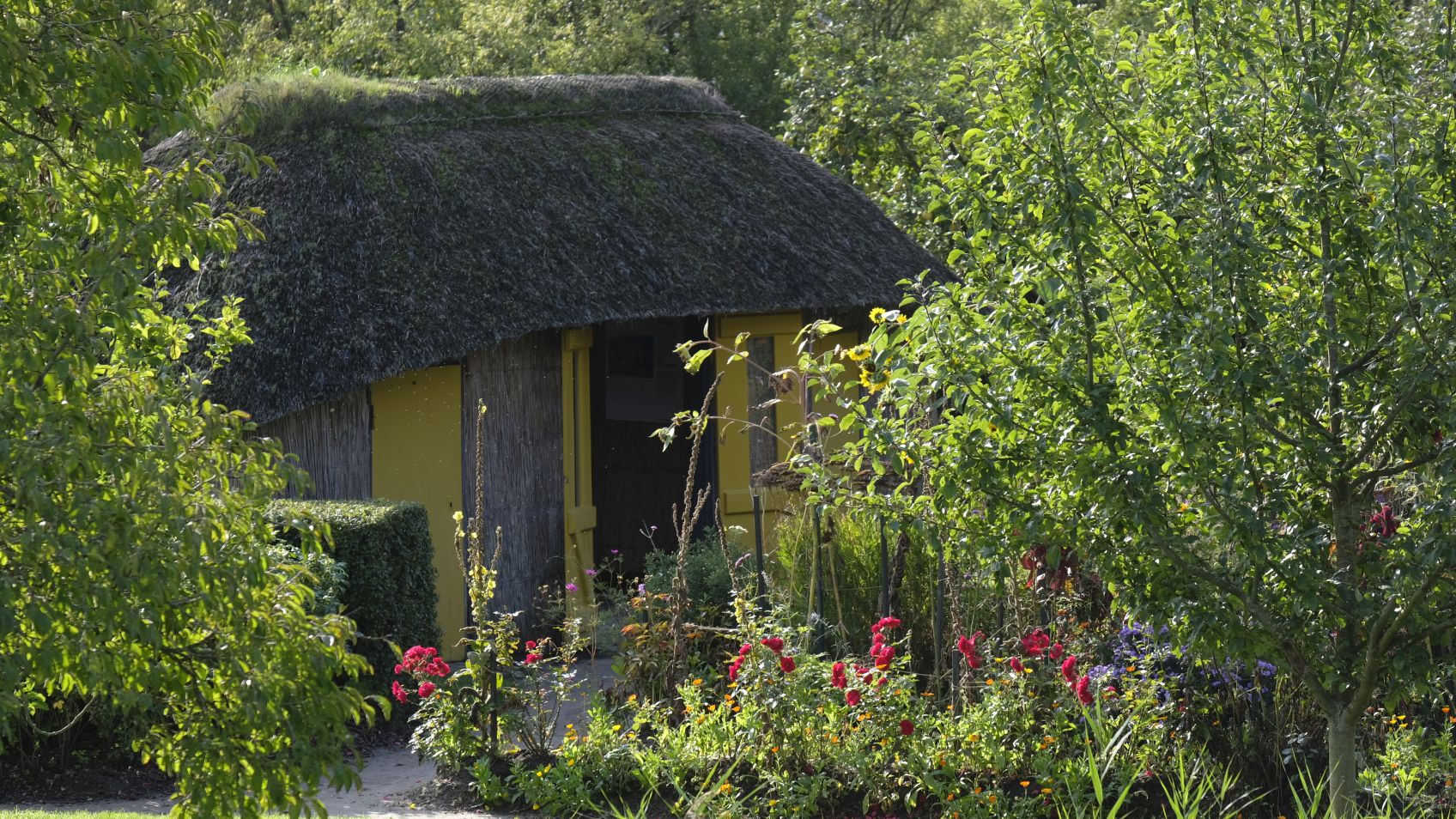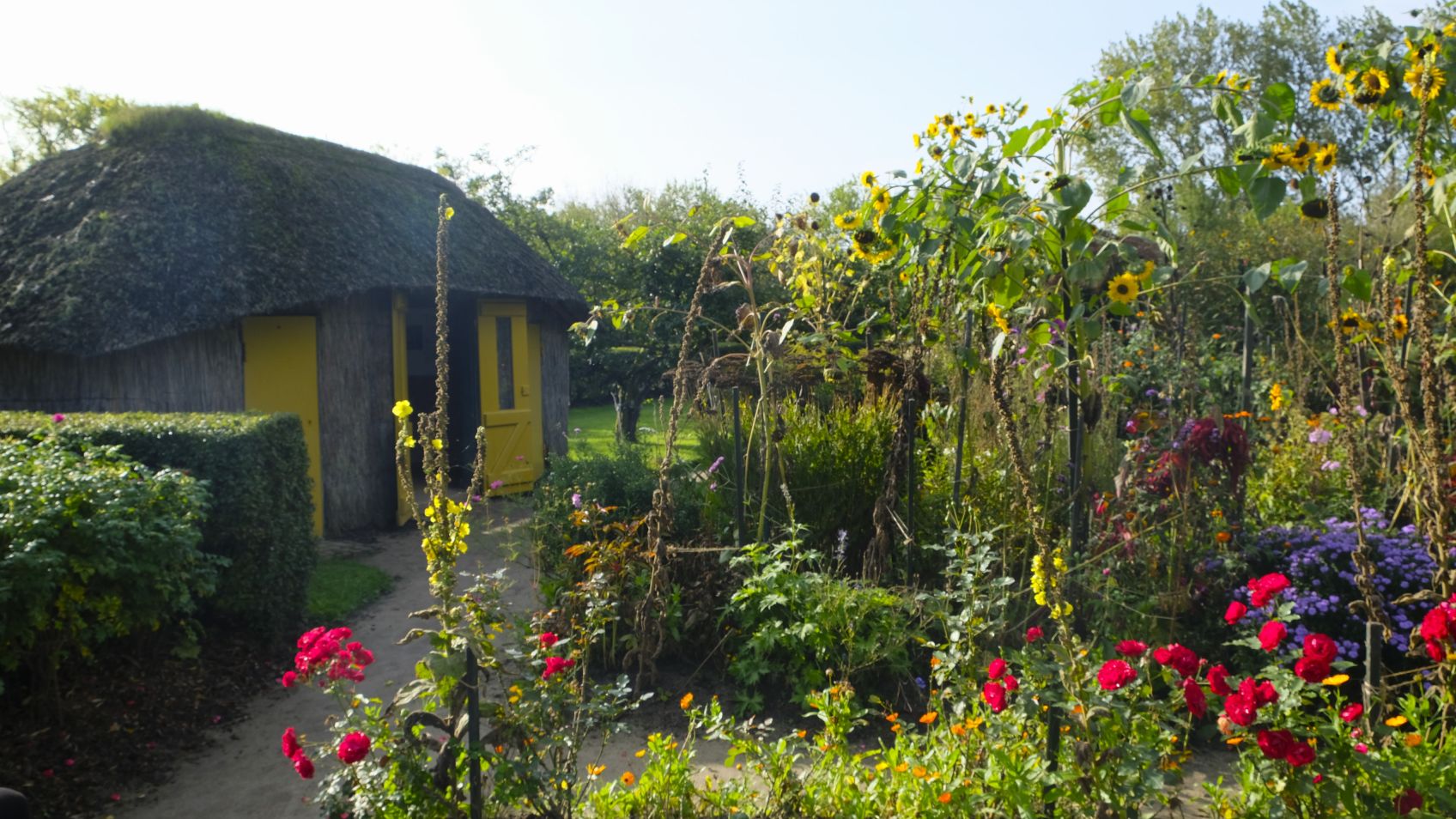 Was für eine Überraschung! Vom Eingang führt ein Weg durch hohes Gehölz und dann steht man unvermittelt vor diesem bunten, blüten-überschäumenden Garten – Dahlien leuchten in allen Farben und Formen, sonnenblumige Riesen stehen auf armdicken Säulen in einer Üppigkeit, dass man glaubt in durch einen Wald zu wandeln. Leuchtend blauer Eisenhut kontrastiert die flammenden Orangetöne. Unvermittelt leuchtet kobaltblau aus einem Salbeibeet unter einem Gehölz hervor. Drei fruchtbehangene Quittenbäume auf grüner Wiese wirken wie ein ruhiger Gegenpol zum überschäumenden Garten und leitet den Weg zur reetgedeckten Gartenhütte.