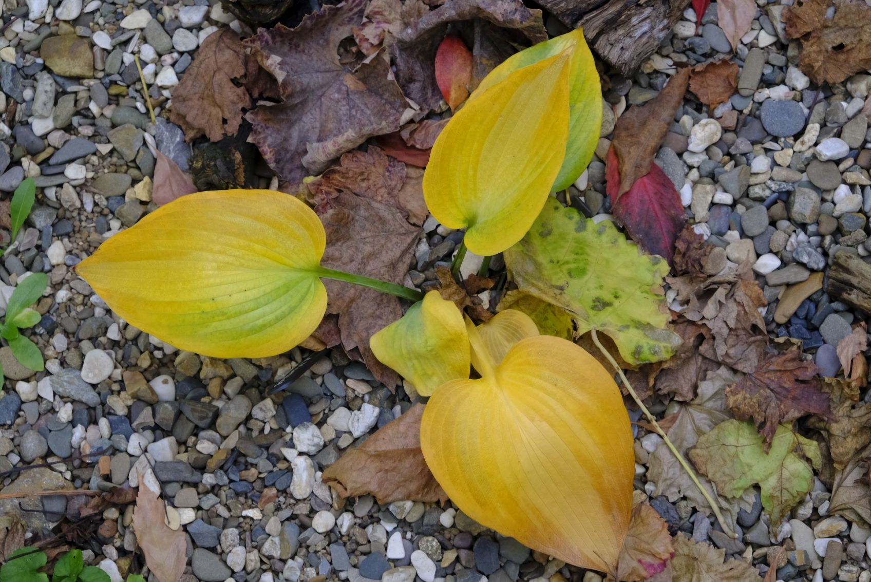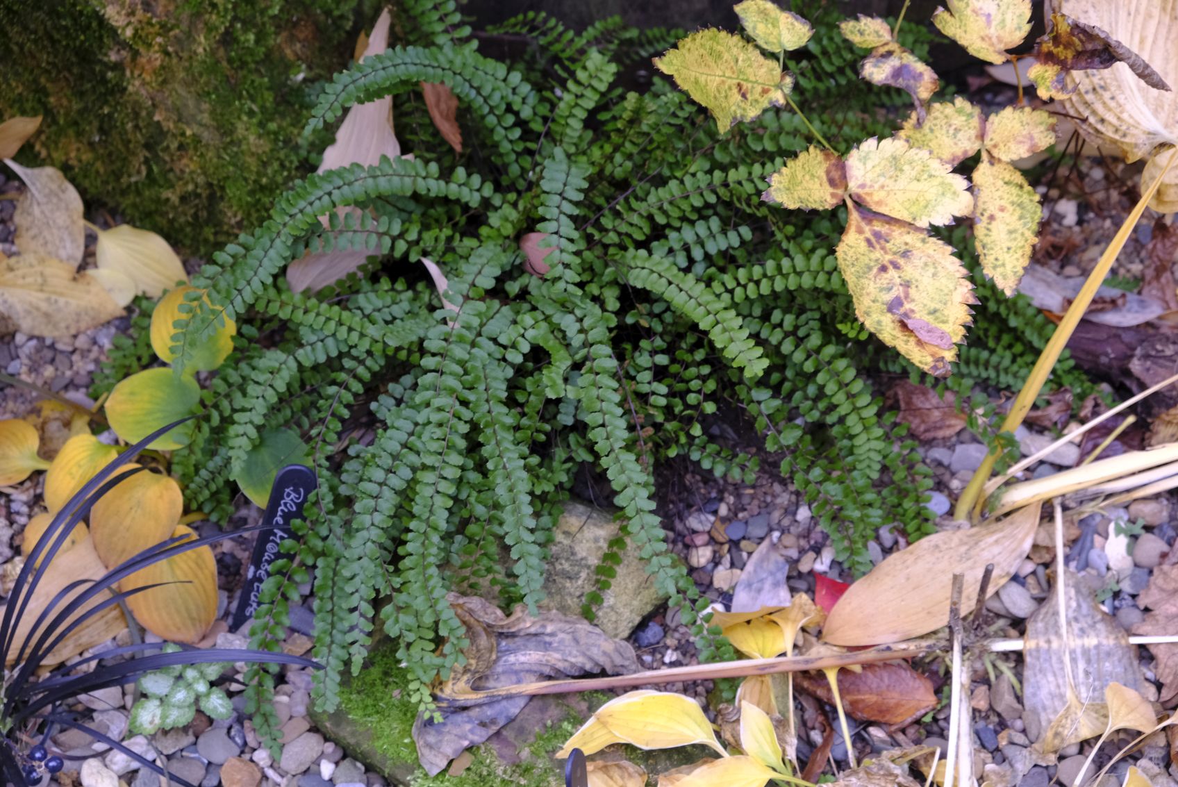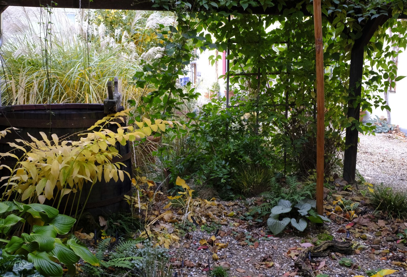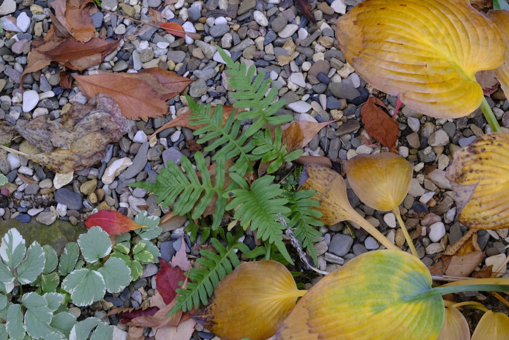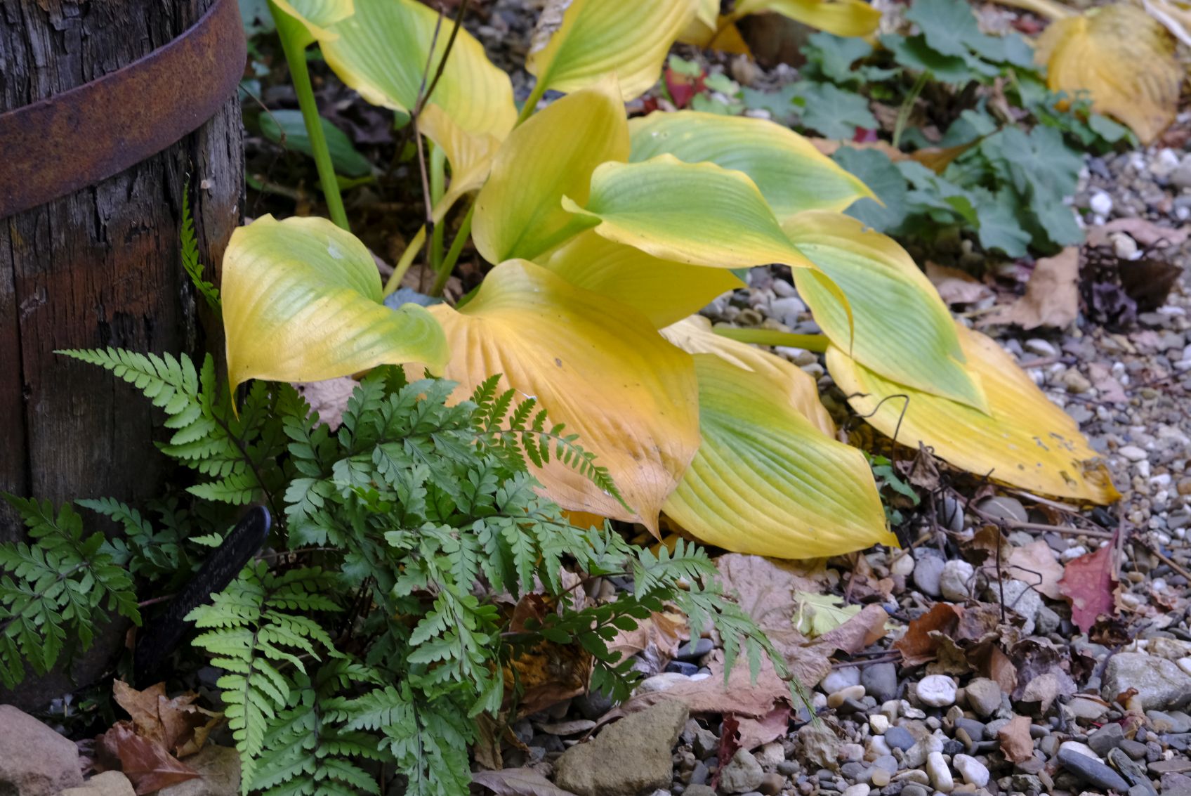 Im Schattenbeet zeigen sich die Farne ungerührt in frischem Grün im Gegensatz zu den Hostas, die sich im goldgelben Gewand präsentieren.