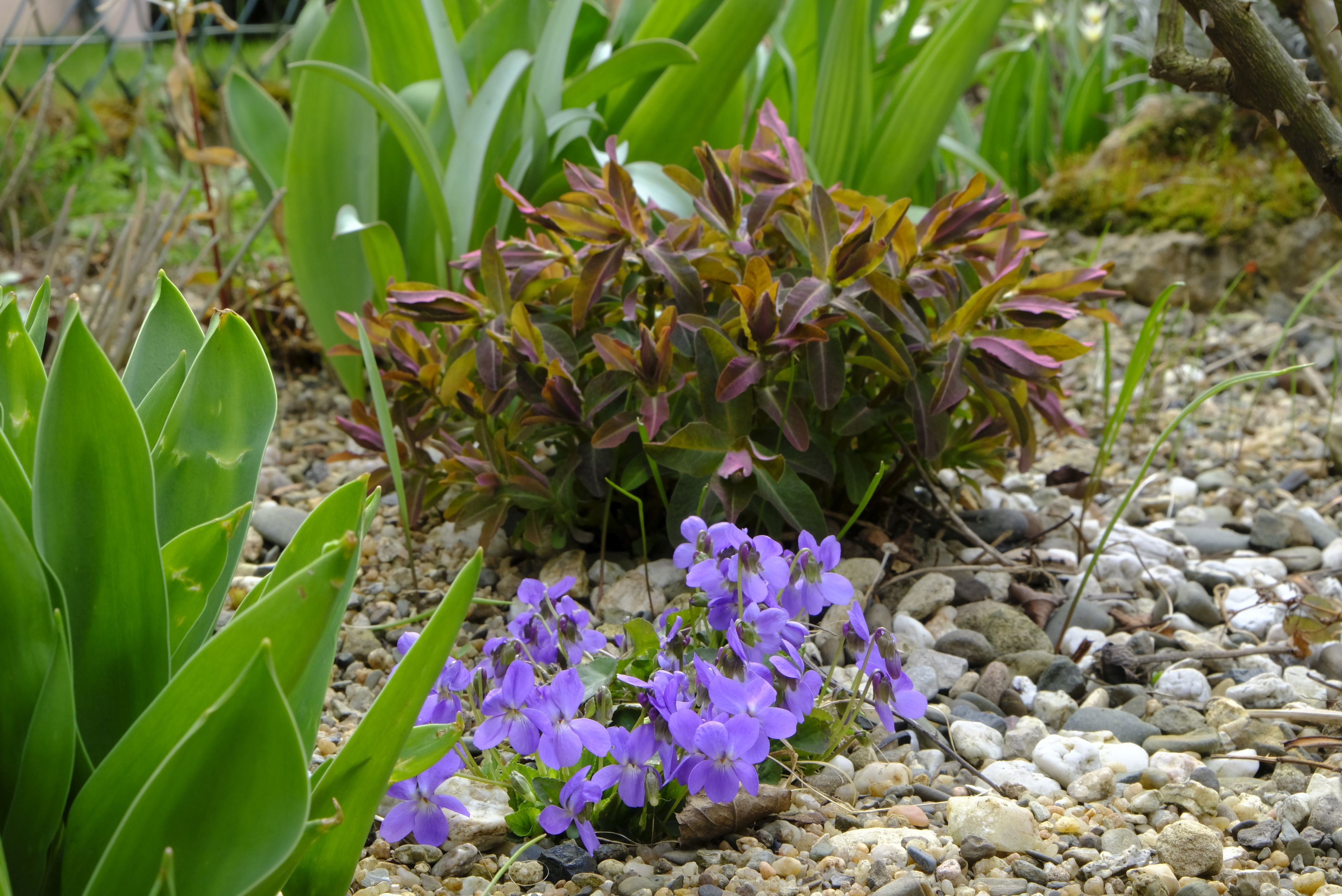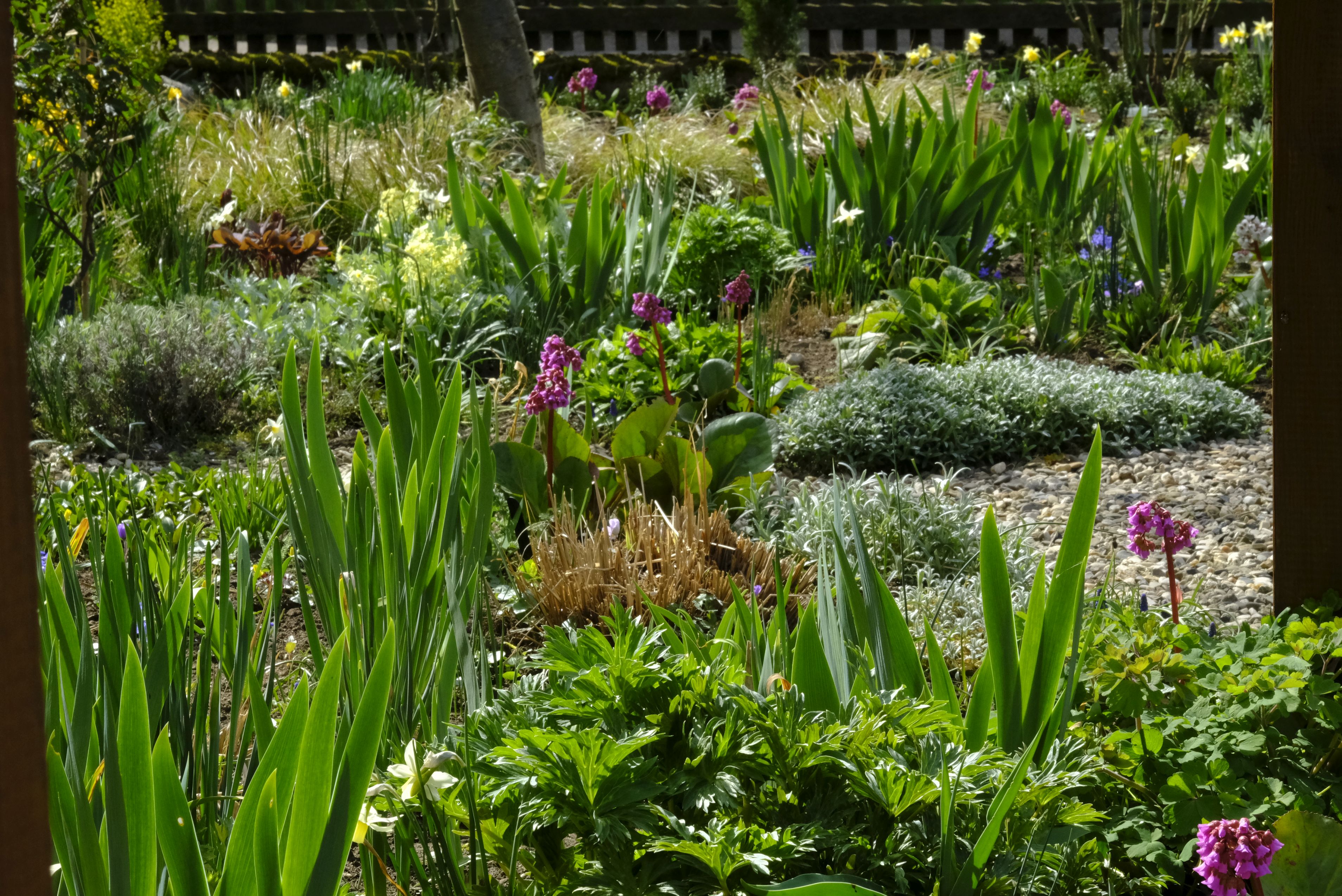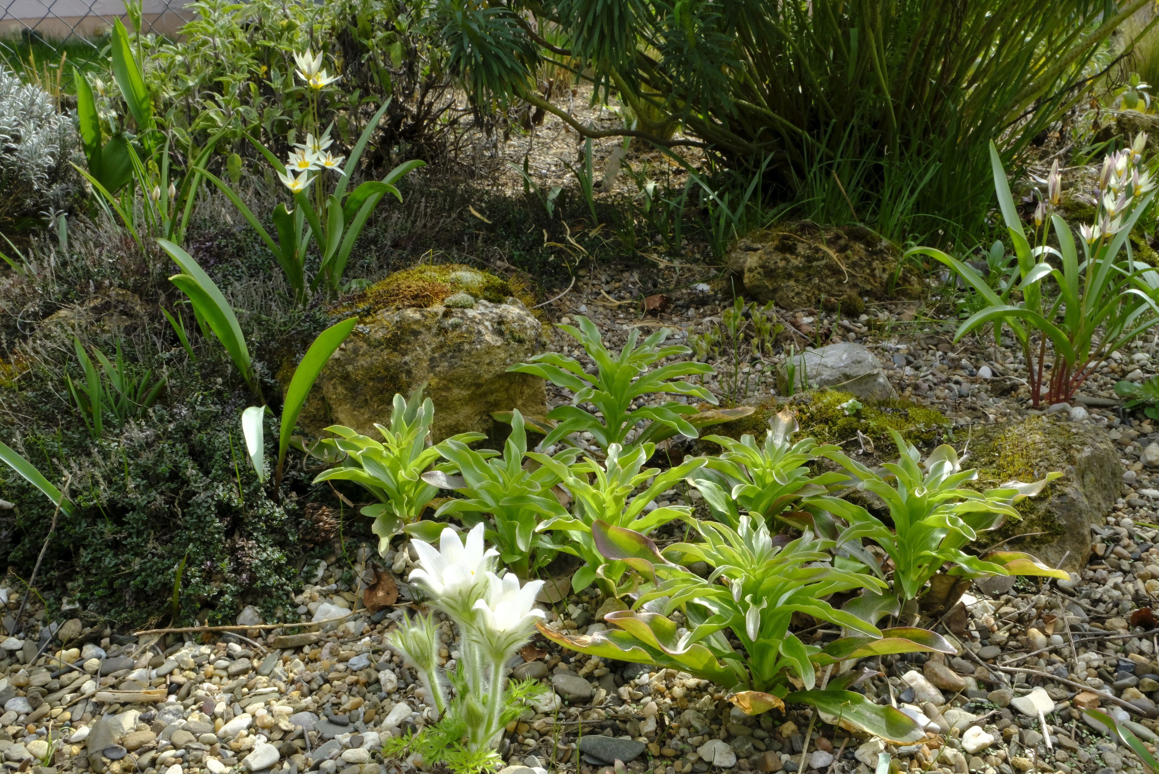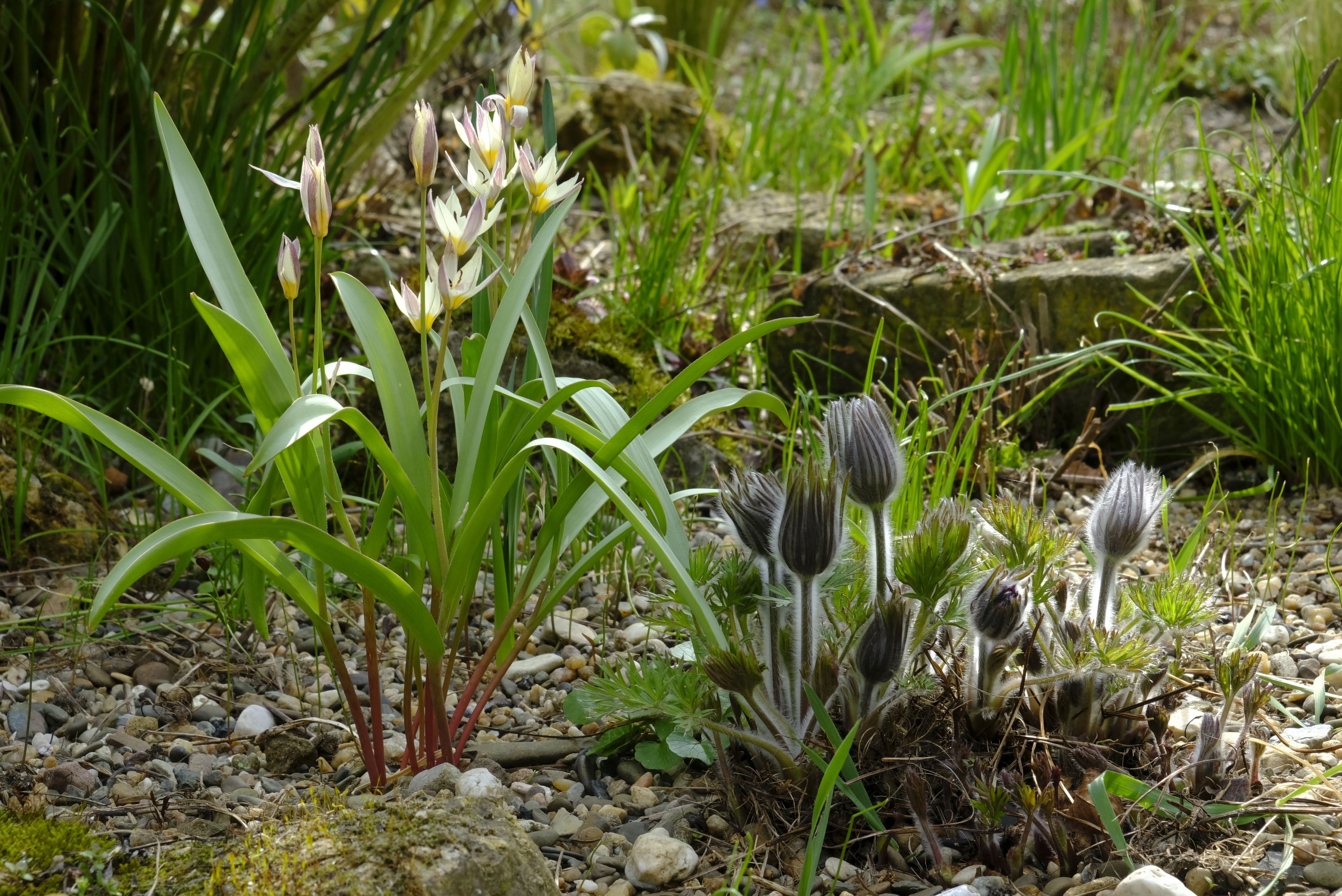 Auch in der Einfahrt im Kies macht sich der Frühling bemerkbar. Euphorbien, Küchenschellen, Wildtulpen und im Schattenbeet zeigen sich schon erste Spitzen des Salomonsiegels und der Hostas.