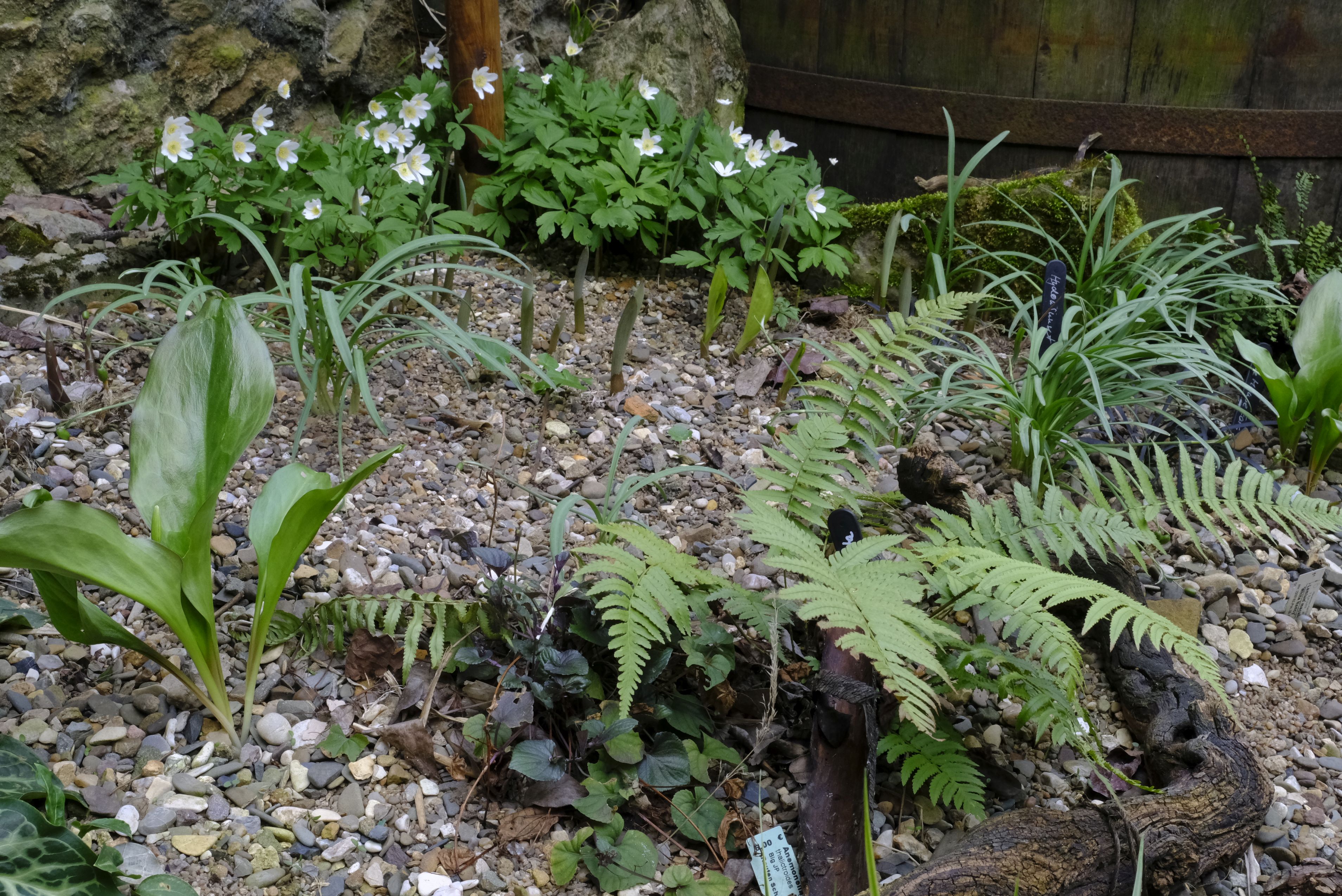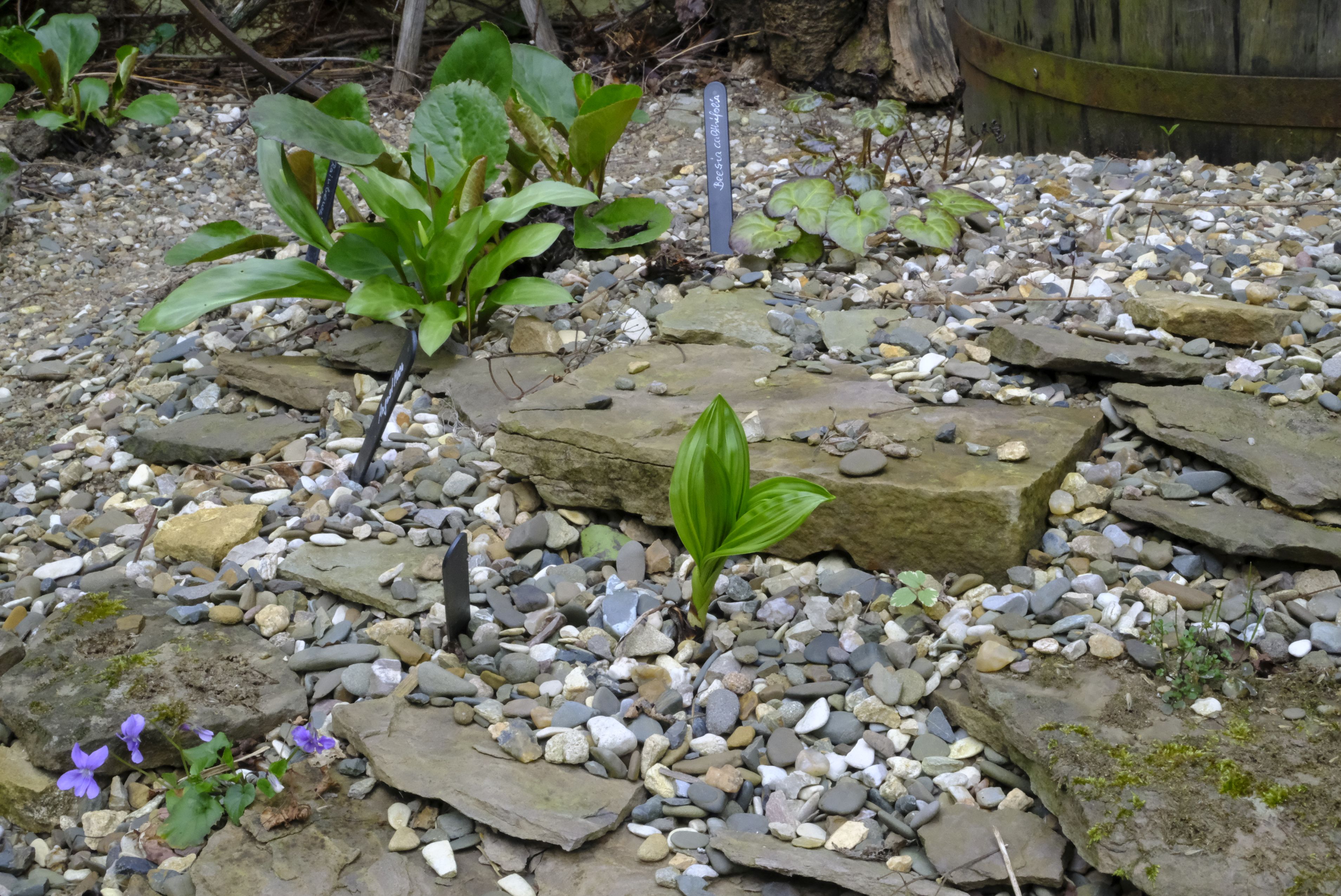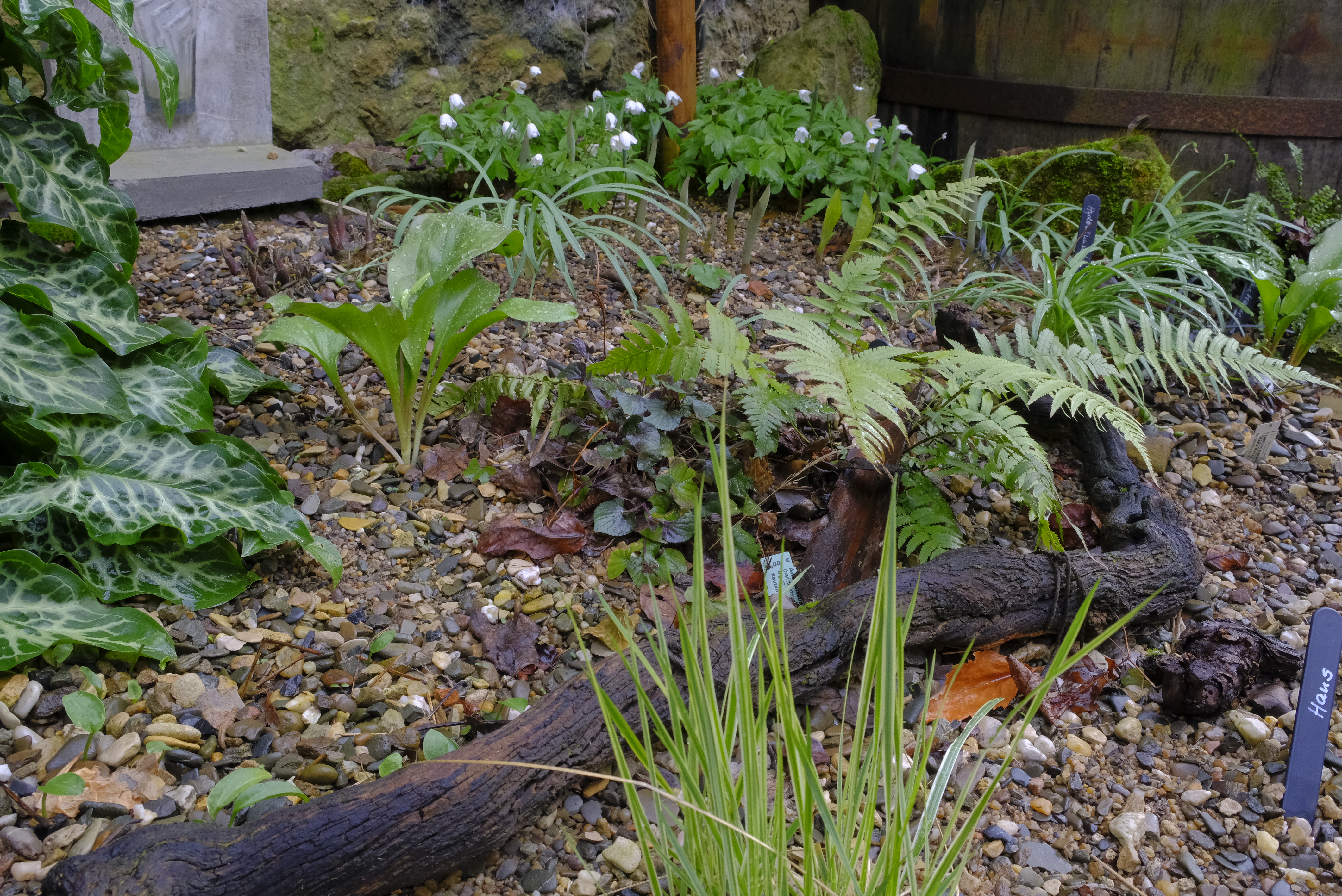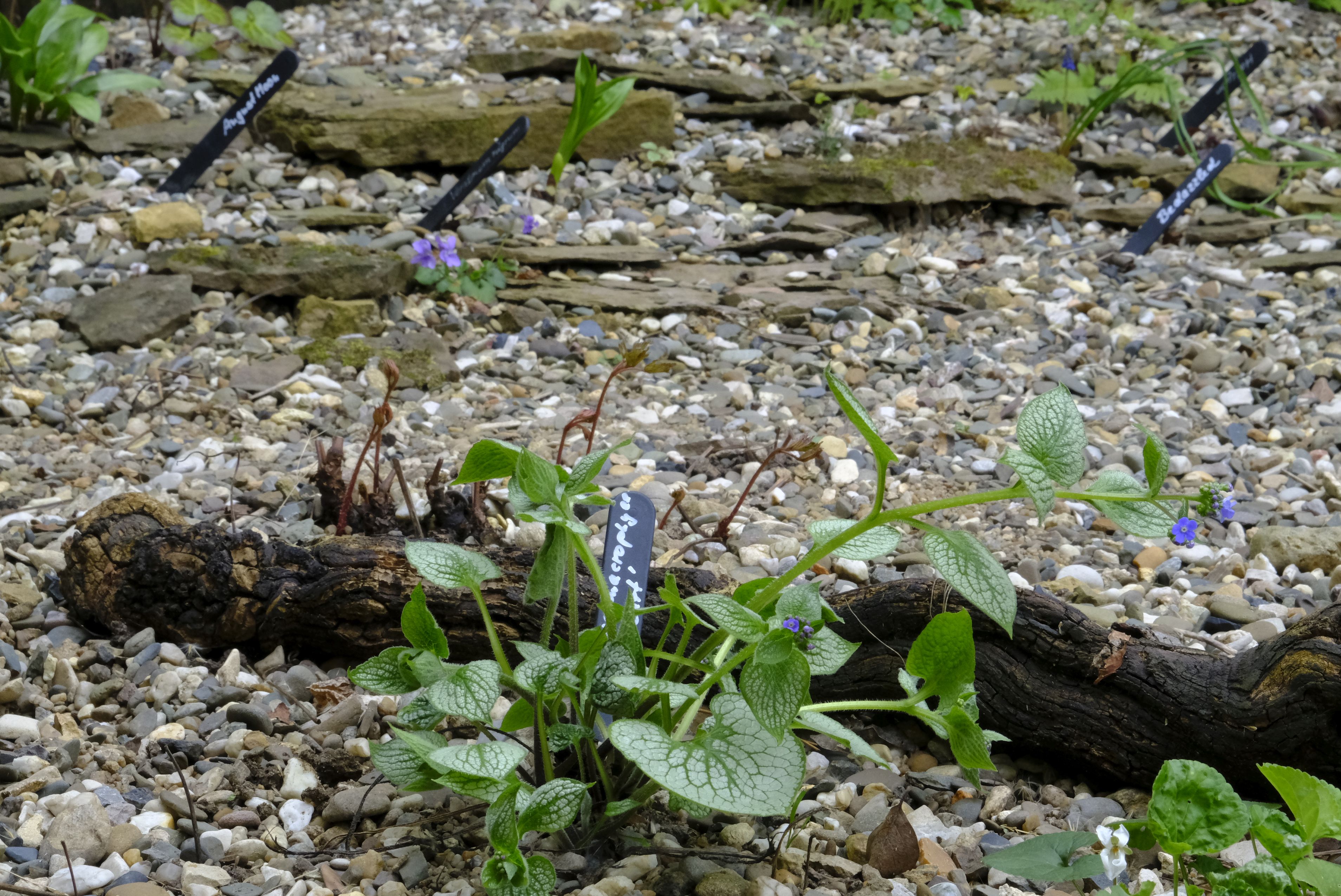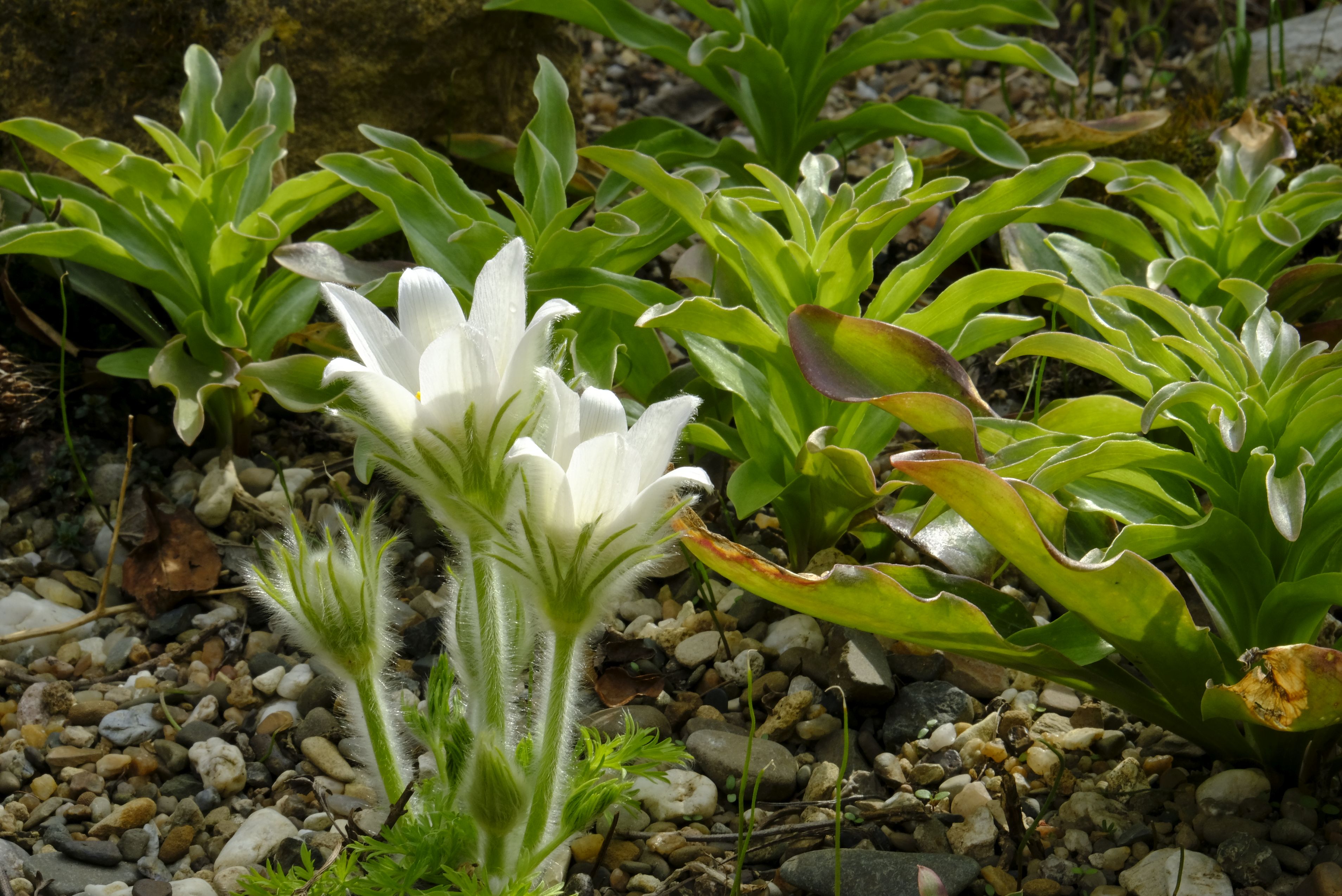 Auch in der Einfahrt im Kies macht sich der Frühling bemerkbar. Euphorbien, Küchenschellen, Wildtulpen und im Schattenbeet zeigen sich schon erste Spitzen des Salomonsiegels und der Hostas.