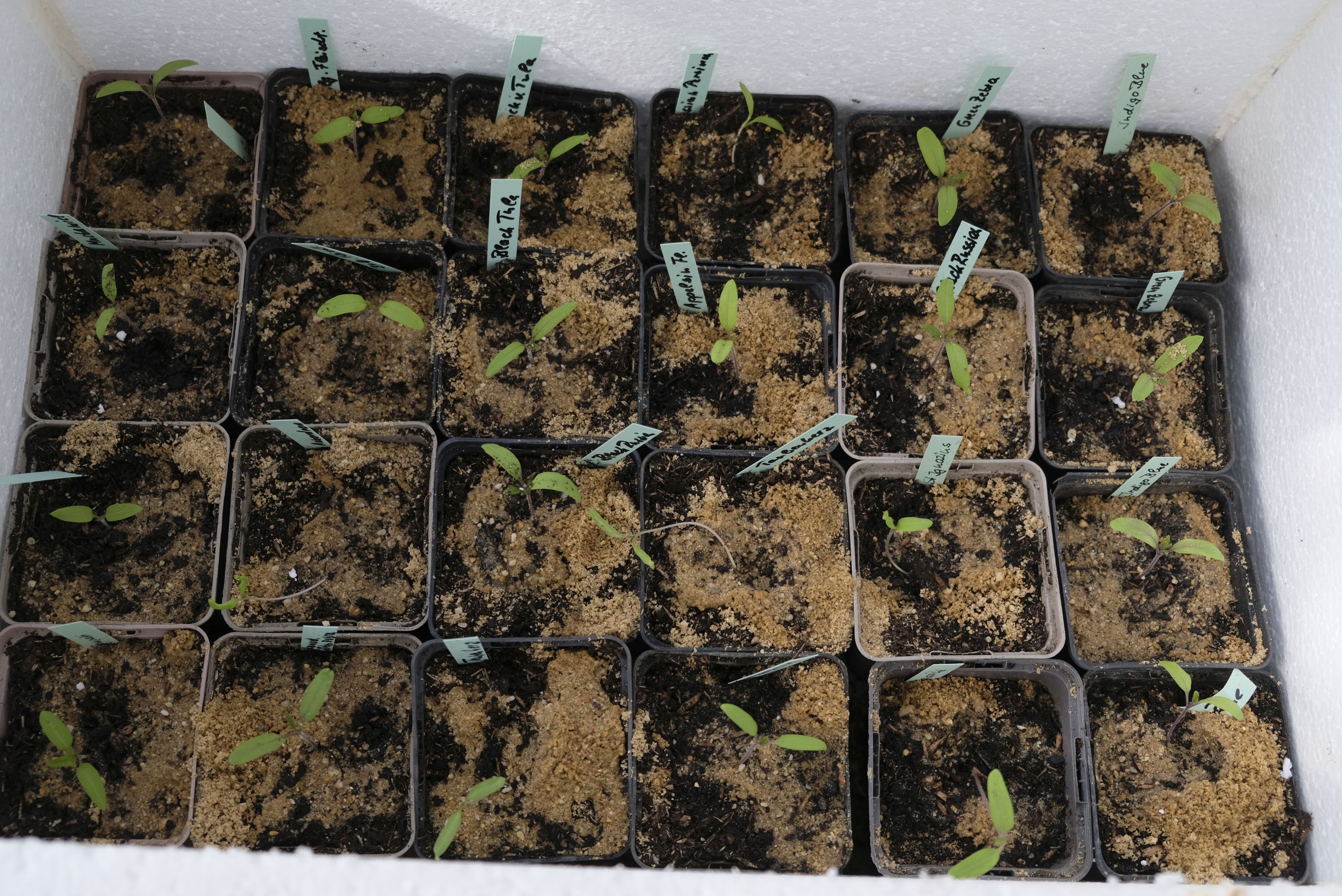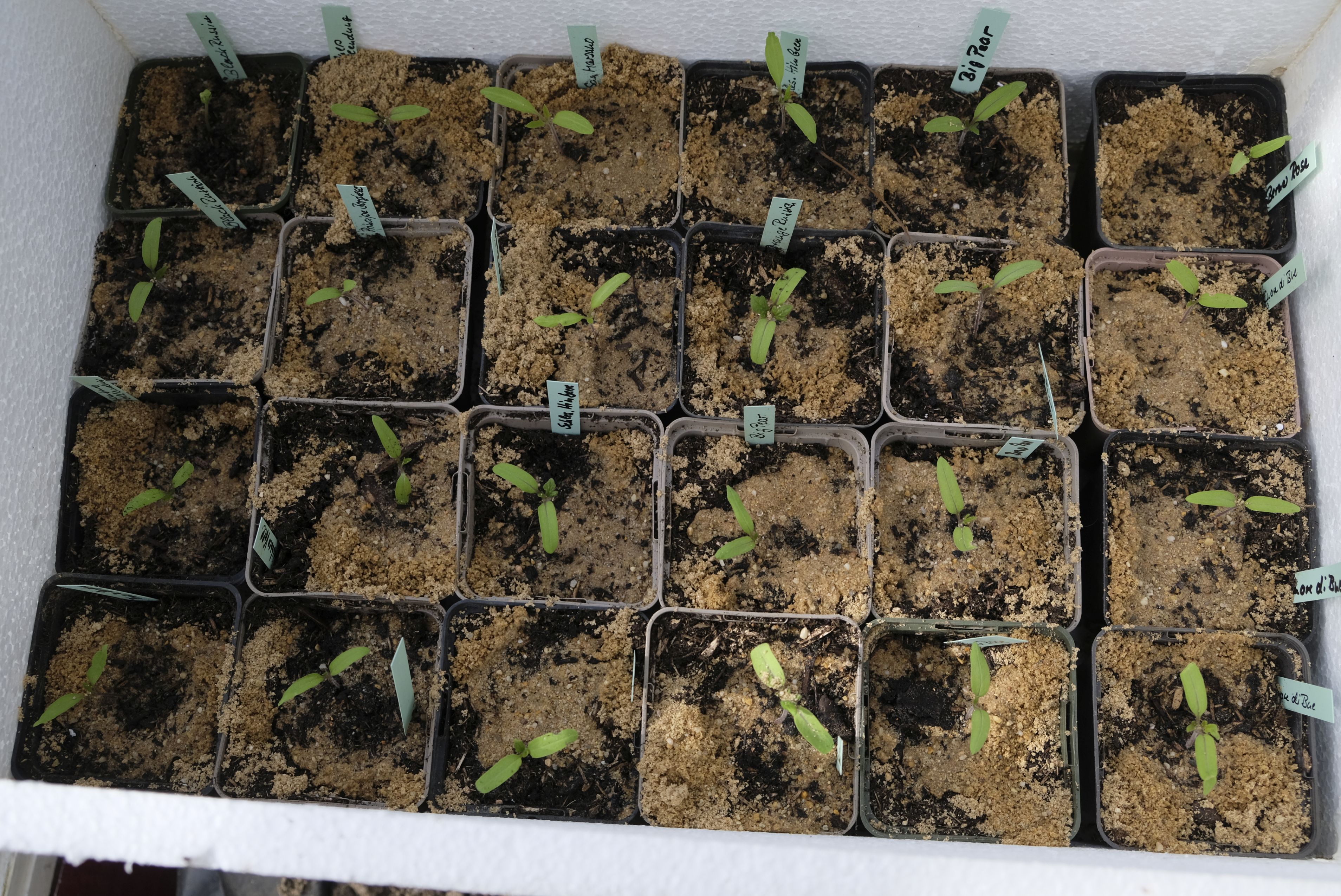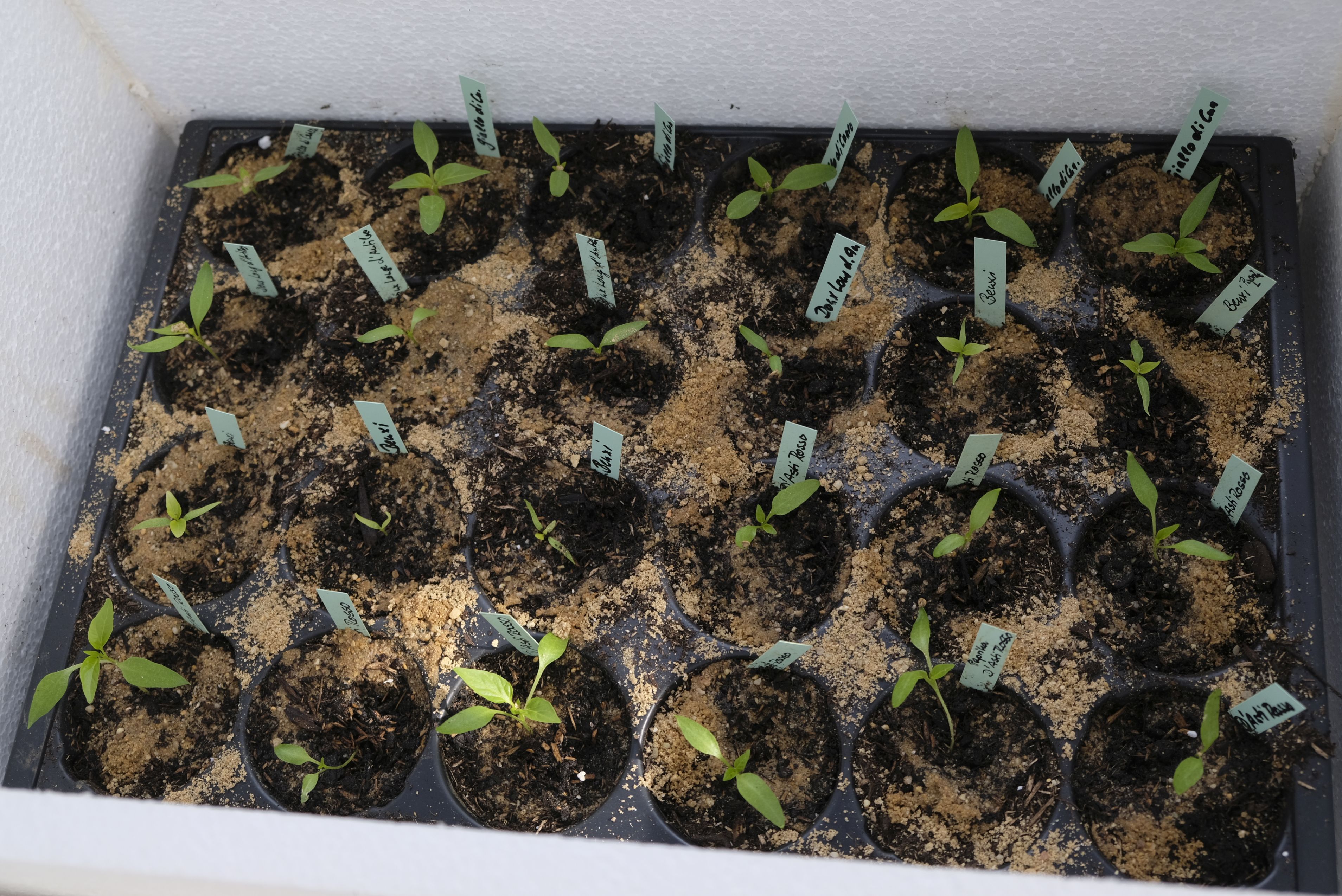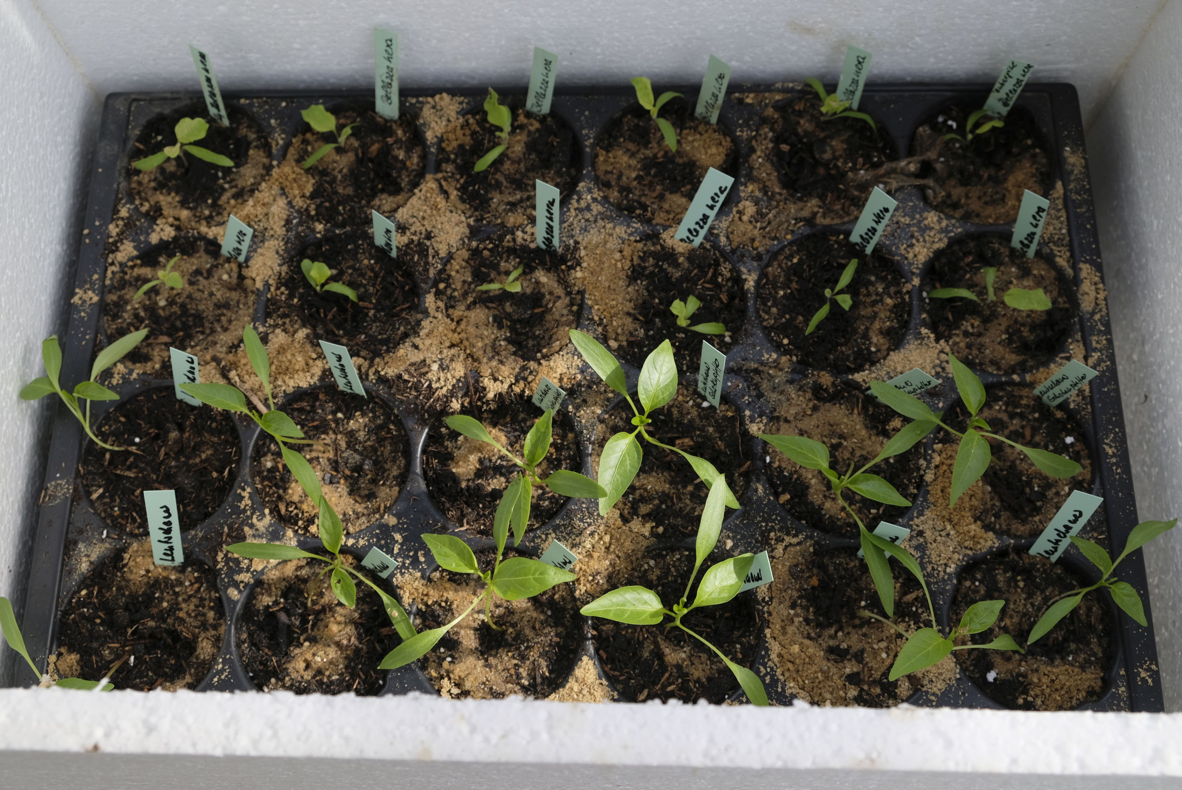 Die vorgezogenen Paprika, Tomaten und Auberginen durften schon ins Kalthaus, hier allerdings in Styroporkisten, die abends vorläufig noch zugedeckt werden. Morgens wird das Kalthaus durch die Morgensonne erwärmt, die fördert das gute Gedeihen der Sämlinge.