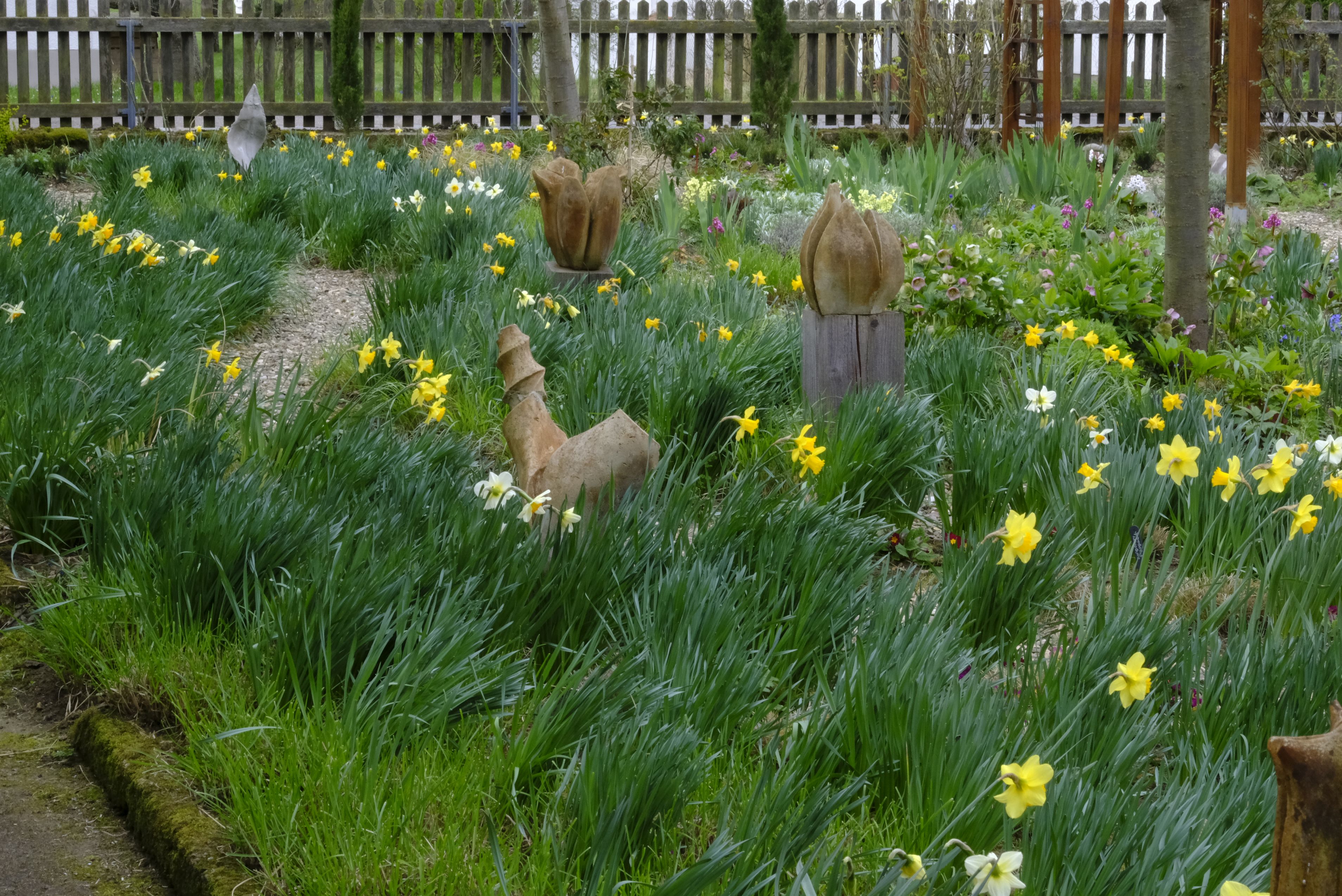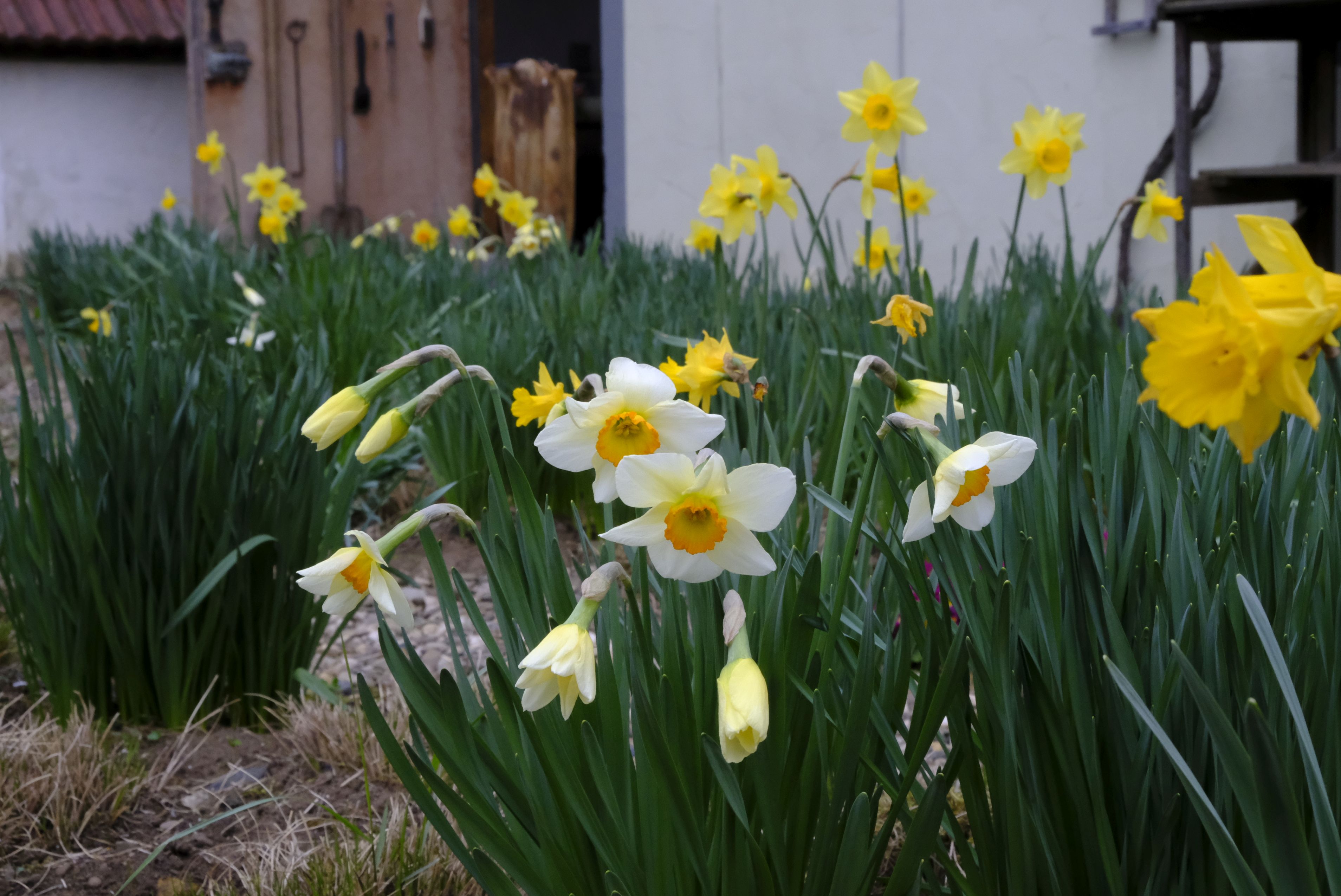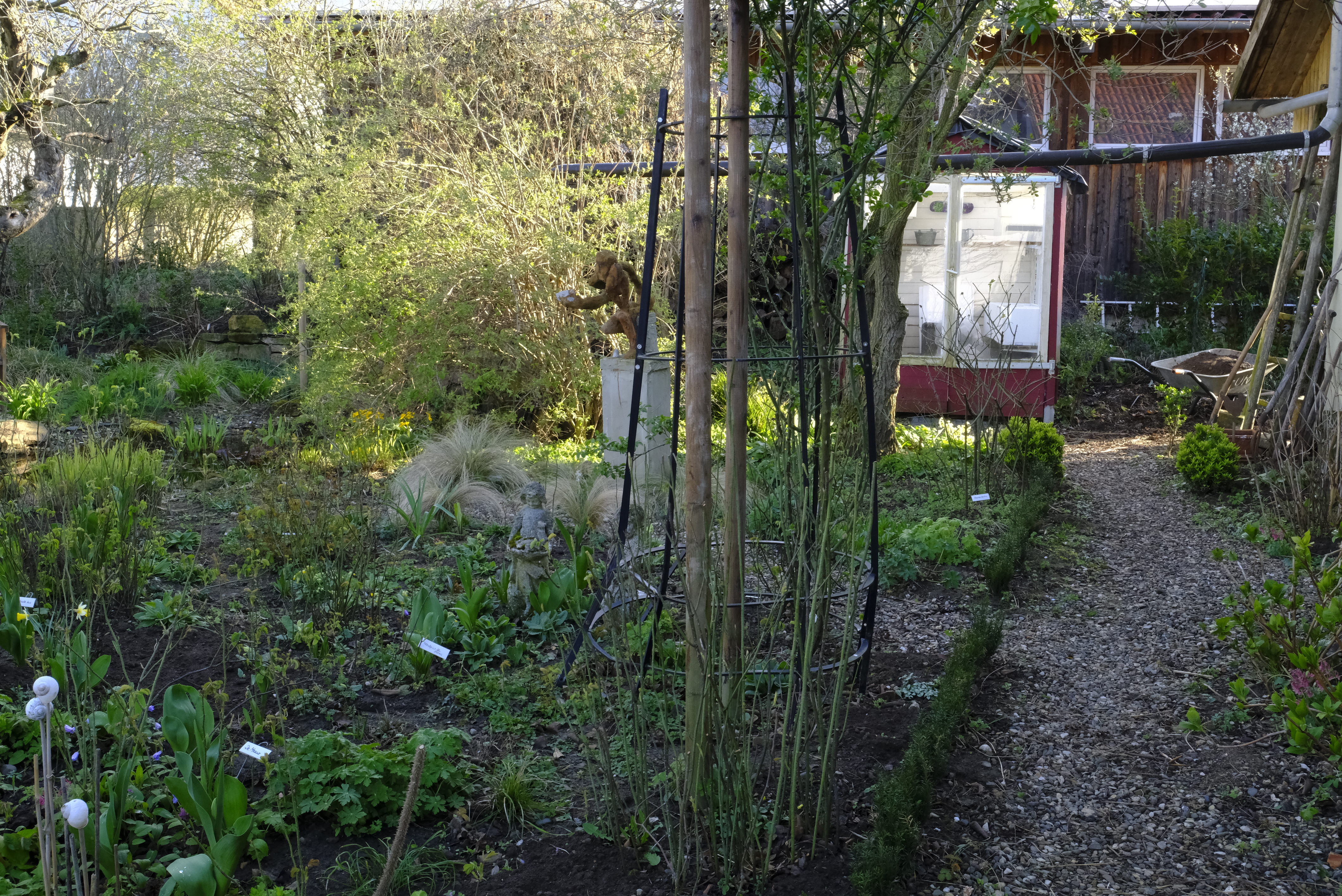 Der März hat wie immer alles vereint: Sonne, Regen, Wind und Temperaturschwankungen. Die Vegetation ist weit vorangeschritten! Der Pfirsich blüht! Die ersten Osterglocken sind fast verblüht, aber jetzt kommen bereits die spätere Sorten. Die Bergenien haben sich nach zwei, drei Jahren erholt, wir hatten sie fast abgeschrieben. Mit einer guten Kompostgabe und reichlich Wasser zeigen sie sich mit hübscher Blüte.